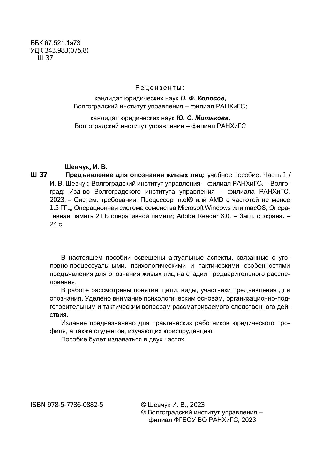 В настоящем пособии освещены актуальные аспекты, связанные с уго-ловно-процессуальными, психологическими и тактическими особенностями предъявления для опознания живых лиц на стадии предварительного рассле-дования. В работе рассмотрены понятие, цели, виды, участники предъявления для опознания. Уделено внимание психологическим основам, организационно-под-готовительным и тактическим вопросам рассматриваемого следственного дей-ствия. Издание предназначено для практических работников юридического про-филя, а также студентов, изучающих юриспруденцию. Пособие будет издаваться в двух частях.