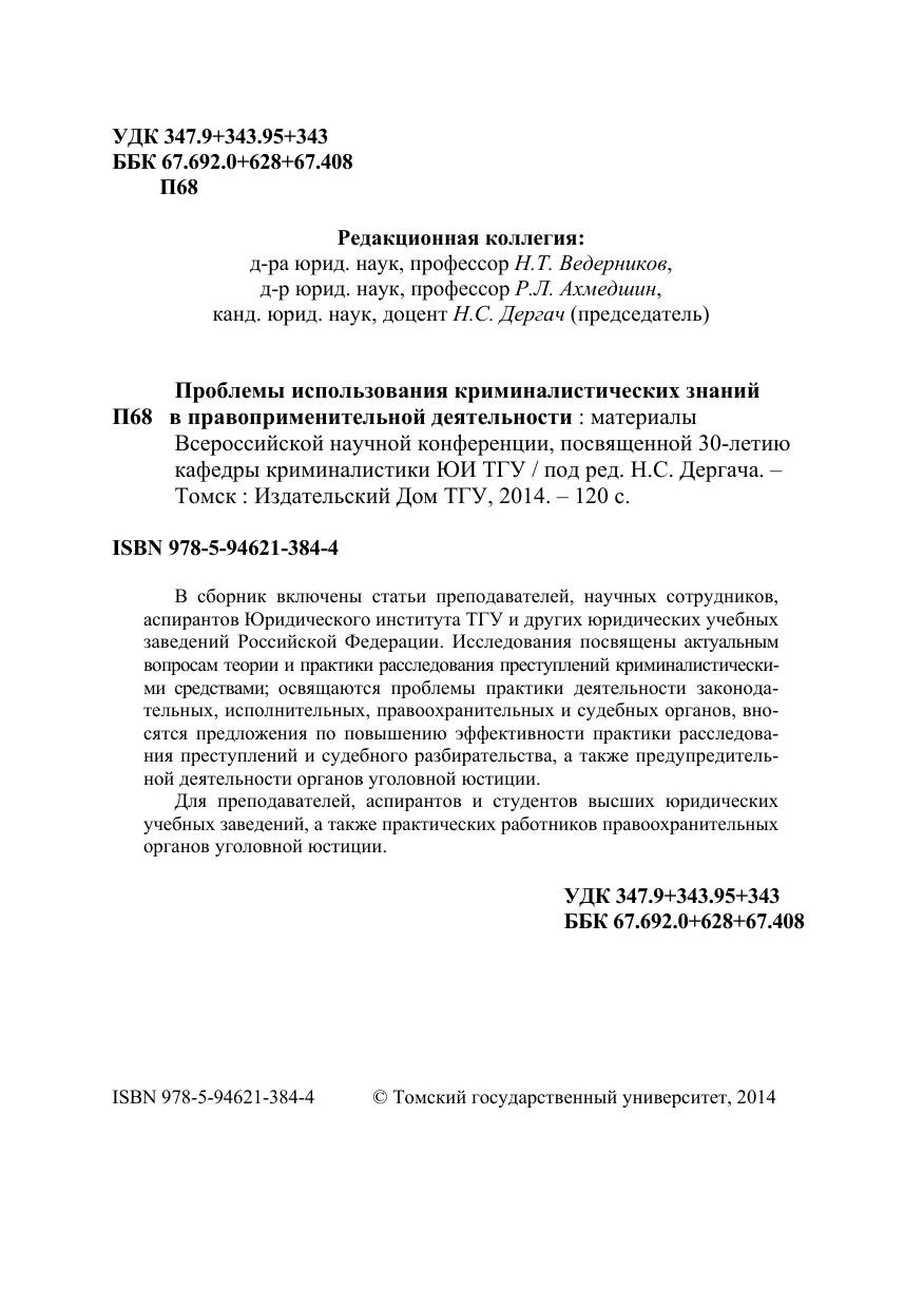 Проблемы использования криминалистических знаний в правоприменительной деятельности : материалы Всероссийской научной конференции, посвященной 30-летию кафедры криминалистики ЮИ ТГУ