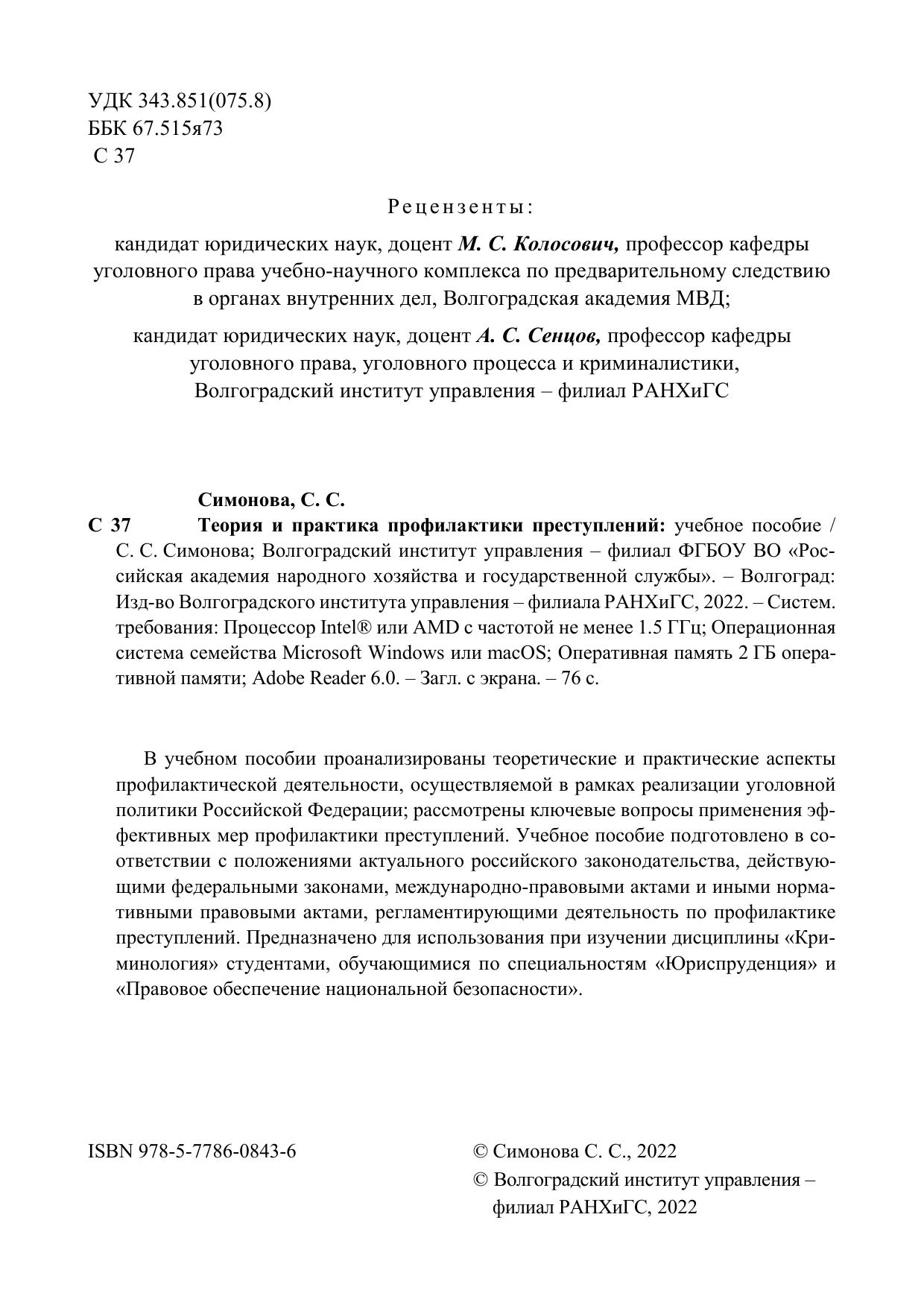 В учебном пособии проанализированы теоретические и практические аспекты профилактической деятельности, осуществляемой в рамках реализации уголовной политики Российской Федерации; рассмотрены ключевые вопросы применения эффективных мер профилактики преступлений. Учебное пособие подготовлено в соответствии с положениями актуального российского законодательства, действующими федеральными законами, международно-правовыми актами и иными нормативными правовыми актами, регламентирующими деятельность по профилактике преступлений. Предназначено для использования при изучении дисциплины «Криминология» студентами, обучающимися по специальностям «Юриспруденция» и «Правовое обеспечение национальной безопасности».