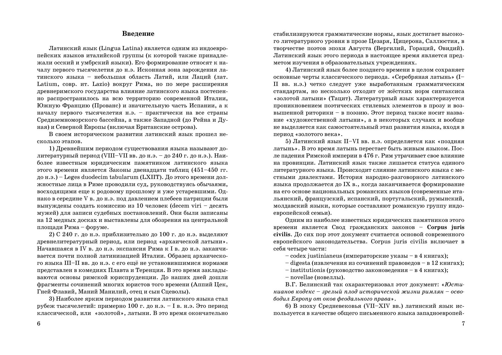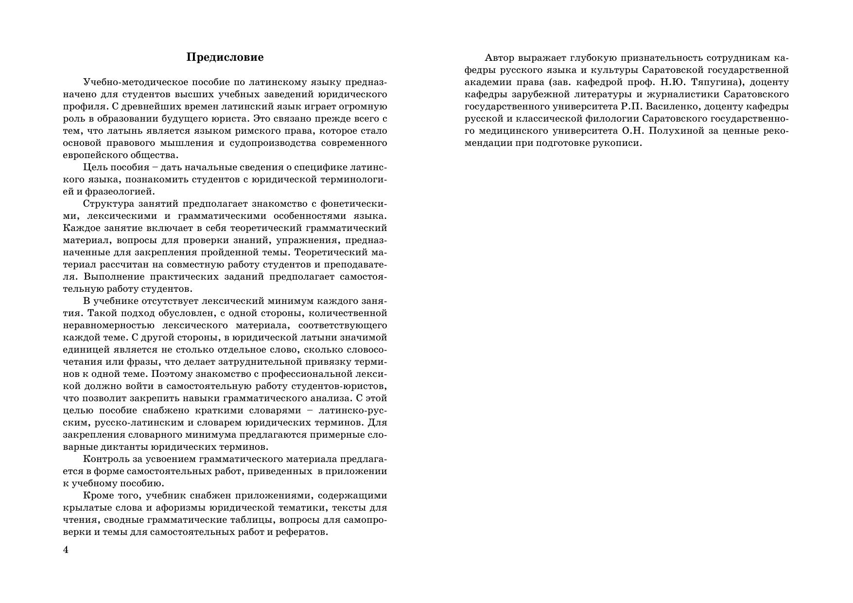 Настоящее учебное пособие дает начальные сведения о специфике латинского языка, знакомит с юридической терминологией и фразеологией. Каждое занятие включает теоретический материал, вопросы для проверки знаний и упражнения. Книга снабжена краткими словарями (латинско-русским, русско-латинским, словарем юридических терминов). В приложении даны крылатые слова и выражения, тексты для чтения и другие материалы. Для студентов вузов юридического профиля.