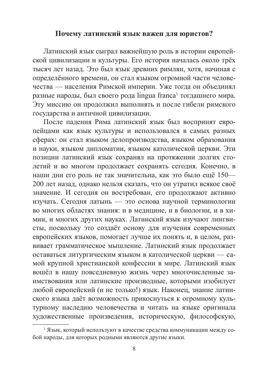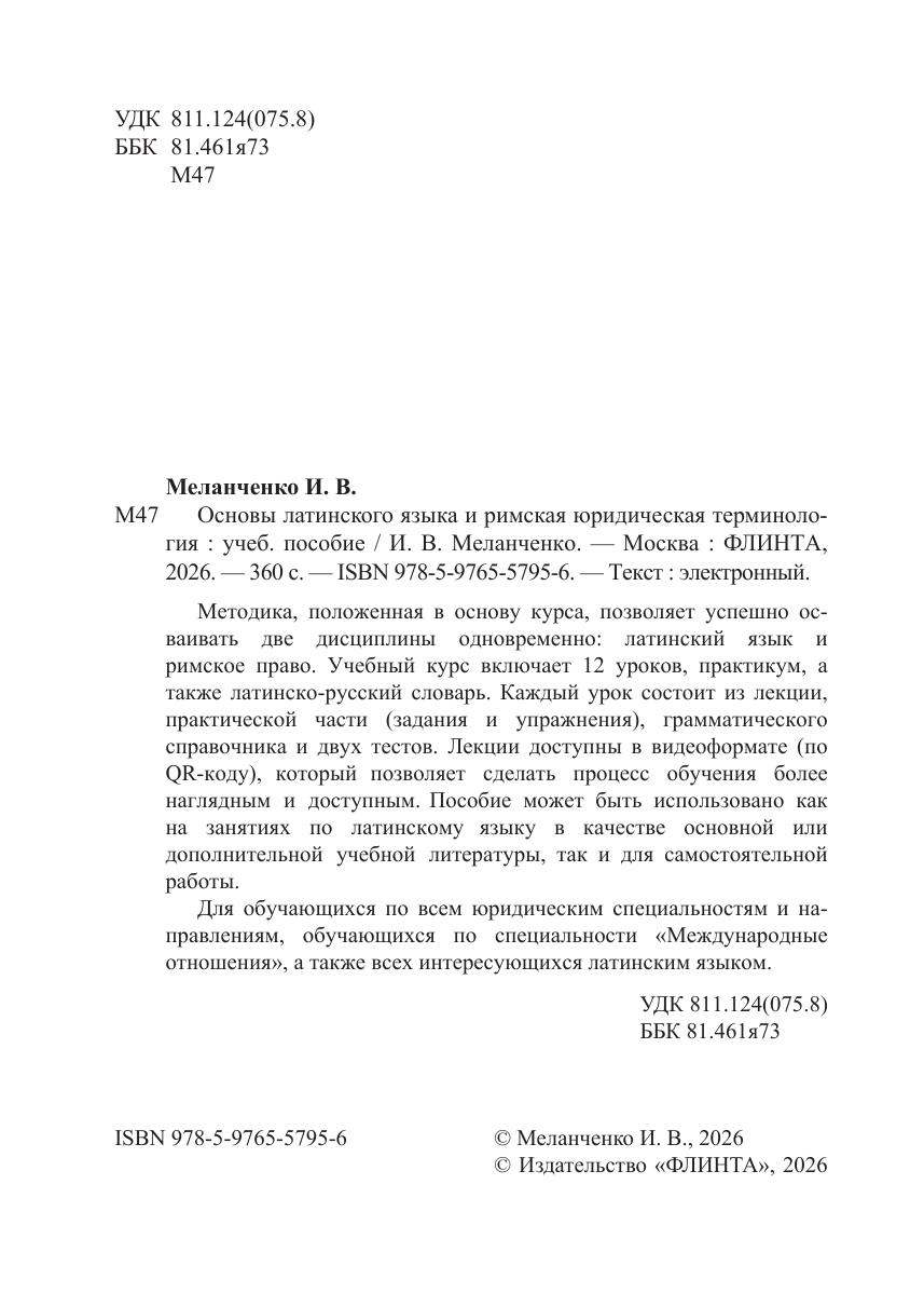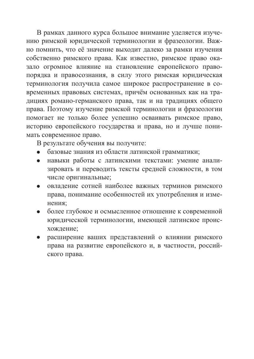 Методика, положенная в основу курса, позволяет успешно осваивать две дисциплины одновременно: латинский язык и римское право. Учебный курс включает 12 уроков, практикум, а также латинско-русский словарь. Каждый урок состоит из лекции, практической части (задания и упражнения), грамматического справочника и двух тестов. Лекции доступны в видеоформате (по QR-коду), который позволяет сделать процесс обучения более наглядным и доступным. Пособие может быть использовано как на занятиях по латинскому языку в качестве основной или дополнительной учебной литературы, так и для самостоятельной работы. Для обучающихся по всем юридическим специальностям и направлениям, обучающихся по специальности «Международные отношения», а также всех интересующихся латинским языком.