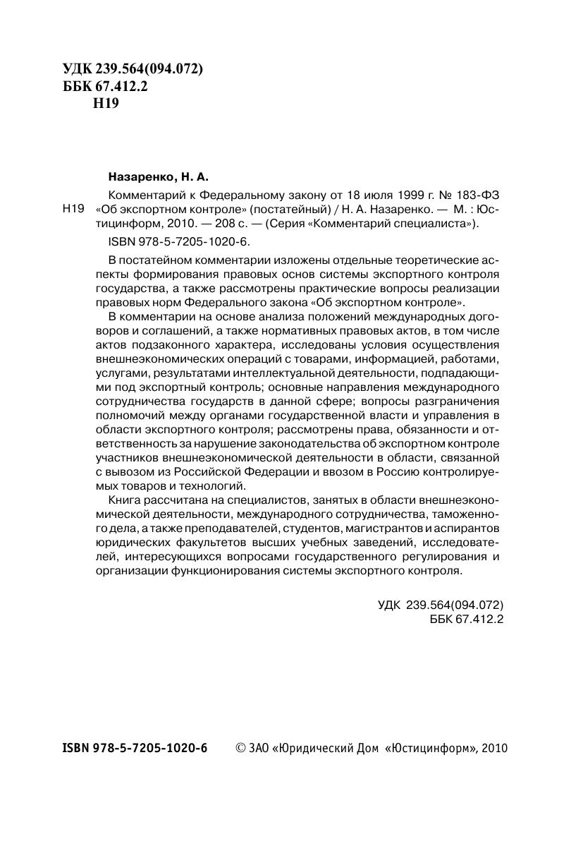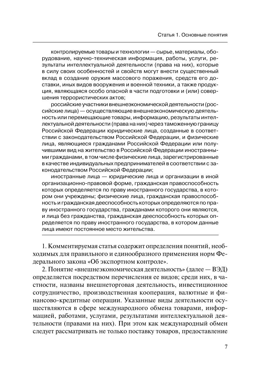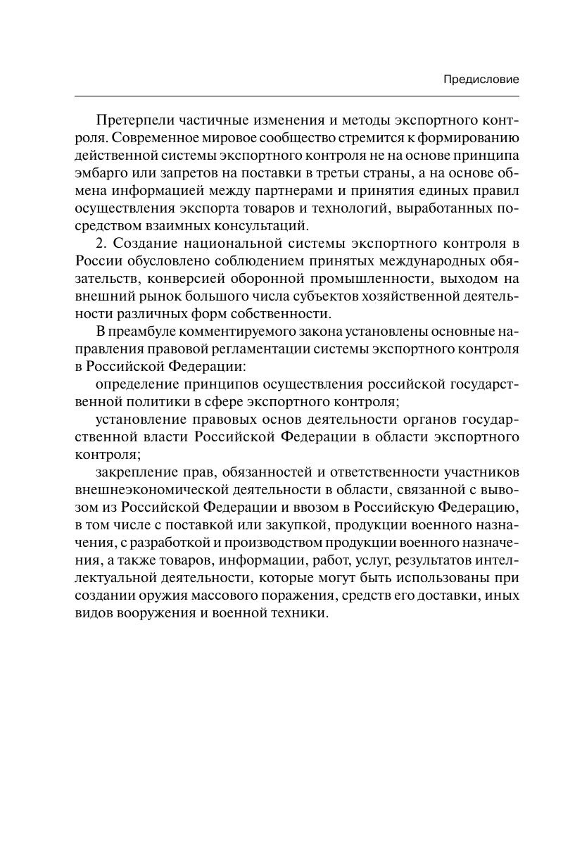 В постатейном комментарии изложены отдельные теоретические аспекты формирования правовых основ системы экспортного контроля государства, а также рассмотрены практические вопросы реализации правовых норм Федерального закона «Об экспортном контроле». В комментарии на основе анализа положений международных договоров и соглашений, а также нормативных правовых актов, в том числе актов подзаконного характера, исследованы условия осуществления внешнеэкономических операций с товарами, информацией, работами, услугами, результатами интеллектуальной деятельности, подпадающими под экспортный контроль основные направления международного сотрудничества государств в данной сфере вопросы разграничения полномочий между органами государственной власти и управления в области экспортного контроля рассмотрены права, обязанности и ответственность за нарушение законодательства об экспортном контроле участников внешнеэкономической деятельности в области, связанной с вывозом из Российской Федерации и ввозом в Россию контролируемых товаров и технологий.