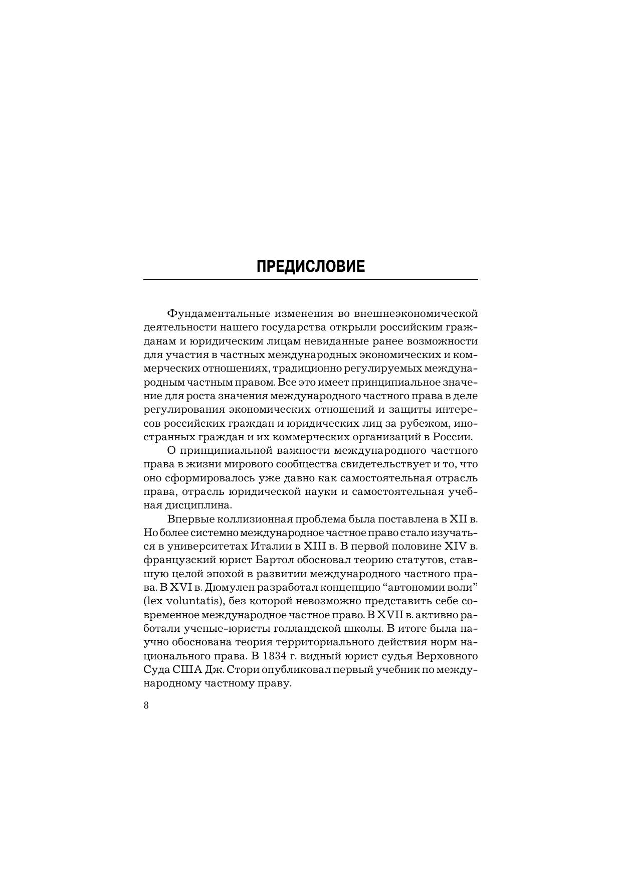 Особое внимание уделено основным подотраслям и институтам международного частного права, таким как правовой режим собственности, внешнеэкономические договорные обязательства, международные перевозки, расчеты, семейные, трудовые и деликатные обязательства.