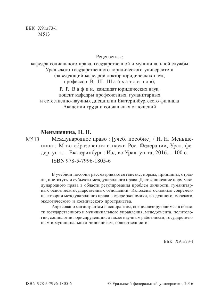 В учебном пособии рассматриваются генезис, нормы, принципы, отрасли, институты и субъекты международного права. Дается описание норм международного права в области регулирования проблем личности, гуманитарных основ межгосударственных отношений. Изложены основные современные теории международного права в сфере экономики, воздушного, морского, экологического и космического пространства. Адресовано магистрантам и аспирантам, специализирующимся в области государственного и муниципального управления, менеджмента, политологии, социологии, юриспруденции, а также научным работникам, государственным и муниципальным чиновникам, общественности.