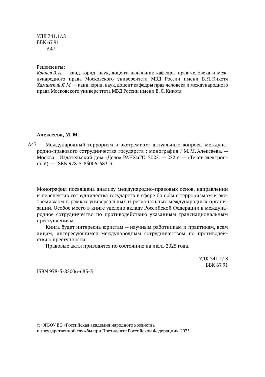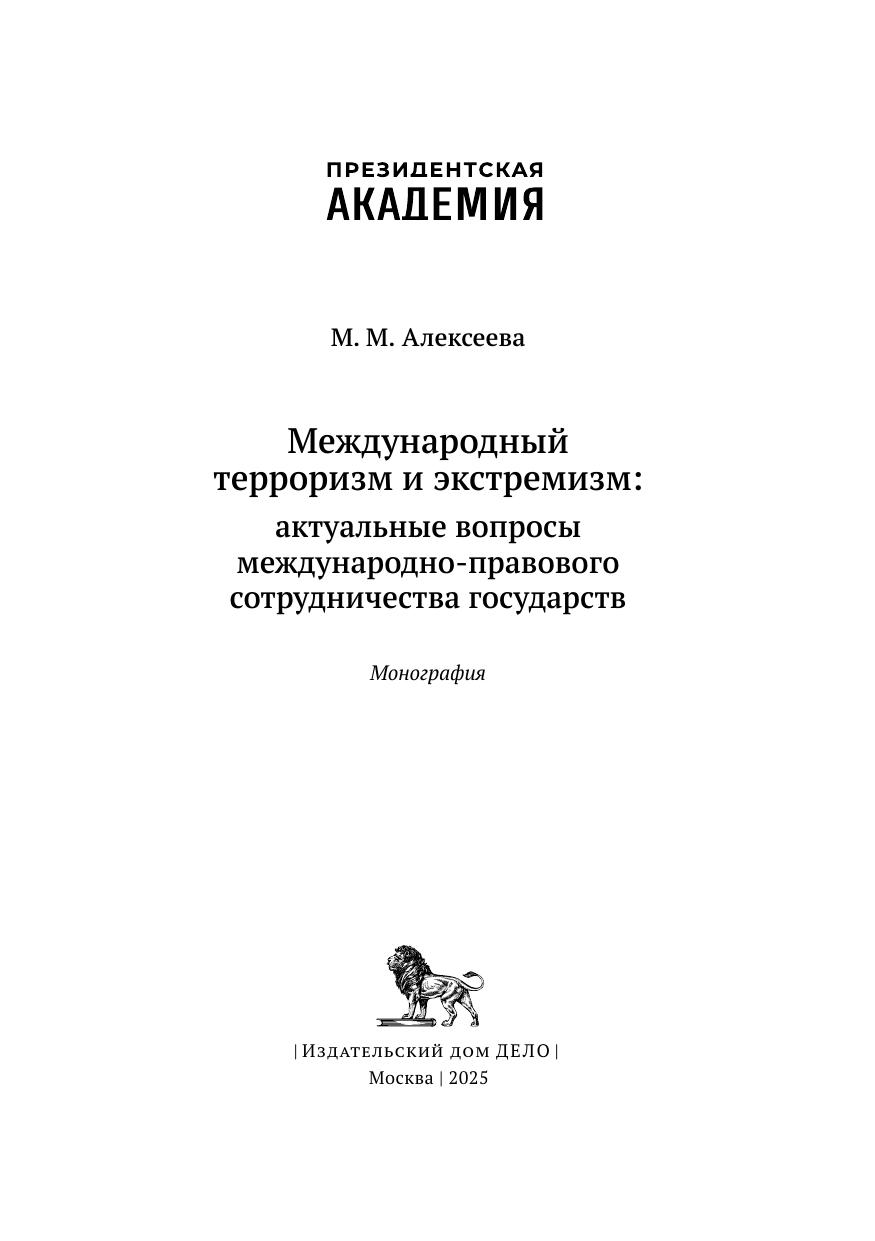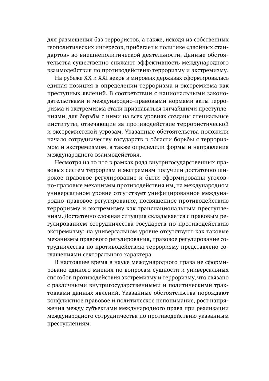 Монография посвящена анализу международно-правовых основ, направлений и перспектив сотрудничества государств в сфере борьбы с терроризмом и экстремизмом в рамках универсальных и региональных международных организаций. Особое место в книге уделено вкладу Российской Федерации в международное сотрудничество по противодействию указанным транснациональным преступлениям. Книга будет интересна юристам — научным работникам и практикам, всем лицам, интересующимся международным сотрудничеством по противодействию преступности. Правовые акты приводятся по состоянию на июль 2025 года.