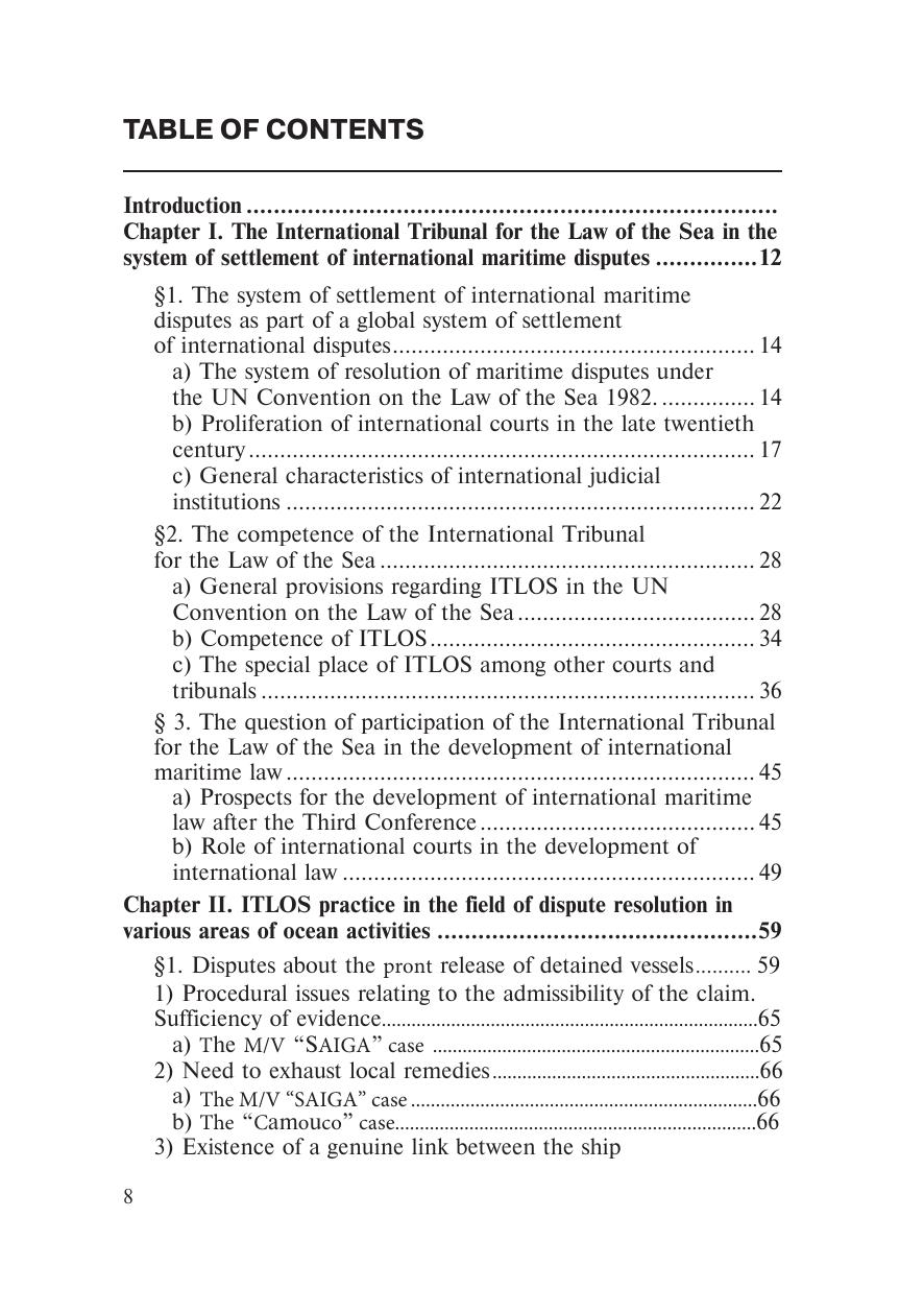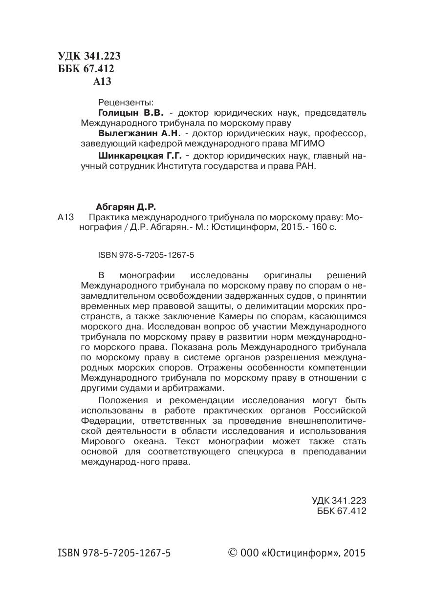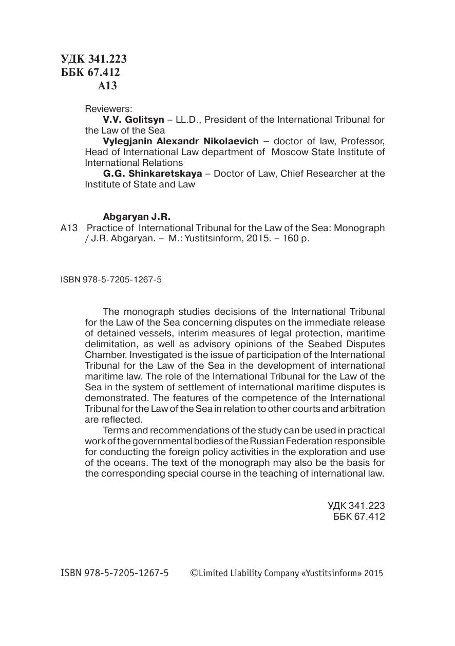 В монографии исследованы оригиналы решений Международного трибунала по морскому праву по спорам о незамедлительном освобождении задержанных судов, о принятии временных мер правовой защиты, о делимитации морских пространств, а также заключение Камеры по спорам, касающимся морского дна. Исследован вопрос об участии Международного трибунала по морскому праву в развитии норм международного морского права. Показана роль Международного трибунала по морскому праву в системе органов разрешения международных морских споров. Отражены особенности компетенции Международного трибунала по морскому праву в отношении с другими судами и арбитражами. Положения и рекомендации исследования могут быть использованы в работе практических органов Российской Федерации, ответственных за проведение внешнеполитической деятельности в области исследования и использования Мирового океана. Текст монографии может также стать основой для соответствующего спецкурса в преподавании международного права
