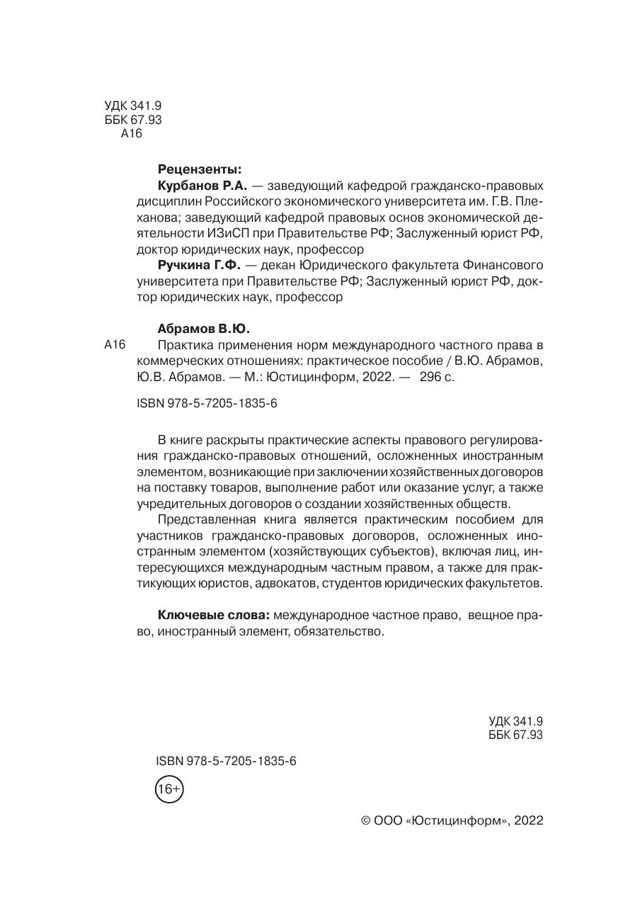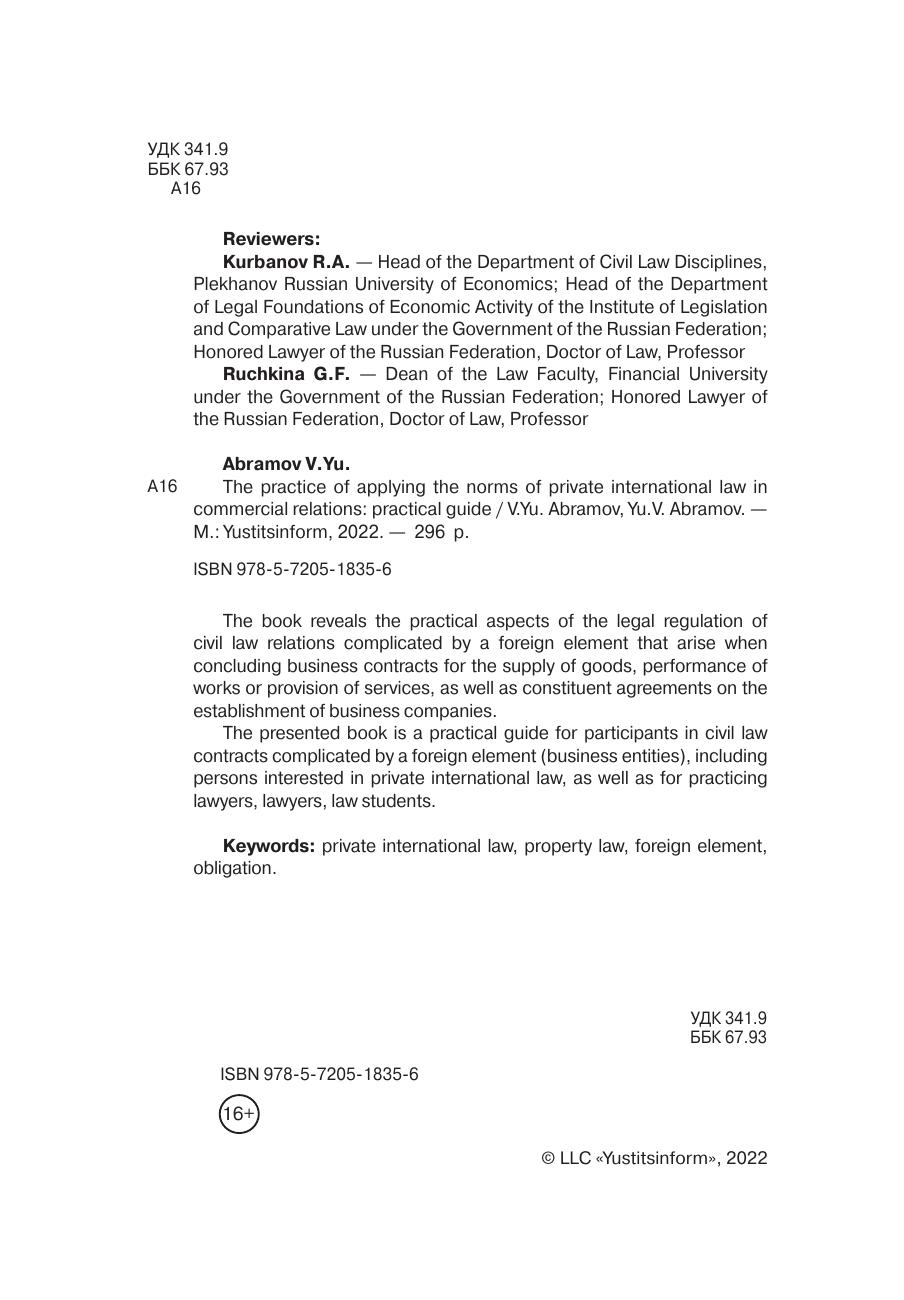 Представленная книга является практическим пособием для участников гражданско-правовых договоров, осложненных ино странным элементом (хозяйствующих субъектов), включая лиц, ин тересующихся международным частным правом, а также для практикующих юристов, адвокатов, студентов юридических факультетов.