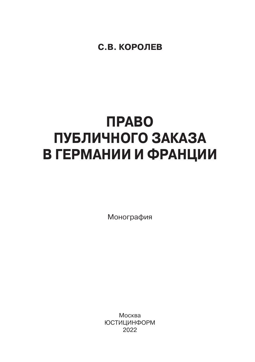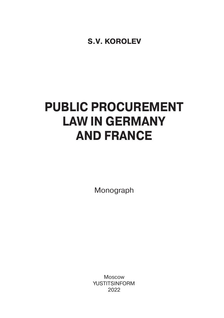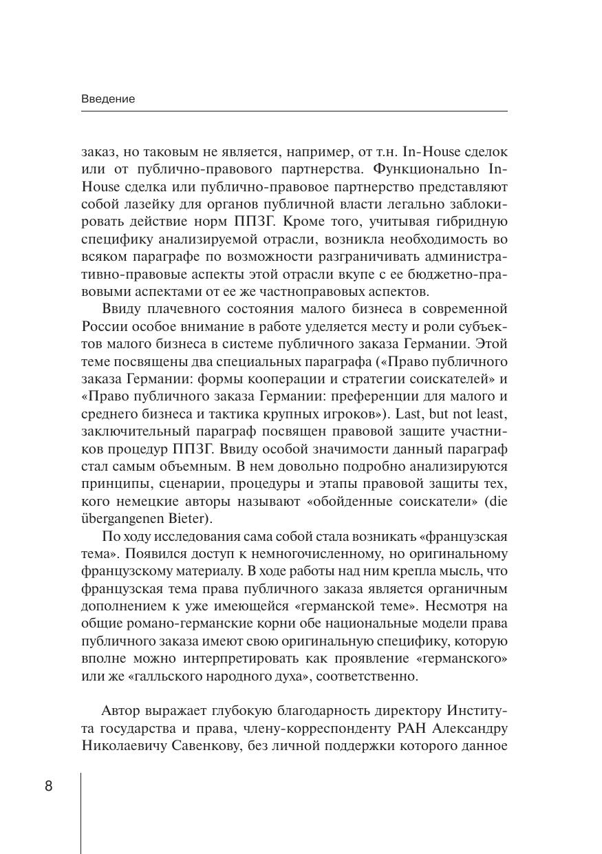Монография представляет собой первое русскоязычное исследо вание принципов, базовых процедур и функций права публичного заказа Германии (ППЗГ) и права публичного заказа Франции (ППЗФ). Речь идет о совокупности норм публичного правопорядка ведущих стран романо-гер манской правовой семьи. В принципе эти нормы принадлежат к различным отраслям права (административного, бюджетного, договорного и конку рентного права), но также совместно регулируют условия и порядок раз мещения заказов со стороны субъектов публичного права на производство работ и предоставление услуг силами субъектов частного права.
