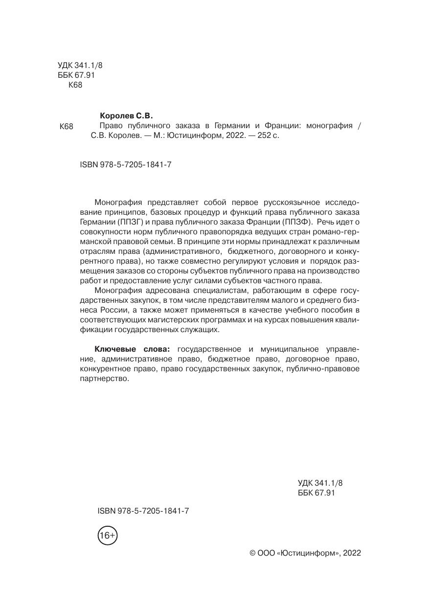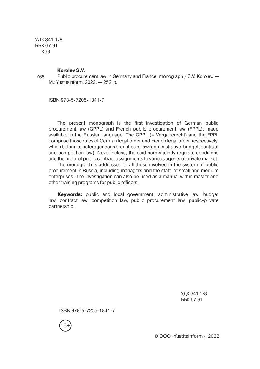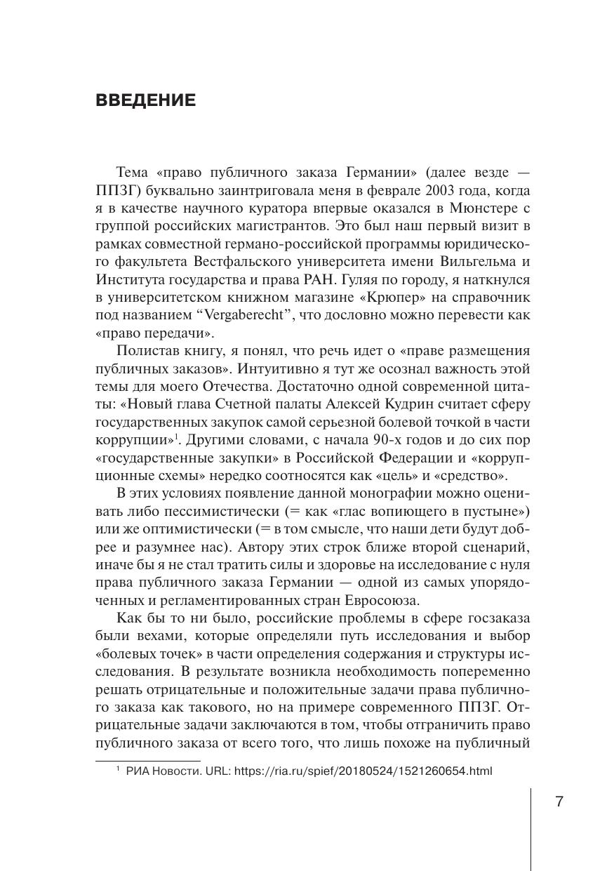 Монография представляет собой первое русскоязычное исследо вание принципов, базовых процедур и функций права публичного заказа Германии (ППЗГ) и права публичного заказа Франции (ППЗФ). Речь идет о совокупности норм публичного правопорядка ведущих стран романо-гер манской правовой семьи. В принципе эти нормы принадлежат к различным отраслям права (административного, бюджетного, договорного и конку рентного права), но также совместно регулируют условия и порядок раз мещения заказов со стороны субъектов публичного права на производство работ и предоставление услуг силами субъектов частного права.