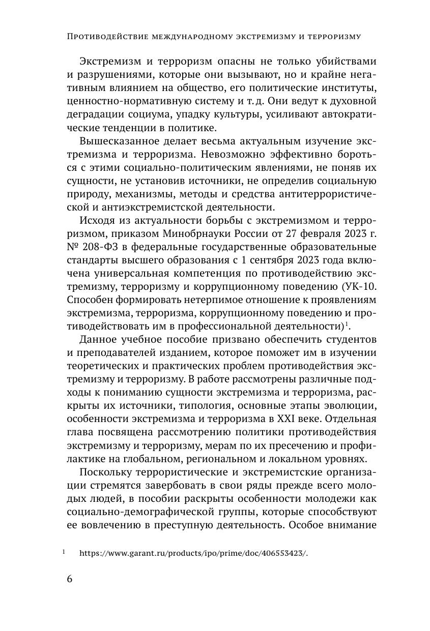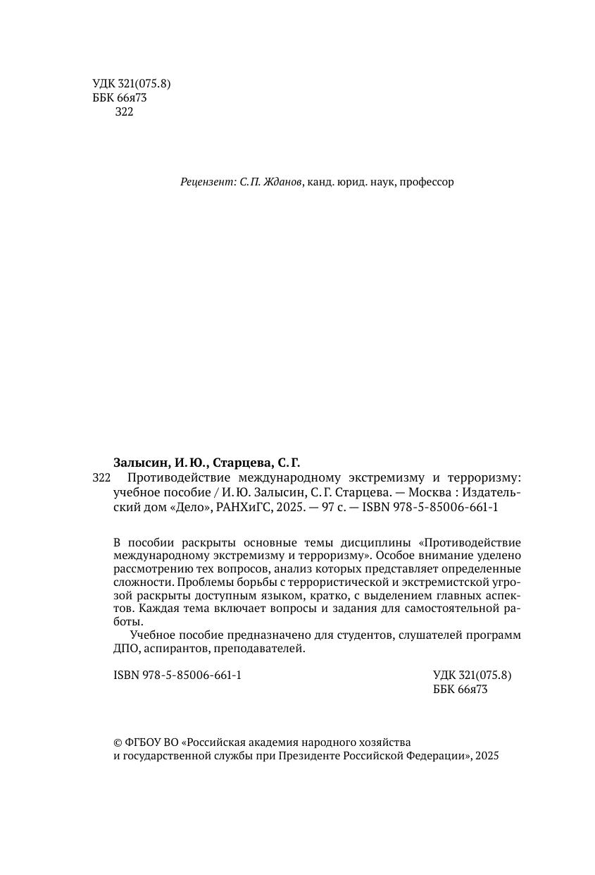В пособии раскрыты основные темы дисциплины «Противодействие международному экстремизму и терроризму». Особое внимание уделено рассмотрению тех вопросов, анализ которых представляет определенные сложности. Проблемы борьбы с террористической и экстремистской угрозой раскрыты доступным языком, кратко, с выделением главных аспектов. Каждая тема включает вопросы и задания для самостоятельной работы. Учебное пособие предназначено для студентов, слушателей программ ДПО, аспирантов, преподавателей.