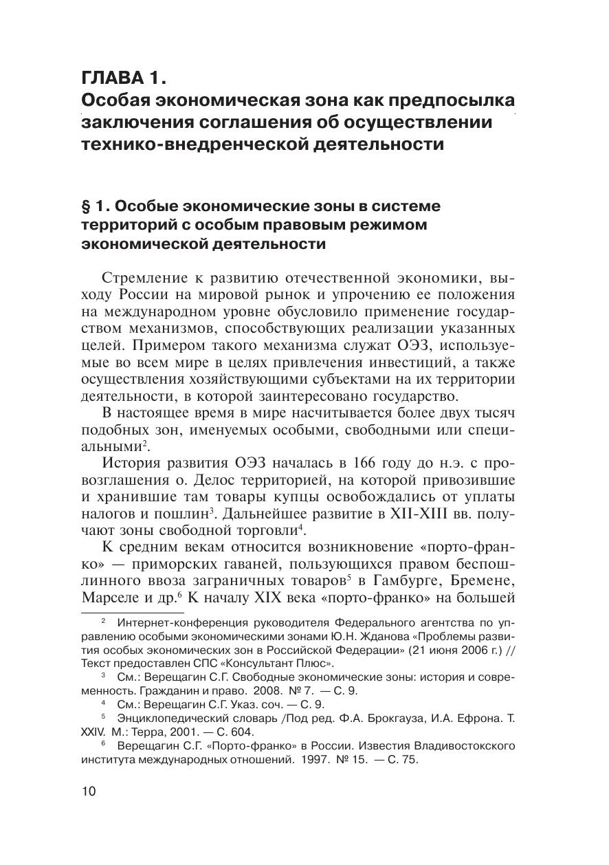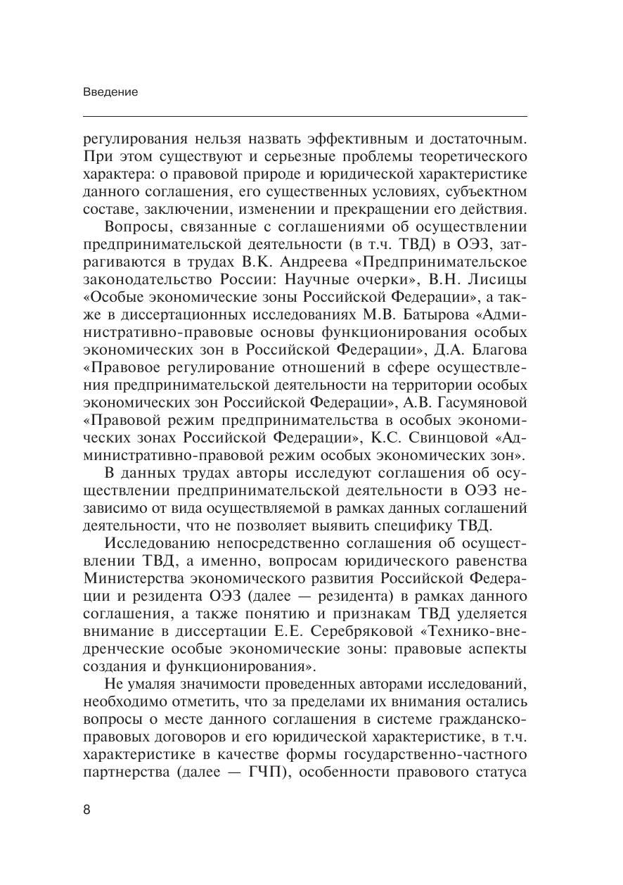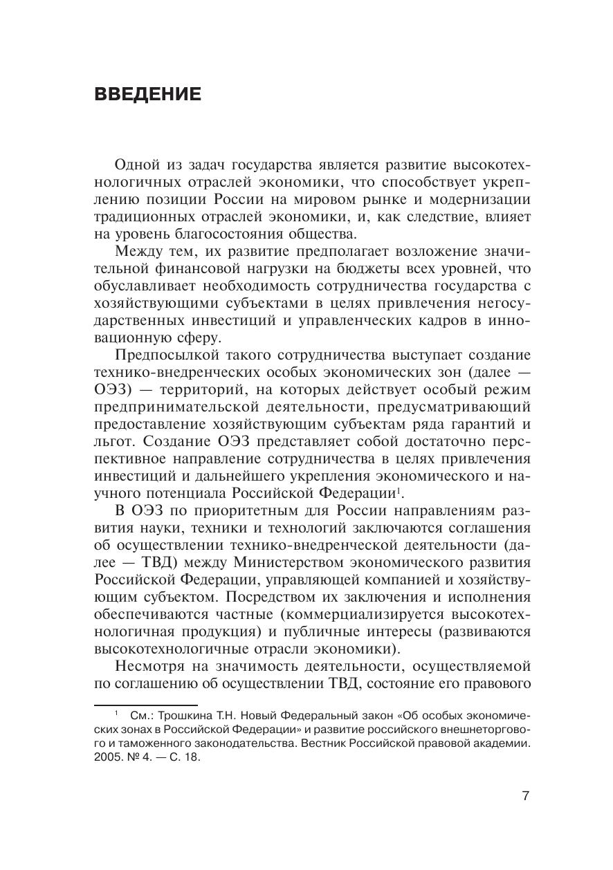 В данной монографии на основе анализа действующего отечественного и зарубежного законодательства, а также материалов юридической практики рассматриваются особенности осуществления предпринимательской деятельности в особых экономических зонах, в частности, проводится анализ правовой сущности соглашения об осуществлении технико-внедренческой деятельности в особых экономических зонах. Последовательно доказывается гражданско-правовая природа соглашения об осуществлении технико-внедренческой деятельности, дается его юридическая характеристика и определяется место данного соглашения в системе гражданско-правовых договоров. Монография предназначена для студентов, аспирантов, преподавателей, а также для юристов и экономистов, осуществляющих практическую деятельность по вопросам особых экономических зон.