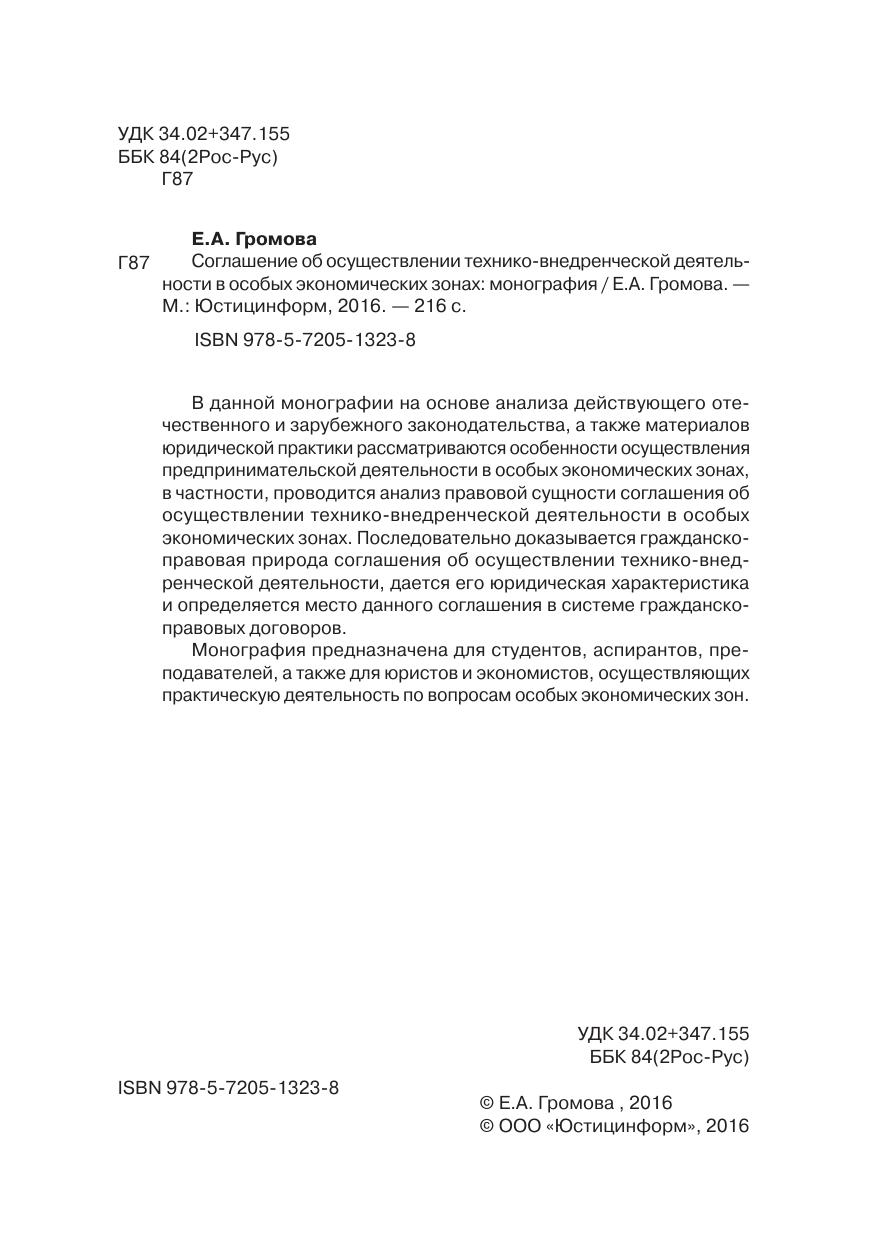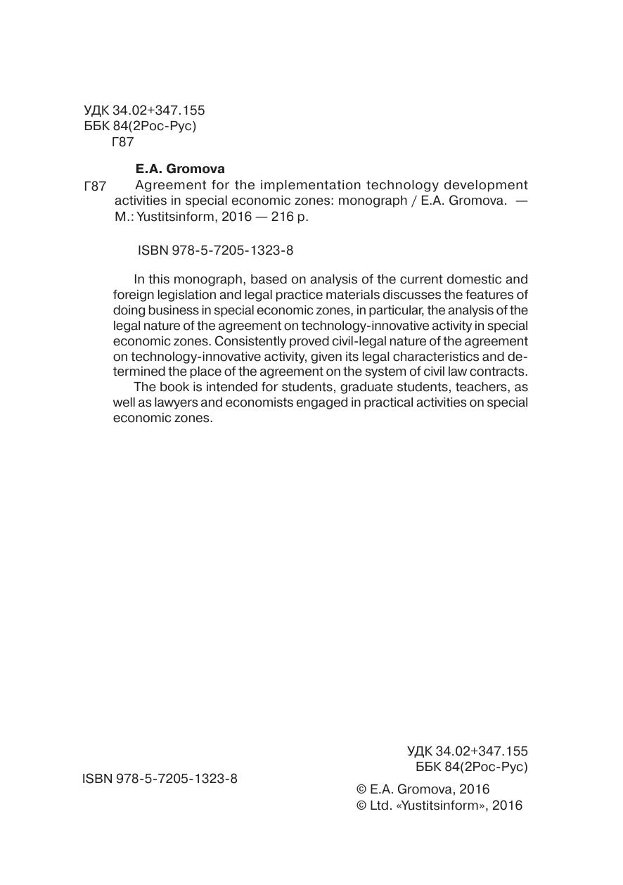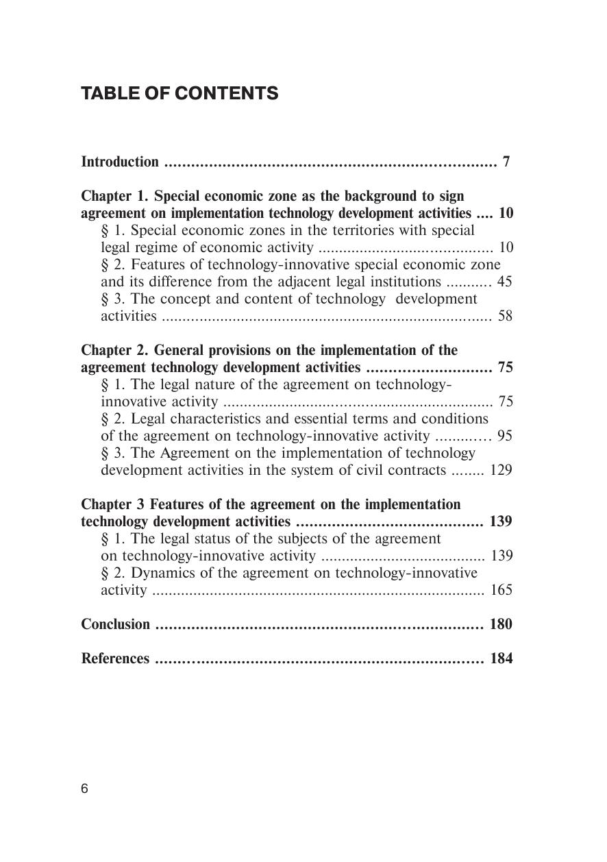 В данной монографии на основе анализа действующего отечественного и зарубежного законодательства, а также материалов юридической практики рассматриваются особенности осуществления предпринимательской деятельности в особых экономических зонах, в частности, проводится анализ правовой сущности соглашения об осуществлении технико-внедренческой деятельности в особых экономических зонах. Последовательно доказывается гражданско-правовая природа соглашения об осуществлении технико-внедренческой деятельности, дается его юридическая характеристика и определяется место данного соглашения в системе гражданско-правовых договоров. Монография предназначена для студентов, аспирантов, преподавателей, а также для юристов и экономистов, осуществляющих практическую деятельность по вопросам особых экономических зон.