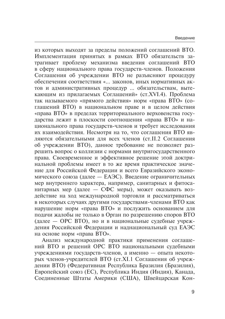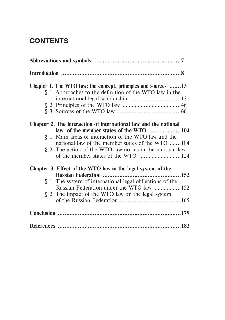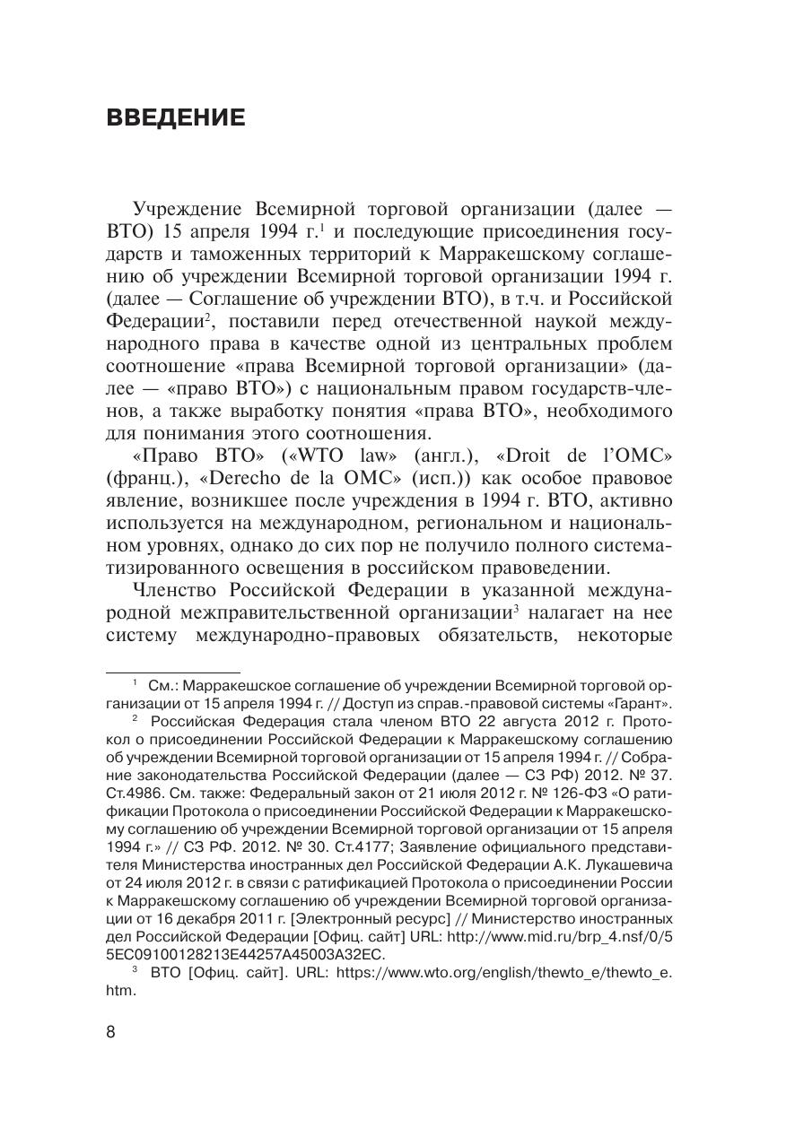 В монографии всесторонне анализируются юридические аспекты соотношения «права ВТО» и национального права государств-членов. Автором сформулированы предложения по совершенствованию правового регулирования общественных отношений, возникающих при присоединении государства к Соглашению об учреждении ВТО, а также предложены рекомендации относительно позиции Российской Федерации по «прямому действию» норм «права ВТО» в правовой системе Российской Федерации.