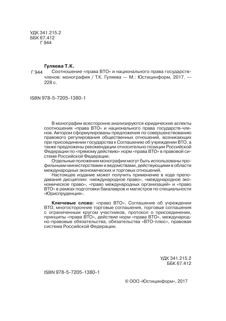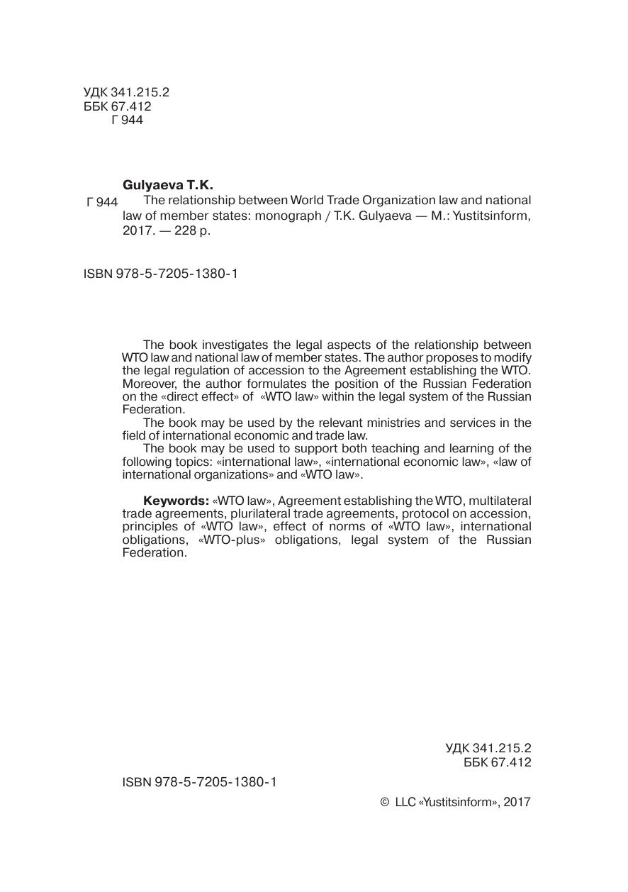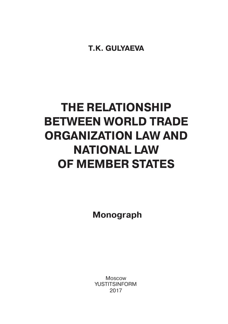 В монографии всесторонне анализируются юридические аспекты соотношения «права ВТО» и национального права государств-членов. Автором сформулированы предложения по совершенствованию правового регулирования общественных отношений, возникающих при присоединении государства к Соглашению об учреждении ВТО, а также предложены рекомендации относительно позиции Российской Федерации по «прямому действию» норм «права ВТО» в правовой системе Российской Федерации.