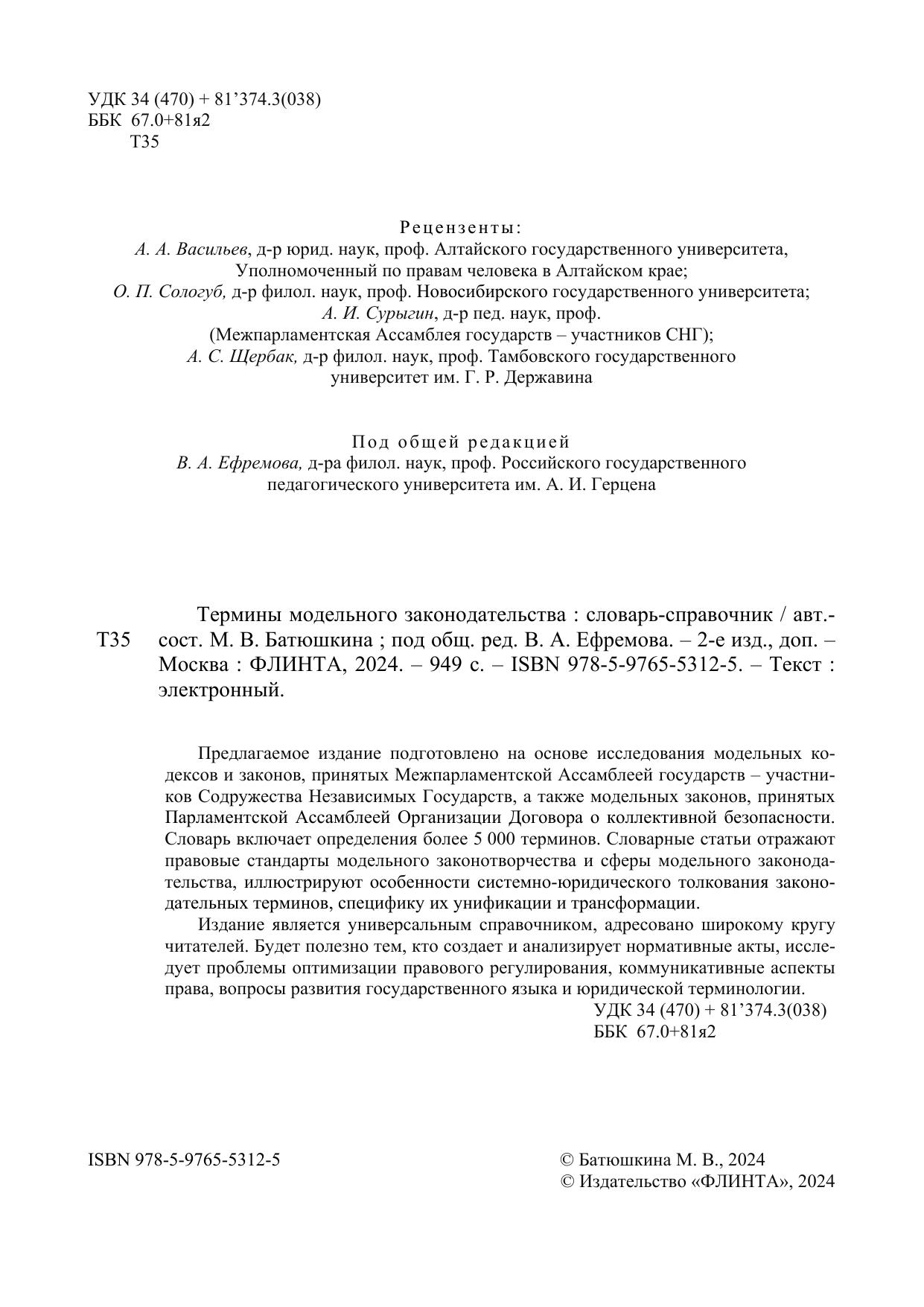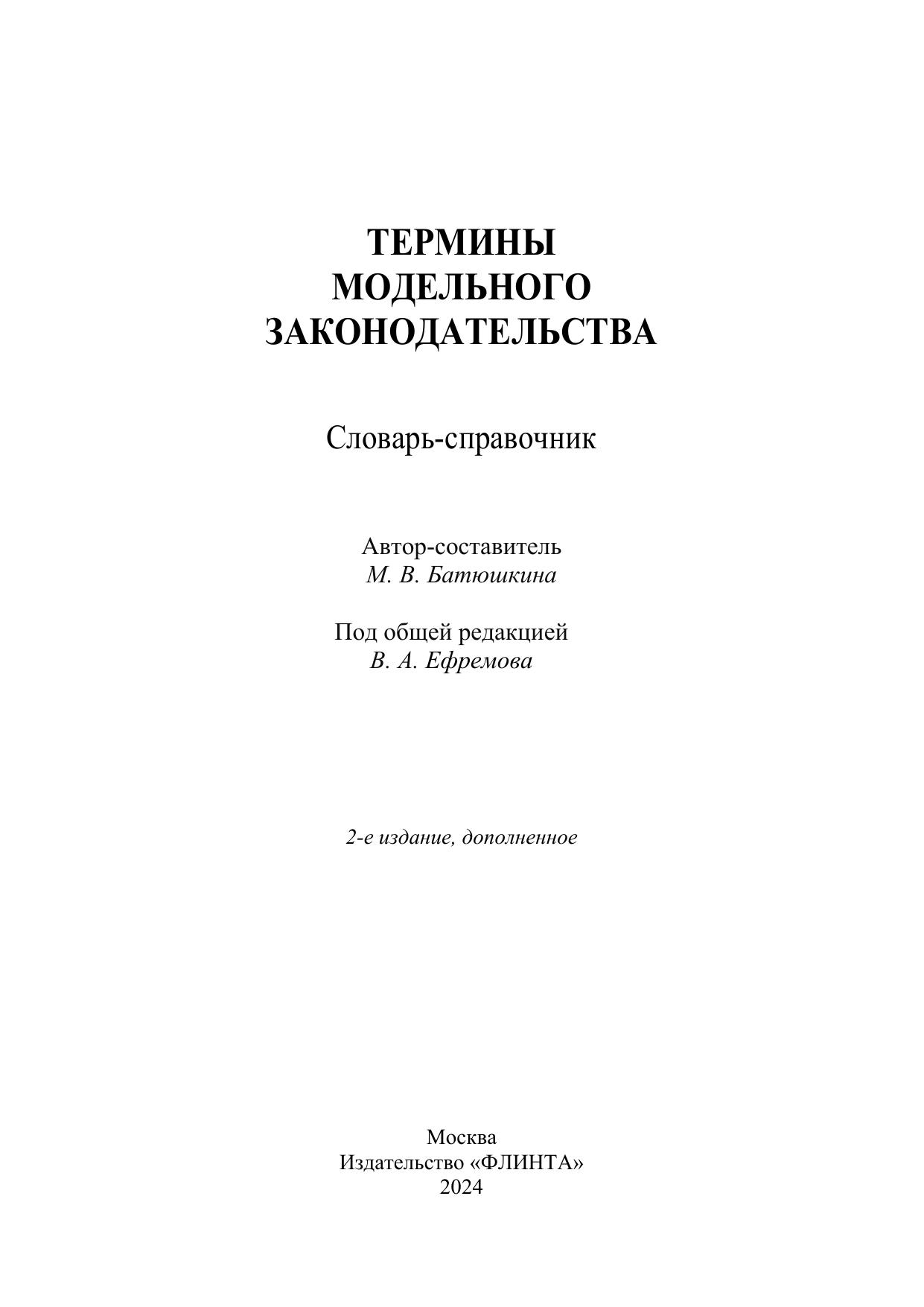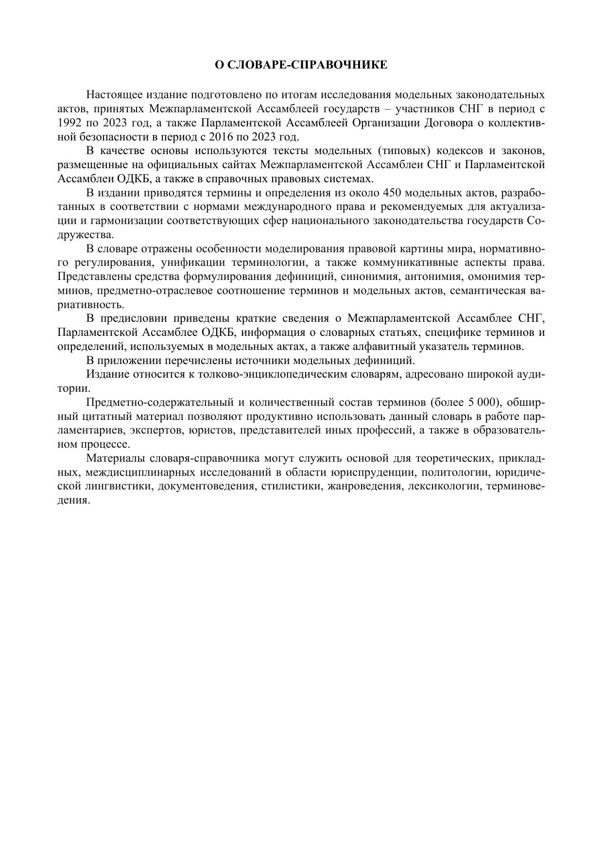 Предлагаемое издание подготовлено на основе исследования модельных кодексов и законов, принятых Межпарламентской Ассамблеей государств – участников Содружества Независимых Государств, а также модельных законов, принятых Парламентской Ассамблеей Организации Договора о коллективной безопасности. Словарь включает определения более 5 000 терминов. Словарные статьи отражают правовые стандарты модельного законотворчества и сферы модельного законодательства, иллюстрируют особенности системно-юридического толкования законодательных терминов, специфику их унификации и трансформации. Издание является универсальным справочником, адресовано широкому кругу читателей. Будет полезно тем, кто создает и анализирует нормативные акты, исследует проблемы оптимизации правового регулирования, коммуникативные аспекты права, вопросы развития государственного языка и юридической терминологии.