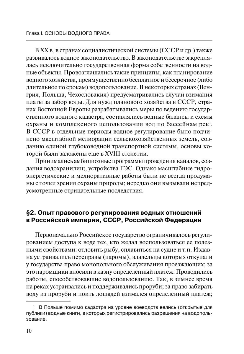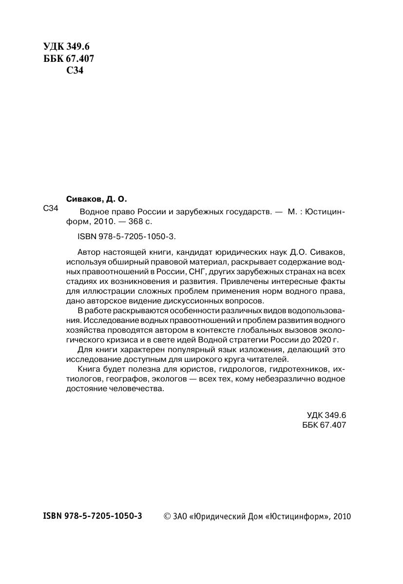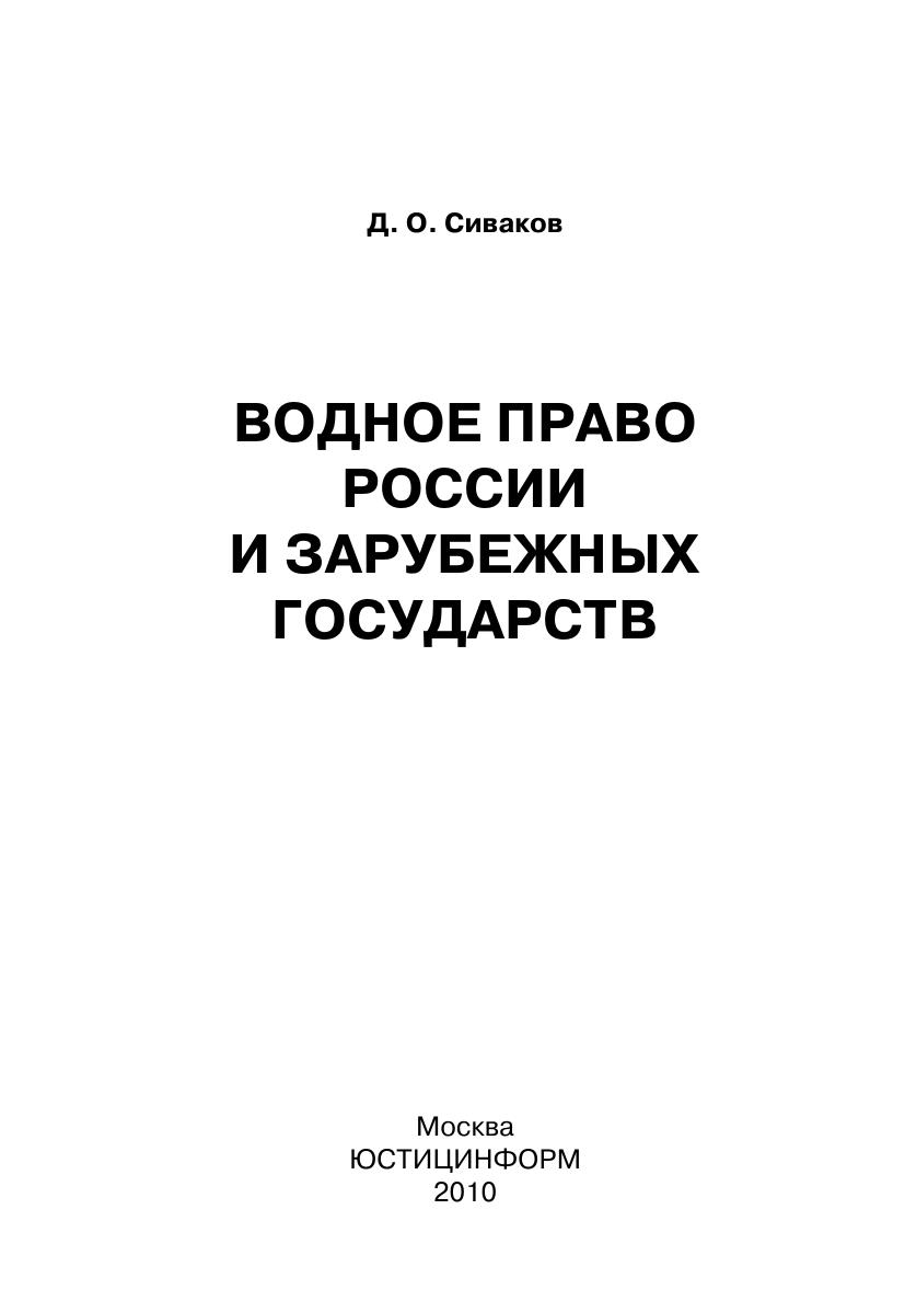 Автор настоящей книги, кандидат юридических наук Д.О. Сиваков, используя обширный правовой материал, раскрывает содержание водных правоотношений в России, СНГ, других зарубежных странах на всех стадиях их возникновения и развития. Привлечены интересные факты для иллюстрации сложных проблем применения норм водного права, дано авторское видение дискуссионных вопросов. В работе раскрываются особенности различных видов водопользования. Исследование водных правоотношений и проблем развития водного хозяйства проводятся автором в контексте глобальных вызовов экологического кризиса и в свете идей Водной стратегии России до 2020 г. Для книги характерен популярный язык изложения, делающий это исследование доступным для широкого круга читателей.Книга будет полезна для юристов, гидрологов, гидротехников, ихтиологов, географов, экологов — всех тех, кому небезразлично водное достояние человечества