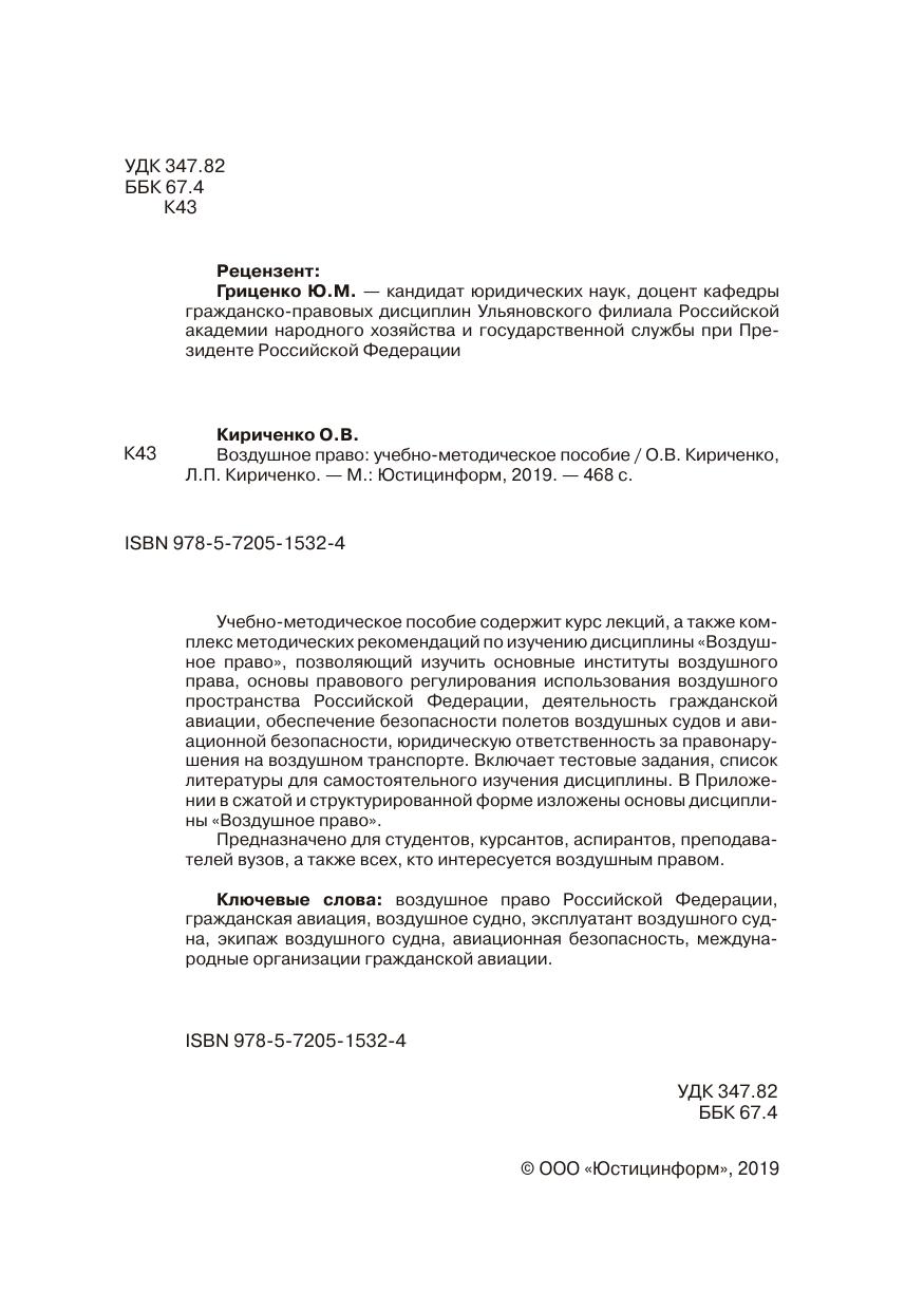 Учебно-методическое пособие содержит курс лекций, а также комплекс методических рекомендаций по изучению дисциплины «Воздушное право», позволяющий изучить основные институты воздушного права, основы правового регулирования использования воздушного пространства Российской Федерации, деятельность гражданской авиации, обеспечение безопасности полетов воздушных судов и авиационной безопасности, юридическую ответственность за правонарушения на воздушном транспорте. Включает тестовые задания, список литературы для самостоятельного изучения дисциплины. В Приложении в сжатой и структурированной форме изложены основы дисциплины «Воздушное право». Предназначено для студентов, курсантов, аспирантов, преподавателей вузов, а также всех, кто интересуется воздушным правом