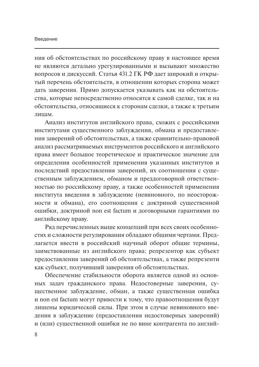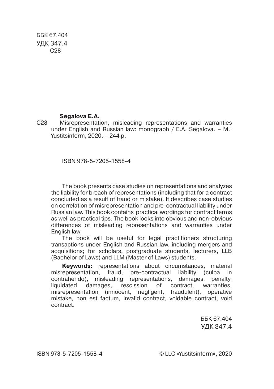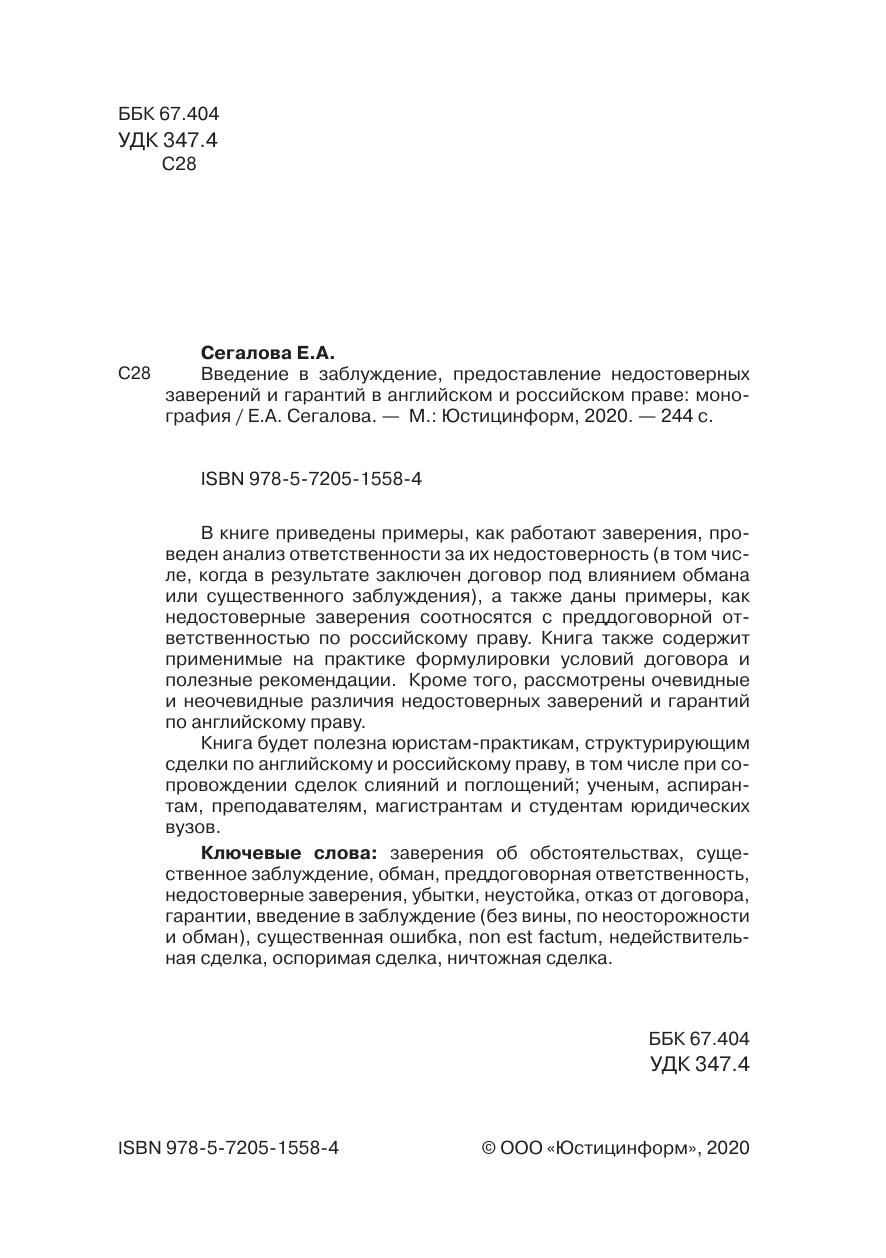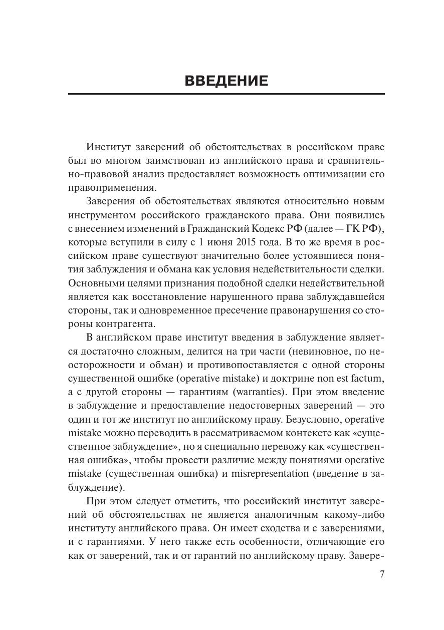В книге приведены примеры, как работают заверения, проведен анализ ответственности за их недостоверность (в том числе, когда в результате заключен договор под влиянием обмана или существенного заблуждения), а также даны примеры, как недостоверные заверения соотносятся с преддоговорной ответственностью по российскому праву. Книга также содержит применимые на практике формулировки условий договора и полезные рекомендации. Кроме того, рассмотрены очевидные и неочевидные различия недостоверных заверений и гарантий по английскому праву.