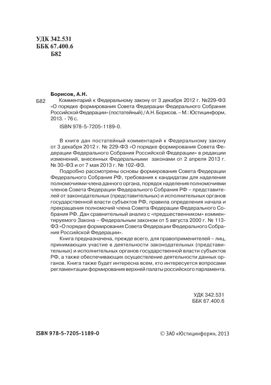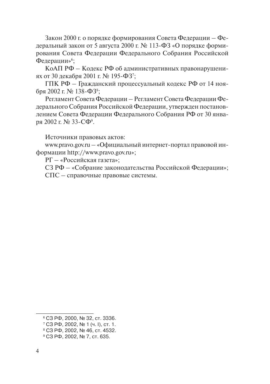 В книге дан постатейный комментарий к Федеральному законуот 3 декабря 2012 г. № 229-ФЗ «О порядке формирования Совета Федерации Федерального Собрания Российской Федерации» в редакции изменений, внесенных Федеральными законами от 2 апреля 2013 г.№ 30-ФЗ и от 7 мая 2013 г. № 102-ФЗ.Подробно рассмотрены основы формирования Совета ФедерацииФедерального Собрания РФ, требования к кандидатам для наделенияполномочиями члена данного органа, порядок наделения полномочиямичленов Совета Федерации Федерального Собрания РФ – представителей от законодательных (представительных) и исполнительных органов государственной власти субъектов РФ, правила определения начала ипрекращения полномочий члена Совета Федерации Федерального Собрания РФ. Дан сравнительный анализ с «предшественником» коммен-тируемого Закона – Федеральным законом от 5 августа 2000 г. № 113-ФЗ «О порядке формирования Совета Федерации Федерального Собра-ния Российской Федерации».Книга предназначена, прежде всего, для правоприменителей – лиц,принимающих участие в деятельности законодательных (представи-тельных) и исполнительных органов государственной власти субъектовРФ, а также обеспечивающих осуществление деятельности данных органов. Книга также будет интересна всем, кто интересуется вопросамирегламентации формирования верхней палаты российского парламента