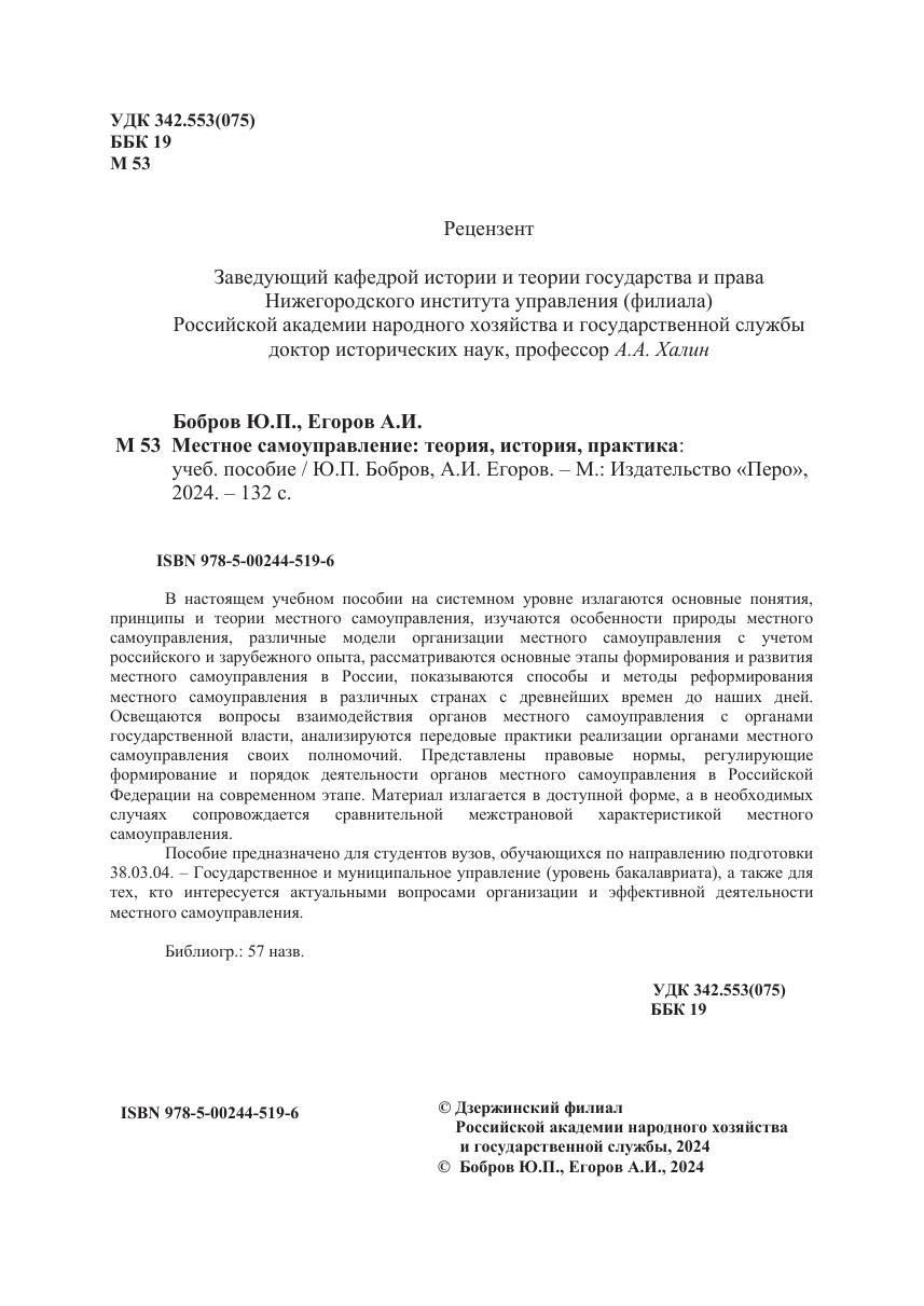 В настоящем учебном пособии на системном уровне излагаются основные понятия, принципы и теории местного самоуправления, изучаются особенности природы местного самоуправления, различные модели организации местного самоуправления с учетом российского и зарубежного опыта, рассматриваются основные этапы формирования и развития местного самоуправления в России, показываются способы и методы реформирования местного самоуправления в различных странах с древнейших времен до наших дней. Освещаются вопросы взаимодействия органов местного самоуправления с органами государственной власти, анализируются передовые практики реализации органами местного самоуправления своих полномочий. Представлены правовые нормы, регулирующие формирование и порядок деятельности органов местного самоуправления в Российской Федерации на современном этапе. Материал излагается в доступной форме, а в необходимых случаях сопровождается сравнительной межстрановой характеристикой местного самоуправления. Пособие предназначено для студентов вузов, обучающихся по направлению подготовки 38.03.04. – Государственное и муниципальное управление (уровень бакалавриата), а также для тех, кто интересуется актуальными вопросами организации и эффективной деятельности местного самоуправления.