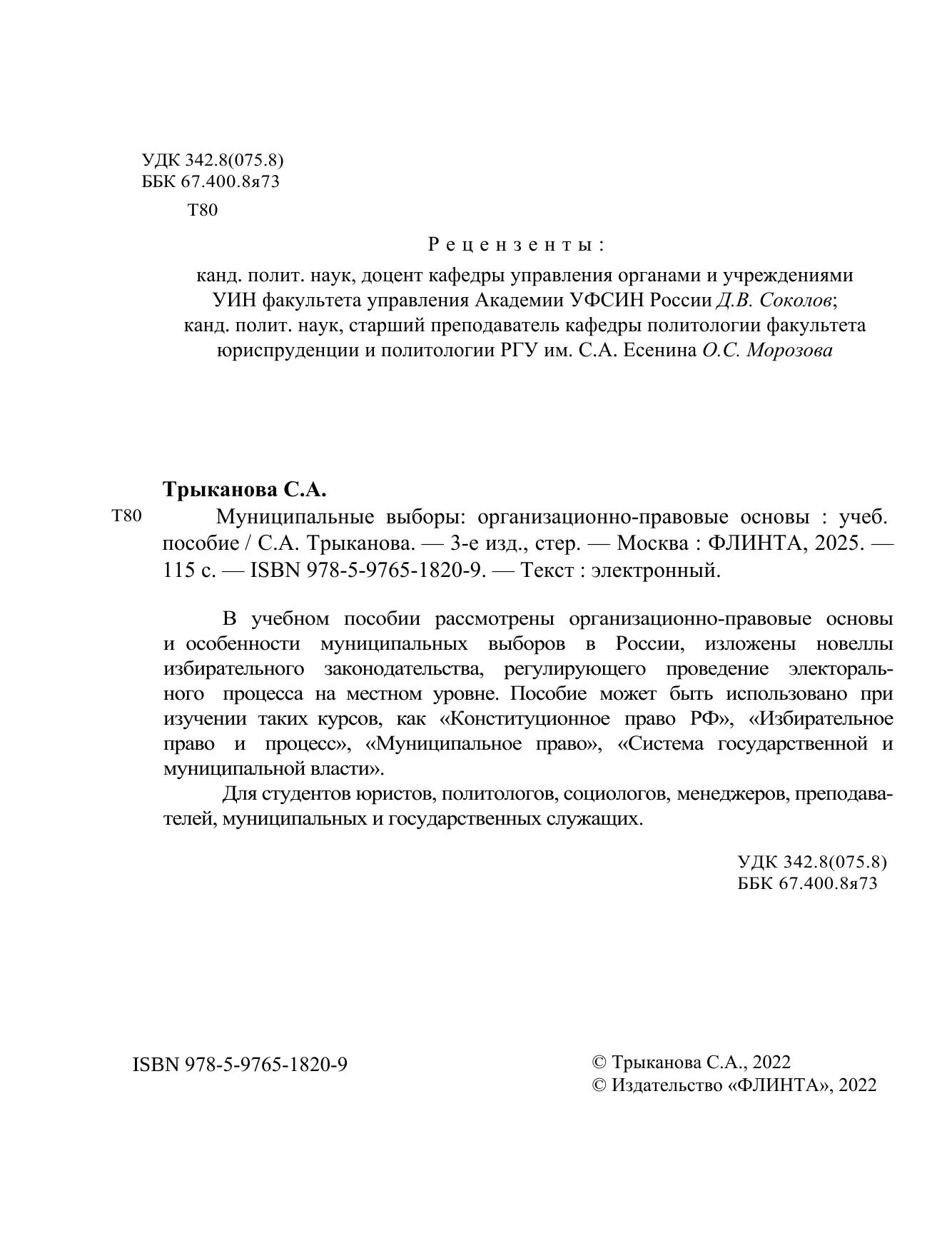 В учебном пособии рассмотрены организационно-правовые основы и особенности муниципальных выборов в России, изложены новеллы избирательного законодательства, регулирующего проведение электорального процесса на местном уровне. Пособие может быть использовано при изучении таких курсов, как «Конституционное право РФ», «Избирательное право и процесс», «Муниципальное право», «Система государственной и муниципальной власти». Для студентов юристов, политологов, социологов, менеджеров, преподавателей, муниципальных и государственных служащих.