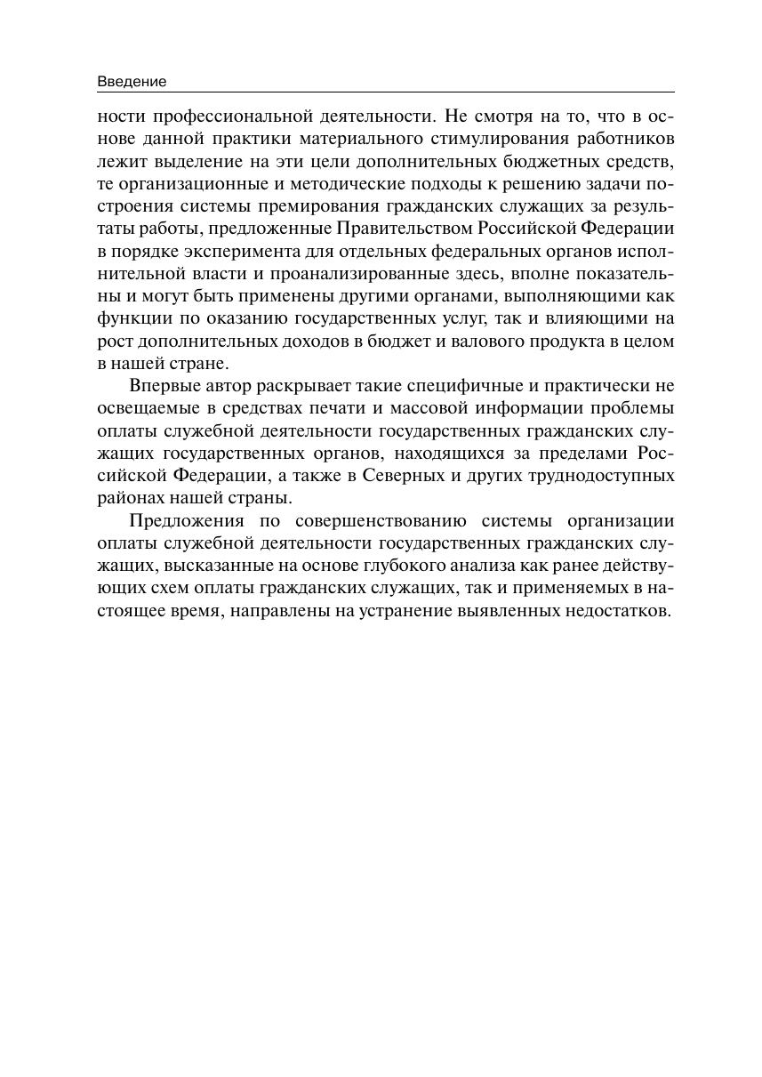 эффективности профессиональной деятельности. Впервые раскрываются специфичные, практически не затрагиваемые в СМИ проблемы оплаты служебной деятельности государственных гражданских служащих государственных органов, находящихся за пределами Российской Федерации, а также в северных и других труднодоступных районах нашей страны. Монография предназначена как для руководителей, так и для специалистов в сфере государственного и муниципального управления, для