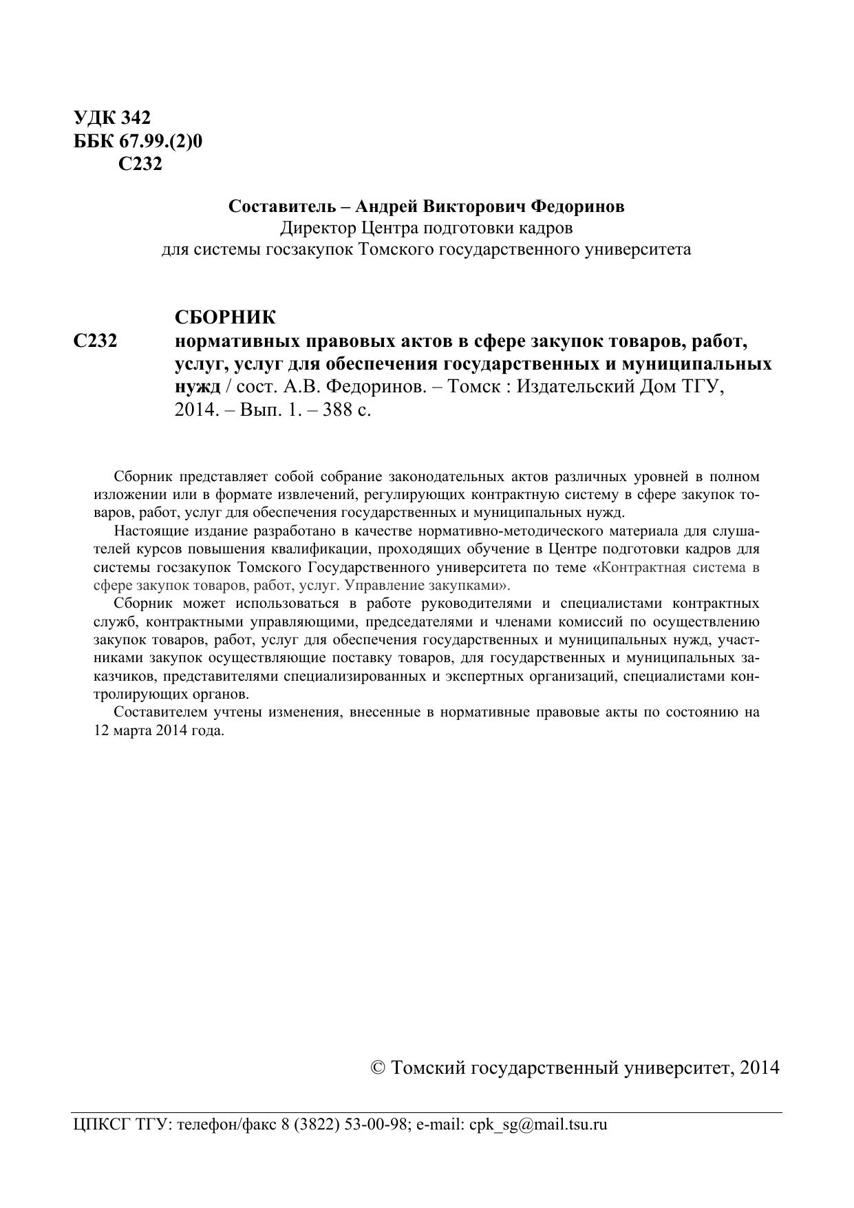 Сборник представляет собой собрание законодательных актов различных уровней в полном изложении или в формате извлечений, регулирующих контрактную систему в сфере закупок товаров, работ, услуг для обеспечения государственных и муниципальных нужд. Настоящие издание разработано в качестве нормативно-методического материала для слушателей курсов повышения квалификации, проходящих обучение в Центре подготовки кадров для системы госзакупок Томского Государственного университета по теме «Контрактная система в сфере закупок товаров, работ, услуг. Управление закупками». Сборник может использоваться в работе руководителями и специалистами контрактных служб, контрактными управляющими, председателями и членами комиссий по осуществлению закупок товаров, работ, услуг для обеспечения государственных и муниципальных нужд, участниками закупок осуществляющие поставку товаров, для государственных и муниципальных заказчиков, представителями специализированных и экспертных организаций, специалистами контролирующих органов. Составителем учтены изменения, внесенные в нормативные правовые акты по состоянию на 12 марта 2014 года.