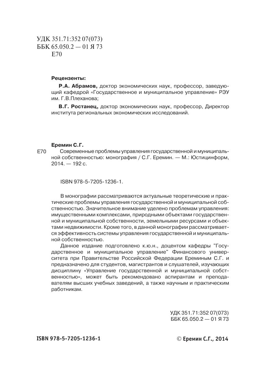 В монографии рассматриваются актуальные теоретические и практические проблемы управления государственной и муниципальной собственностью. Значительное внимание уделено проблемам управления: имущественными комплексами, природными объектами государственной и муниципальной собственности, земельными ресурсами и объектами недвижимости. Кроме того, в данной монографии рассматривается эффективность системы управления государственной и муниципальной собственностью. Данное издание подготовлено к.ю.н., доцентом кафедры "Государственное и муниципальное управление" Финансового университета при Правительстве Российской Федерации Ереминым С.Г. и предназначено для студентов, магистрантов и слушателей, изучающих дисциплину «Управление государственной и муниципальной собственностью», может быть рекомендовано аспирантам и преподавателям высших учебных заведений, а также научным и практическим работникам.