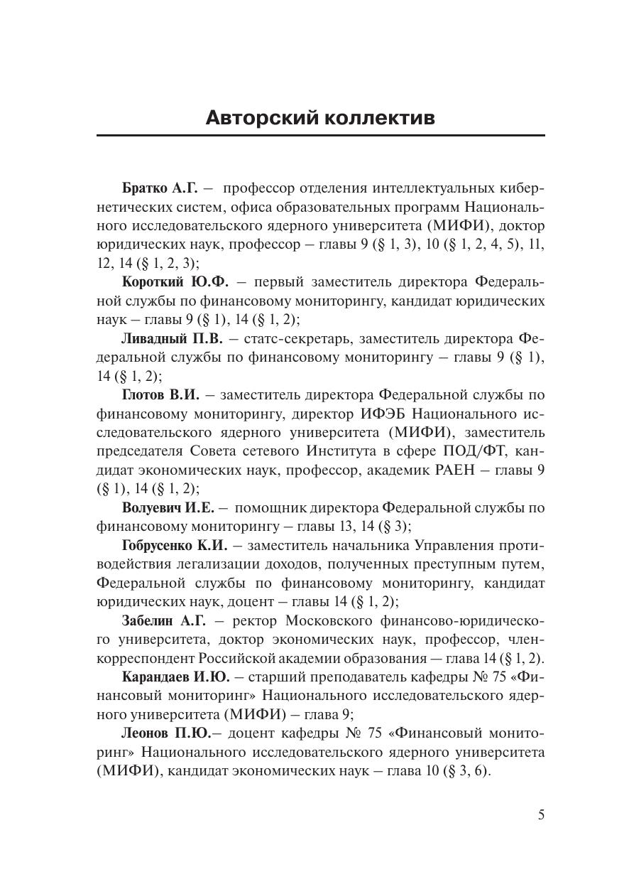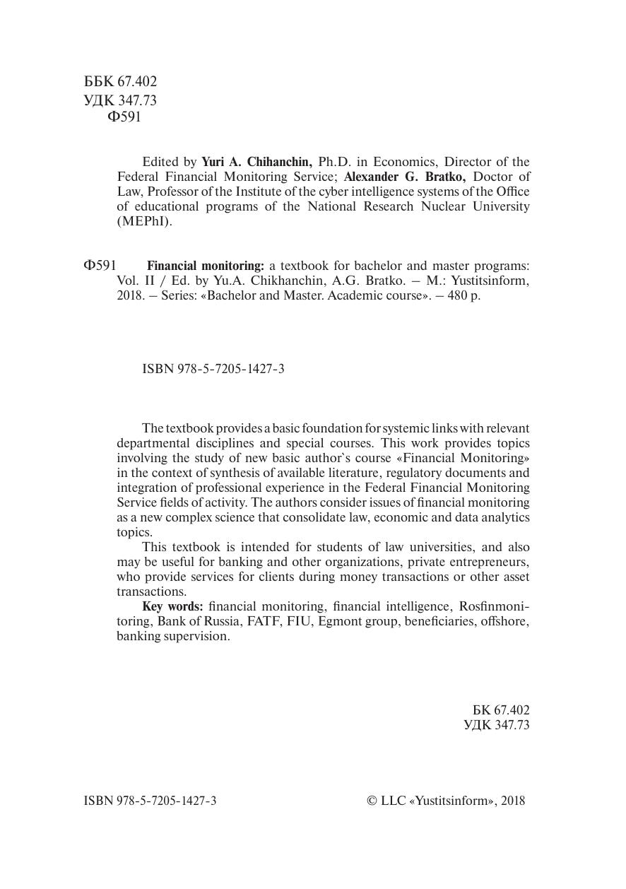 Учебное пособие служит базовой основой для системных связей с соответствующими кафедральными дисциплинами и спецкурсами. В учебном пособии представлены темы по изучению нового базового авторского курса «Финансовый мониторинг» с учетом обобщения авторами имеющейся литературы, нормативных актов и интеграции профессионального опыта в сфере деятельности Федеральной службы по финансовому мониторингу. Авторы рассматривают вопросы финансового мониторинга как новой комплексной науки, объединяющей юридические, экономические и информационно-аналитические темы. Учебное пособие предназначено для студентов юридических вузов, а также может быть полезно банкам и другим организациям,
