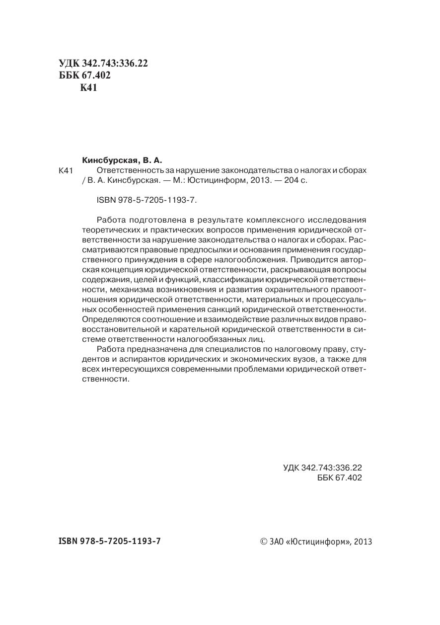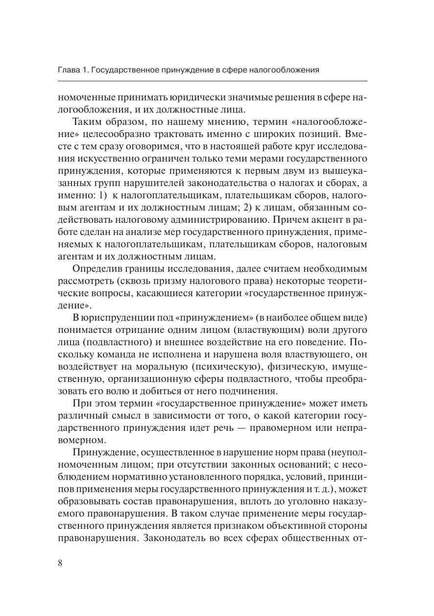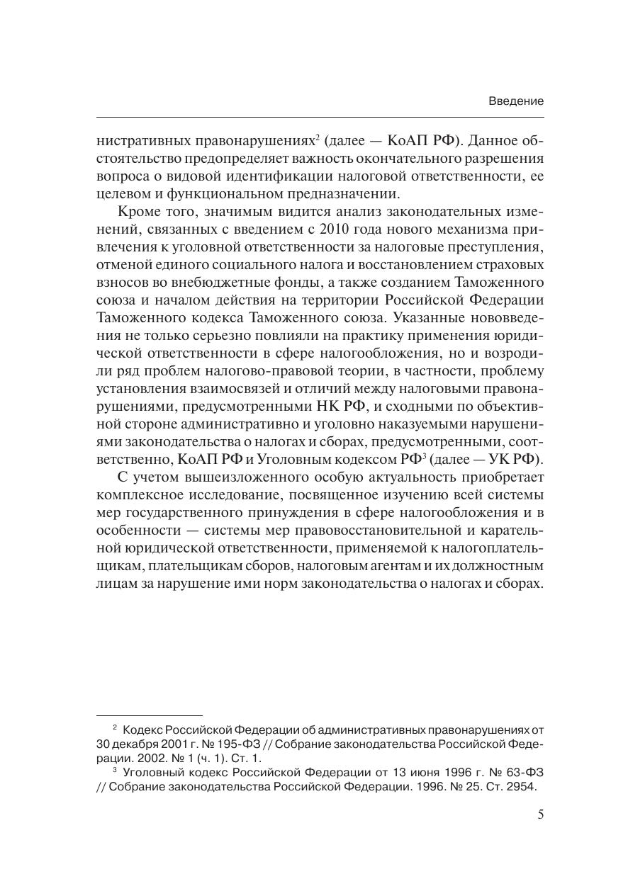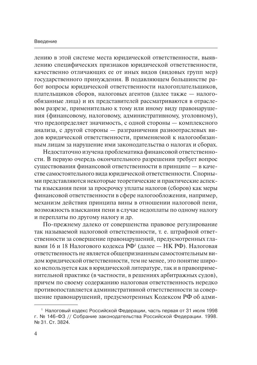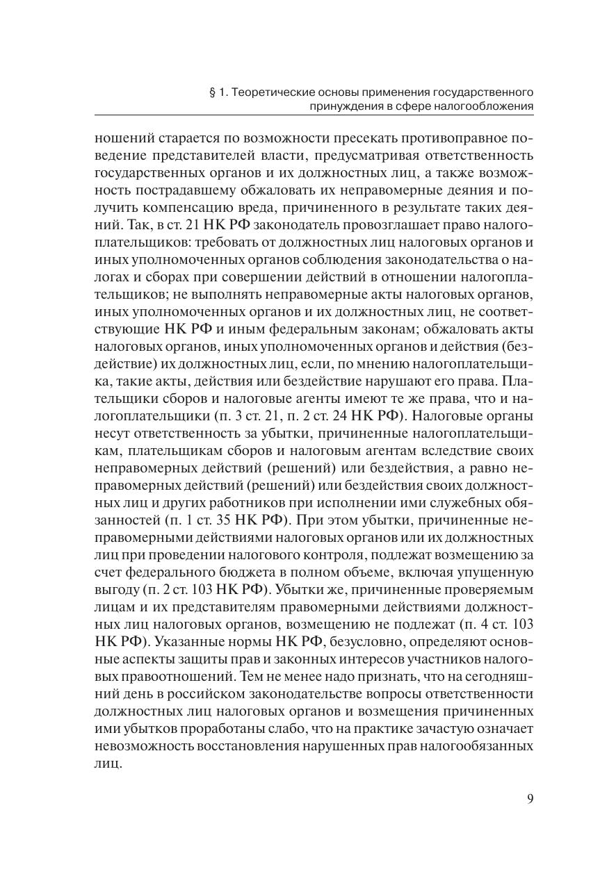 Работа подготовлена в результате комплексного исследованиятеоретических и практических вопросов применения юридической от-ветственности за нарушение законодательства о налогах и сборах. Рас-сматриваются правовые предпосылки и основания применения государ-ственного принуждения в сфере налогообложения. Приводится автор-ская концепция юридической ответственности, раскрывающая вопросысодержания, целей и функций, классификации юридической ответствен-ности, механизма возникновения и развития охранительного правоот-ношения юридической ответственности, материальных и процессуаль-ных особенностей применения санкций юридической ответственности.Определяются соотношение и взаимодействие различных видов право-восстановительной и карательной юридической ответственности в си-стеме ответственности налогообязанных лиц.Работа предназначена для специалистов по налоговому праву, сту-дентов и аспирантов юридических и экономических вузов, а также длявсех интересующихся современными проблемами юридической ответ-ственности.