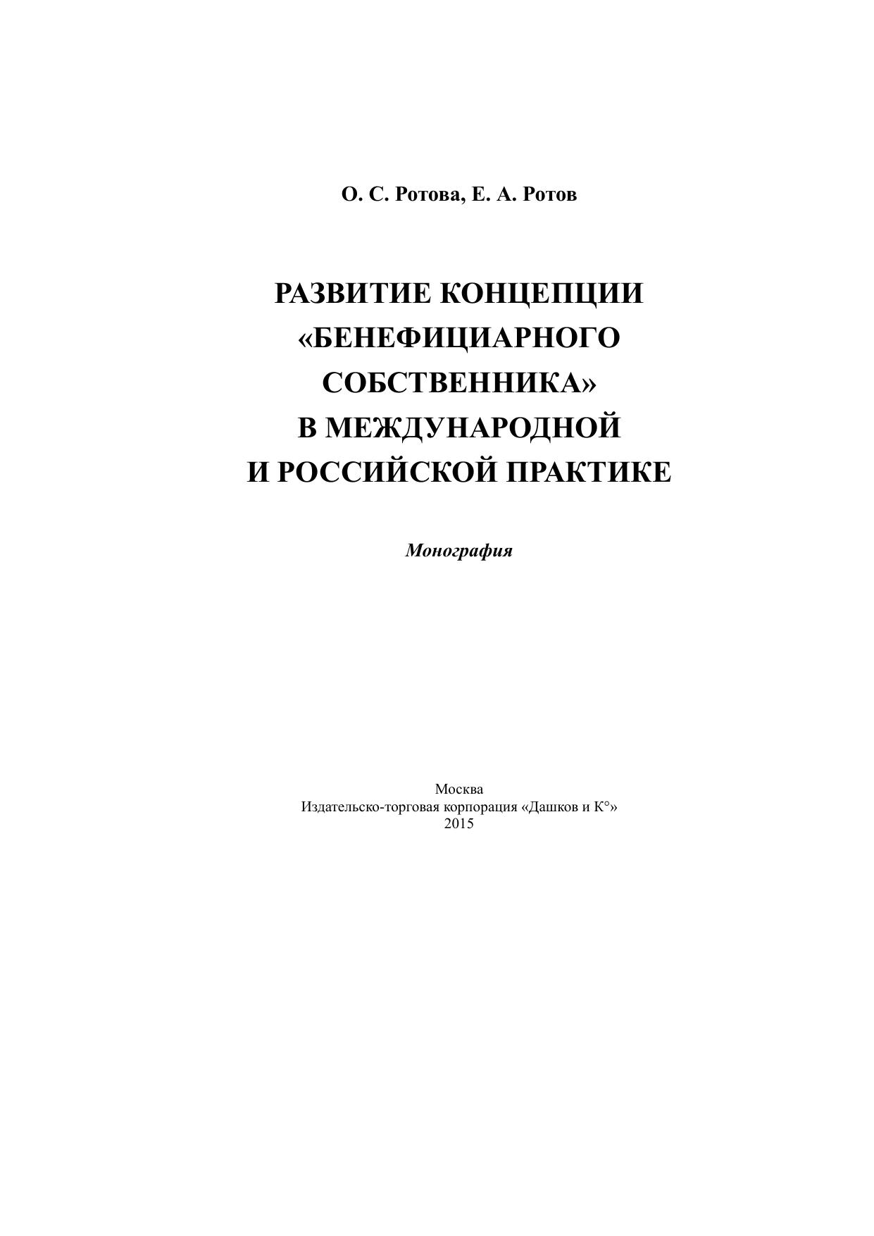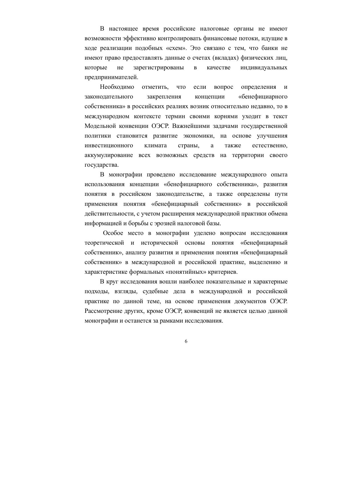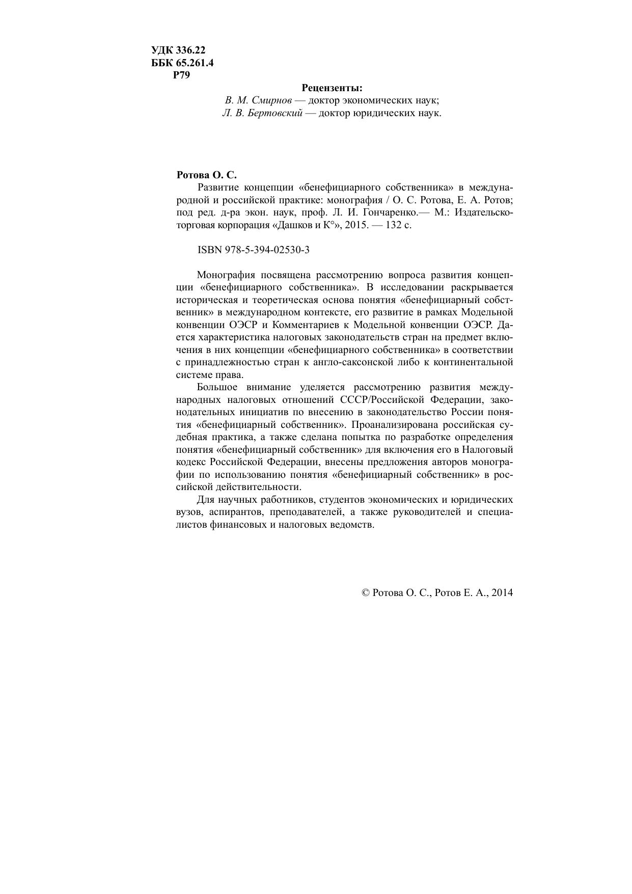 Большое внимание уделяется рассмотрению развития международных налоговых отношений СССР/Российской Федерации, законодательных инициатив по внесению в законодательство России понятия «бенефициарный собственник». Проанализирована российская судебная практика, а также сделана попытка по разработке определения понятия «бенефициарный собственник» для включения его в Налоговый кодекс Российской Федерации, внесены предложения авторов монографии по использованию понятия «бенефициарный собственник» в российской действительности.
