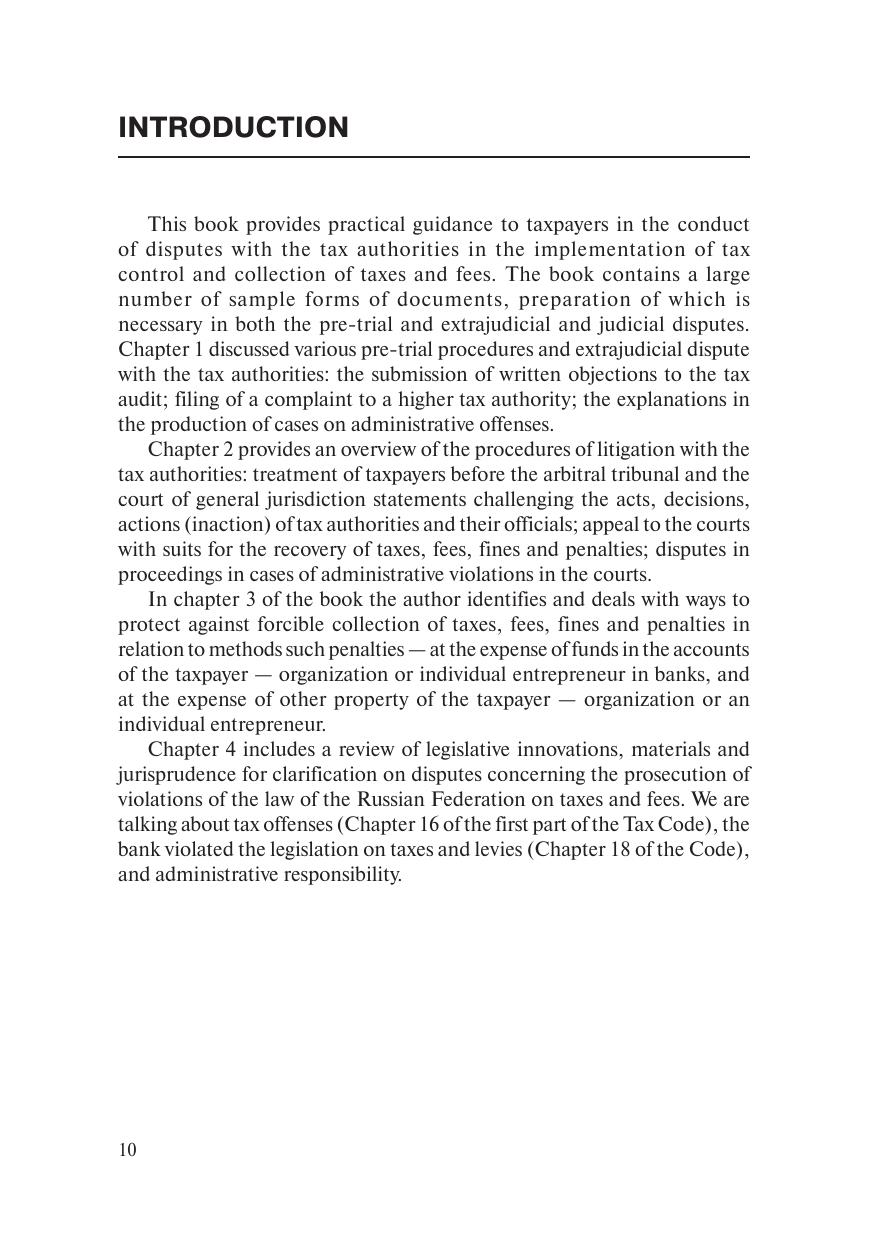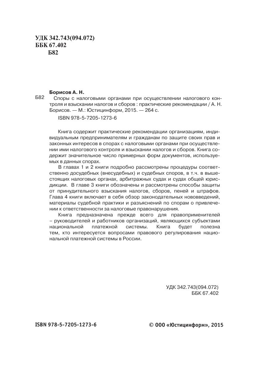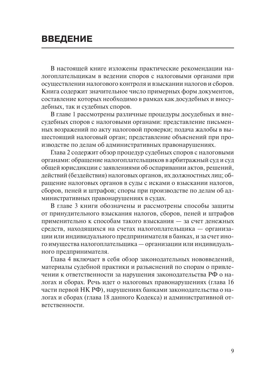 Книга содержит практические рекомендации организациям, индивидуальным предпринимателям и гражданам по защите своих прав и законных интересов в спорах с налоговыми органами при осуществлении ими налогового контроля и взыскании налогов и сборов. Книга содержит значительное число примерных форм документов, используемых в данных спорах. В главах 1 и 2 книги подробно рассмотрены процедуры соответственно досудебных (внесудебных) и судебных споров, в т.ч. в выше-стоящих налоговых органах, арбитражных судах и судах общей юрисдикции. В главе 3 книги обозначены и рассмотрены способы защиты от принудительного взыскания налогов, сборов, пеней и штрафов. Глава 4 книги включает в себя обзор законодательных нововведений, материалы судебной практики и разъяснений по спорам о привлечении к ответственности за налоговые правонарушения. Книга предназначена прежде всего для правоприменителей – руководителей и работников организаций, являющихся субъектами национальной платежной системы. Книга будет полезна тем, кто интересуется вопросами правового регулирования национальной платежной системы в России