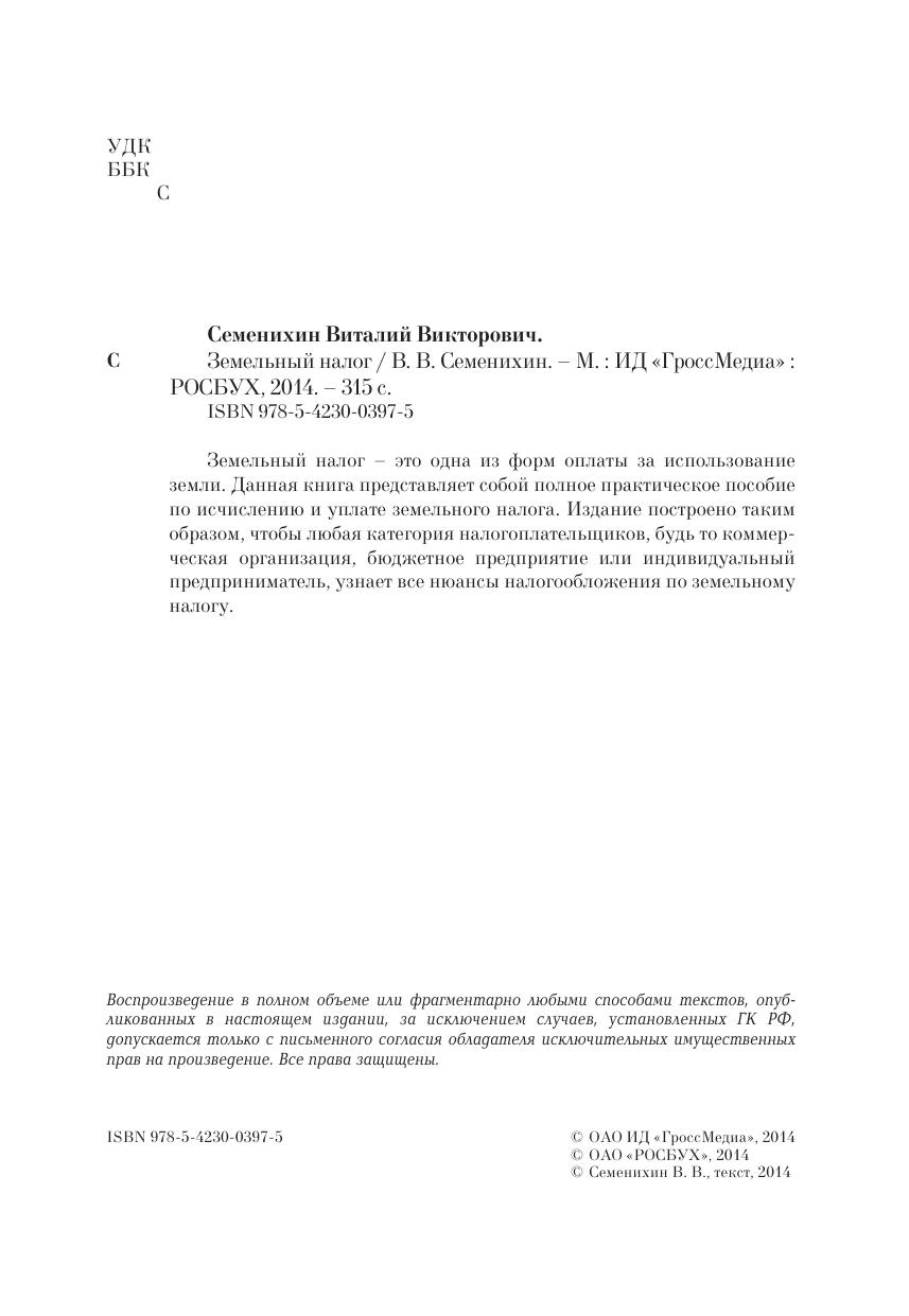 Земельный налог – это одна из форм оплаты за использование земли. Данная книга представляет собой полное практическое пособие по исчислению и уплате земельного налога. Издание построено таким образом, чтобы любая категория налогоплательщиков, будь то коммерческая организация, бюджетное предприятие или индивидуальный предприниматель, узнает все нюансы налогообложения по земельному налогу