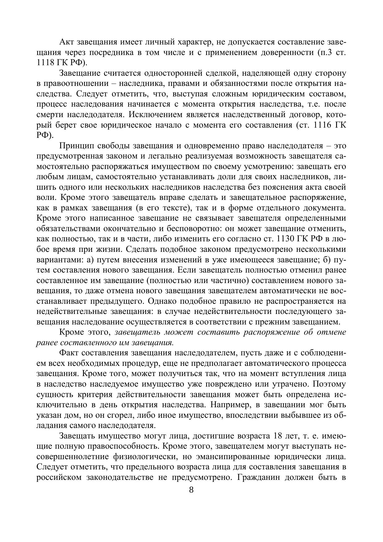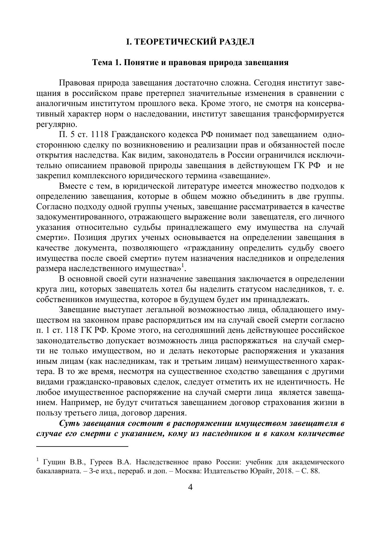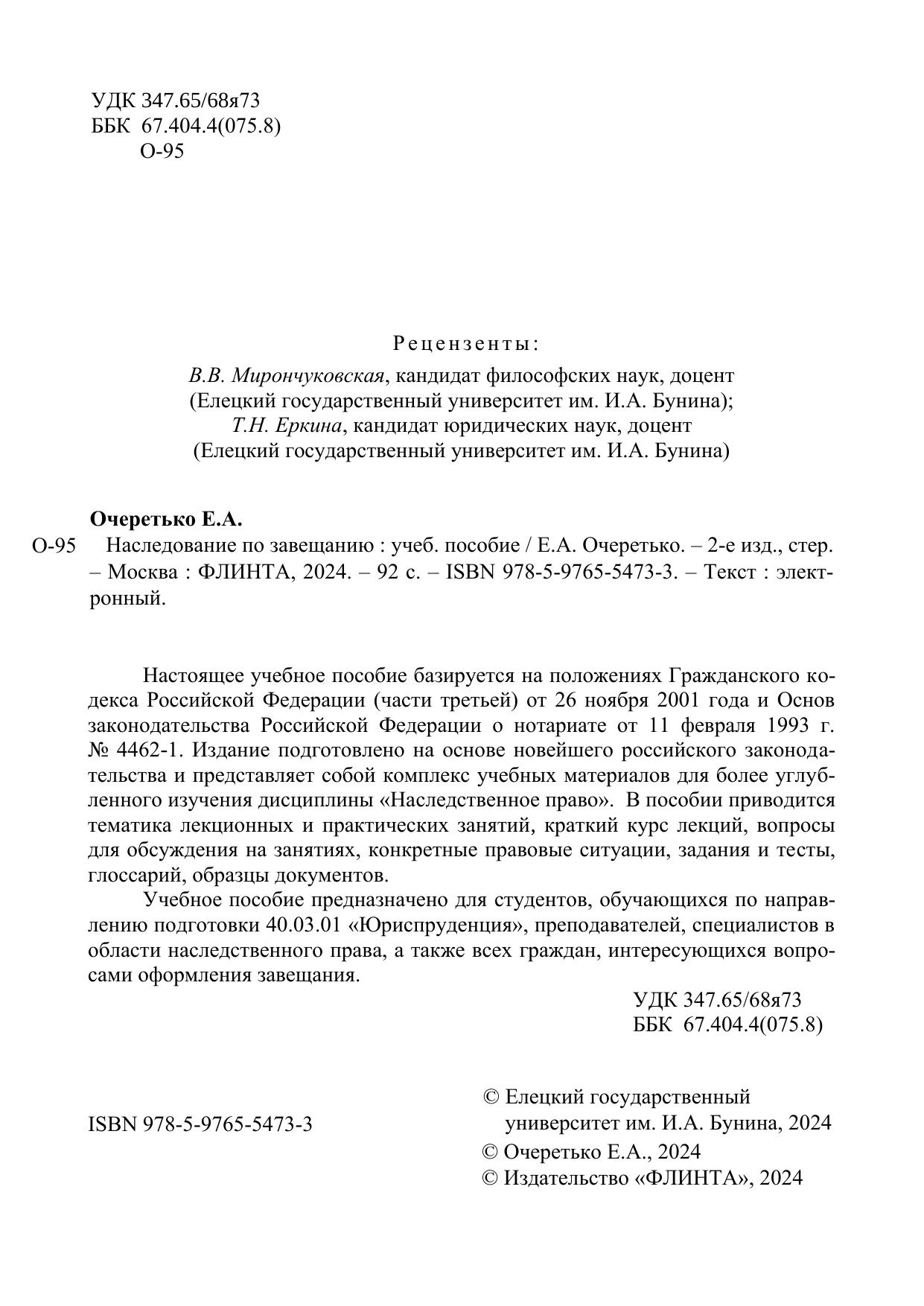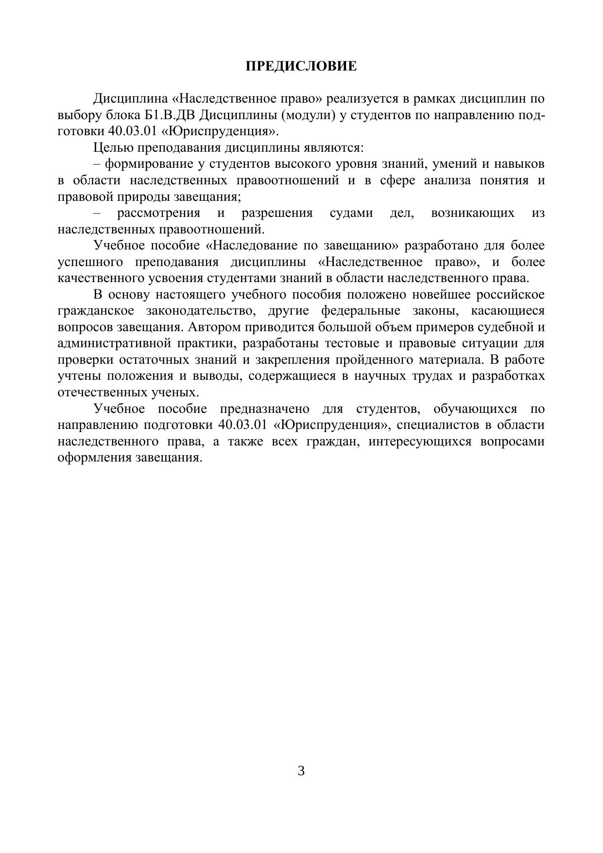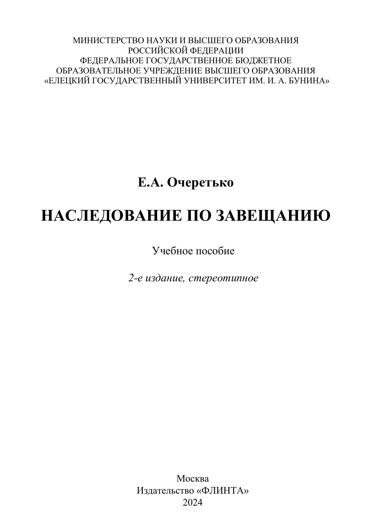 Настоящее учебное пособие базируется на положениях Гражданского кодекса Российской Федерации (части третьей) от 26 ноября 2001 года и Основ законодательства Российской Федерации о нотариате от 11 февраля 1993 г. № 4462-1. Издание подготовлено на основе новейшего российского законодательства и представляет собой комплекс учебных материалов для более углубленного изучения дисциплины «Наследственное право». В пособии приводится тематика лекционных и практических занятий, краткий курс лекций, вопросы для обсуждения на занятиях, конкретные правовые ситуации, задания и тесты, глоссарий, образцы документов. Учебное пособие предназначено для студентов, обучающихся по направлению подготовки 40.03.01 «Юриспруденция», преподавателей, специалистов в области наследственного права, а также всех граждан, интересующихся вопросами оформления завещания.