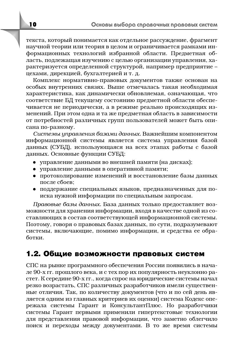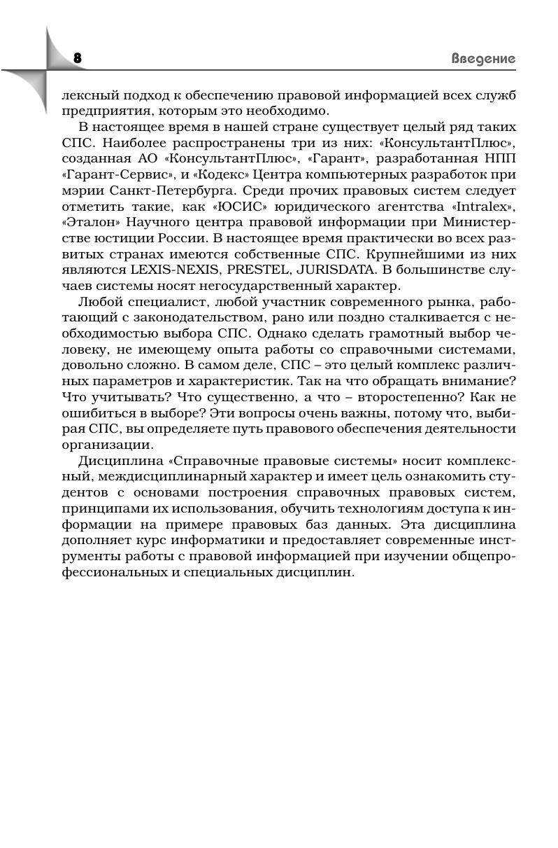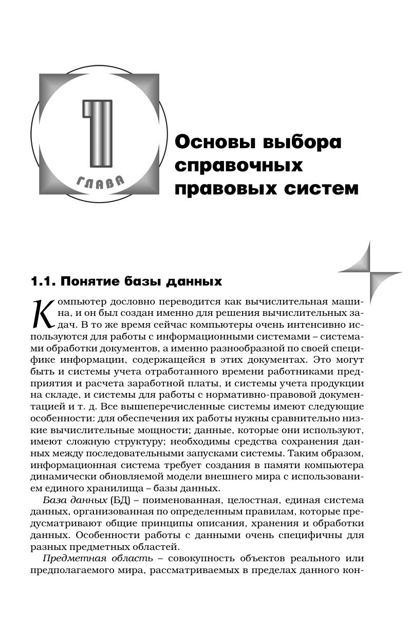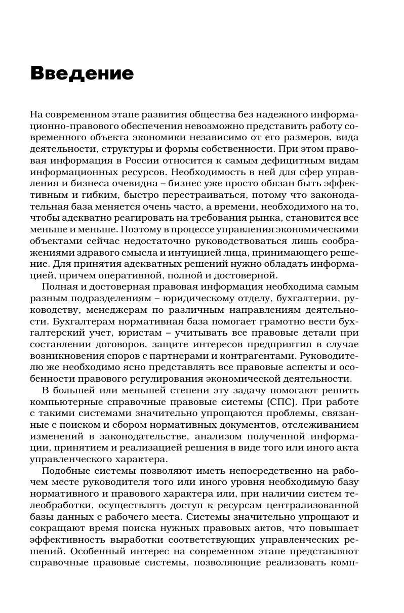 Любой специалист, любой участник современного рынка, работающий с законодательством, рано или поздно сталкивается с необходимостью выбора справочных правовых систем (СПС). Однако сделать оптимальный выбор довольно сложно, поскольку СПС - это целый комплекс различных параметров и характеристик. Так на что обращать внимание? Что учитывать? Что существенно, а что второстепенно? Как не ошибиться в выборе? Эти вопросы очень важны, потому что, выбирая СПС, вы определяете путь правового обеспечения деятельности организации. Учебное пособие предназначено для студентов нетехнических высших учебных заведений.