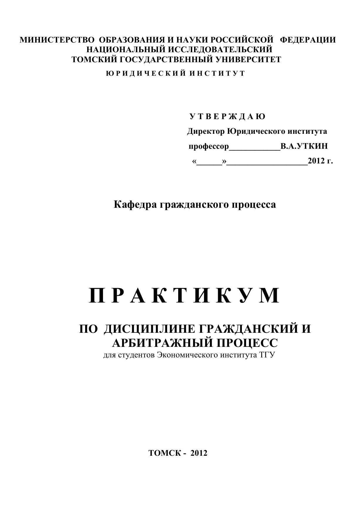 Практикум по дисциплине Гражданский и арбитражный процесс содержит календарный и тематический планы практических занятий, перечень тем, основных вопросов, литературу, нормативный материал и задачи, которые студенты 4 курса дневного отделения Экономического института ТГУ должны изучить и решить в 8-ом семестре обучения. Кроме того, практикум содержит вопросы для сдачи зачета по дисциплине Гражданский и арбитражный процесс.