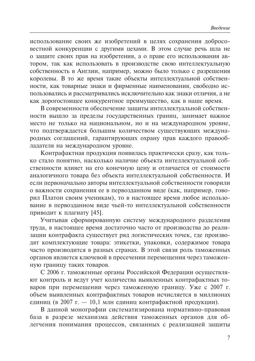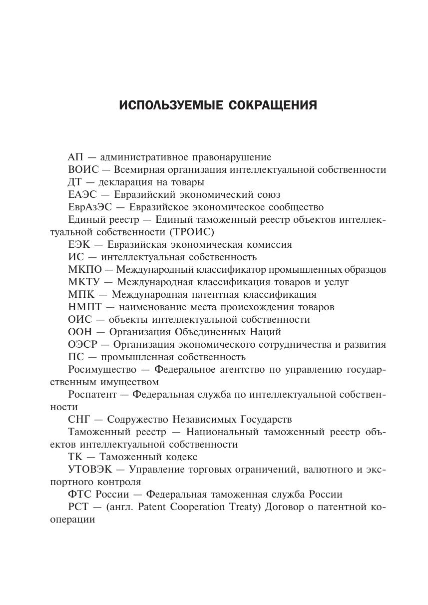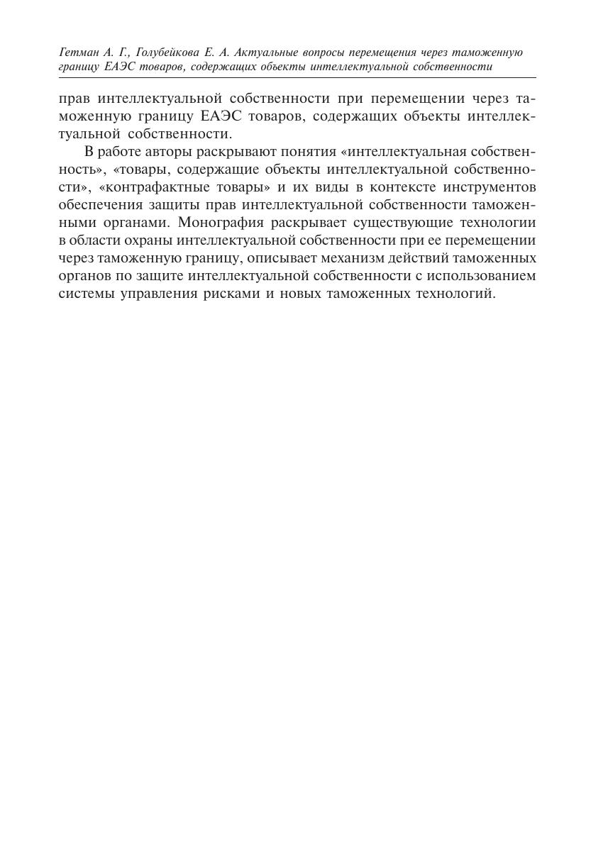 Монография содержит анализ нормативного методического материала вопросов обеспечения защиты прав на объекты интеллектуальной собственности таможенными органами и рассматривает развитие механизма таможенного контроля в отношении перемещаемых через таможенную границу товаров, содержащих объекты интеллектуальной собственности. Рассмотрены актуальные вопросы рисков, связанных с перемещением через таможенную границу товаров, содержащих объекты интеллектуальной собственности. Подробно раскрыты принципы таможенного контроля в отношении особой категории товаров — содержащих объекты интеллектуальной собственности. Указаны особенности таможенного декларирования таких товаров, приведена организационная структура таможенных органов в рамках обеспечения защиты прав интеллектуальной собственности. Определены основные понятия: «контрафактные товары», «фальсифицированные товары», «поддельные товары», «параллельный импорт». Издание предназначено для специалистов в сфере внешнеэкономической деятельности, таможенного дела и логистики, а также преподавателей, аспирантов, магистрантов и студентов таможенных специальных вузов, слушателей факультета повышения квалификации, сотрудников таможенных органов государств — членов ЕАЭС, а также для широкого круга специалистов, чья деятельность связана с внешней торговлей.