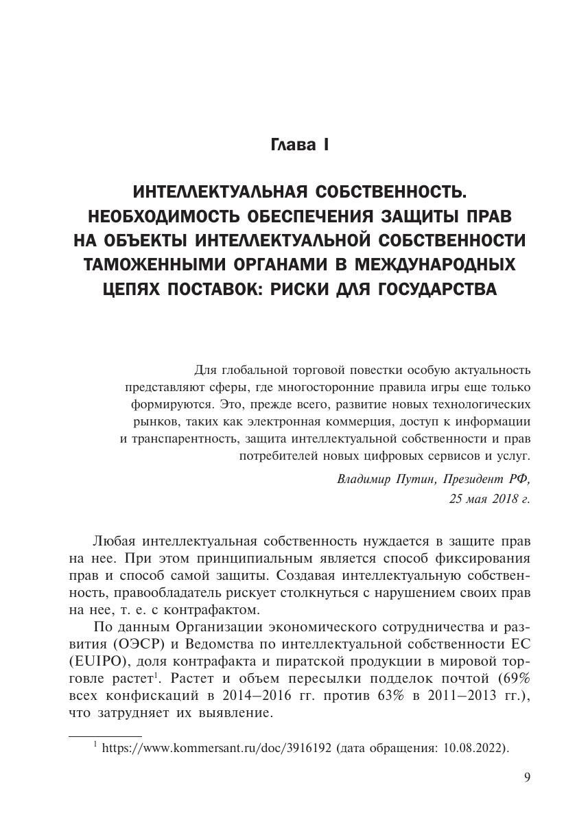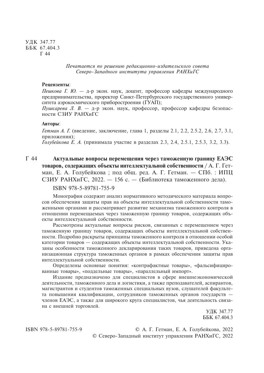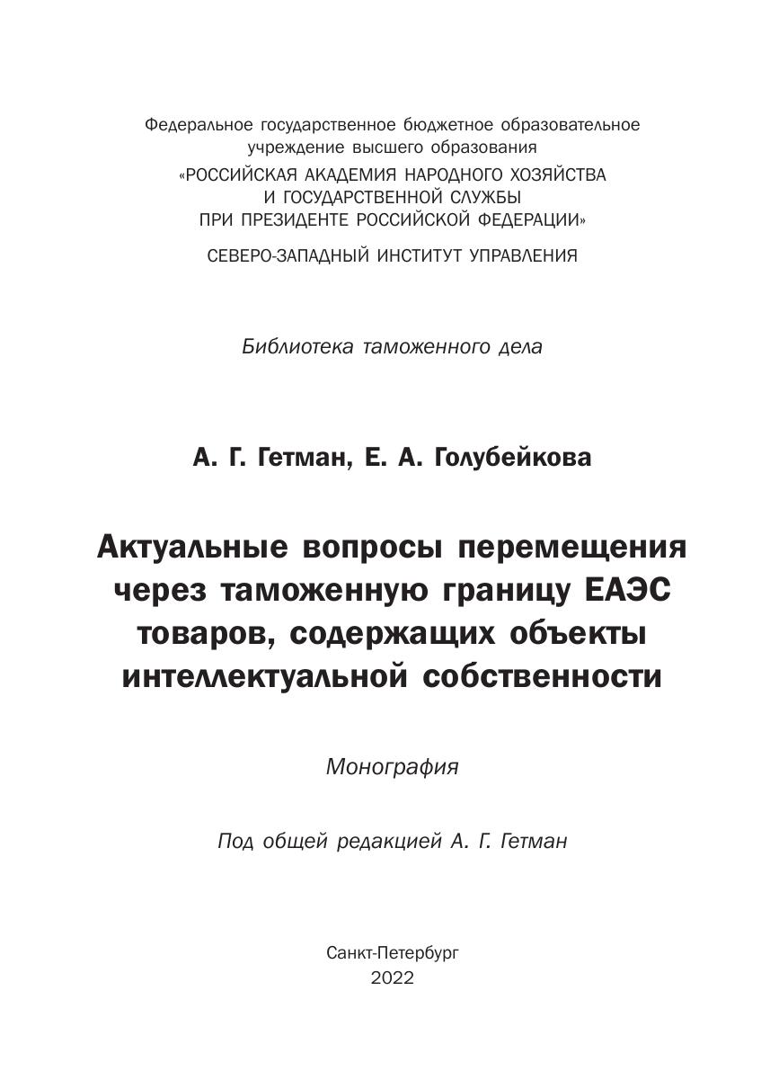 Монография содержит анализ нормативного методического материала вопросов обеспечения защиты прав на объекты интеллектуальной собственности таможенными органами и рассматривает развитие механизма таможенного контроля в отношении перемещаемых через таможенную границу товаров, содержащих объекты интеллектуальной собственности. Рассмотрены актуальные вопросы рисков, связанных с перемещением через таможенную границу товаров, содержащих объекты интеллектуальной собственности. Подробно раскрыты принципы таможенного контроля в отношении особой категории товаров — содержащих объекты интеллектуальной собственности. Указаны особенности таможенного декларирования таких товаров, приведена организационная структура таможенных органов в рамках обеспечения защиты прав интеллектуальной собственности. Определены основные понятия: «контрафактные товары», «фальсифицированные товары», «поддельные товары», «параллельный импорт». Издание предназначено для специалистов в сфере внешнеэкономической деятельности, таможенного дела и логистики, а также преподавателей, аспирантов, магистрантов и студентов таможенных специальных вузов, слушателей факультета повышения квалификации, сотрудников таможенных органов государств — членов ЕАЭС, а также для широкого круга специалистов, чья деятельность связана с внешней торговлей.