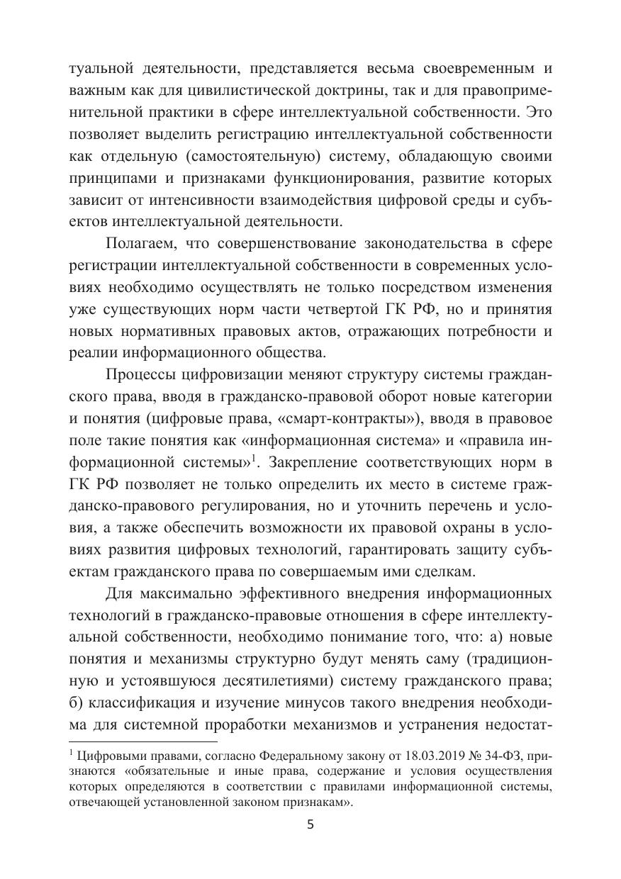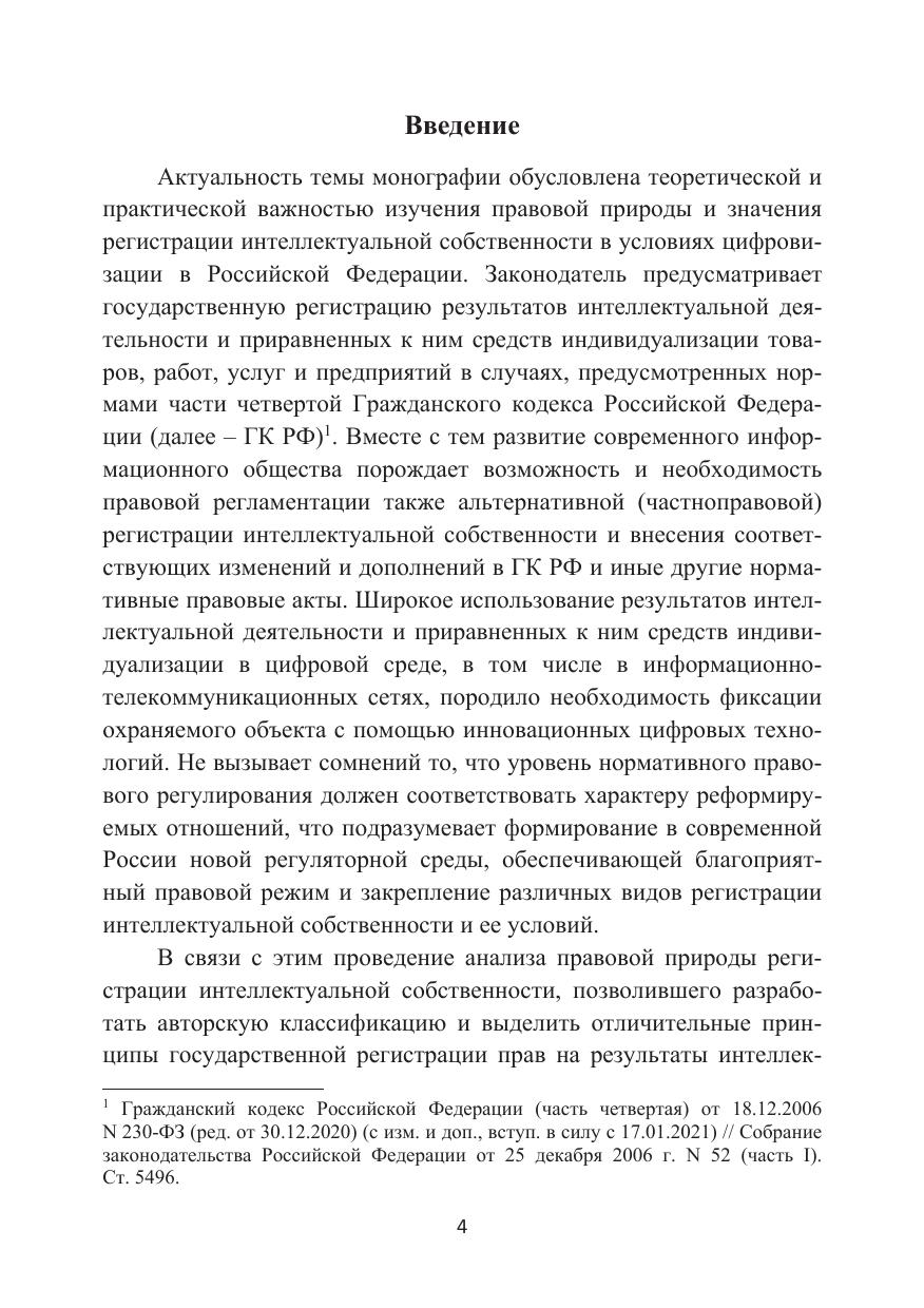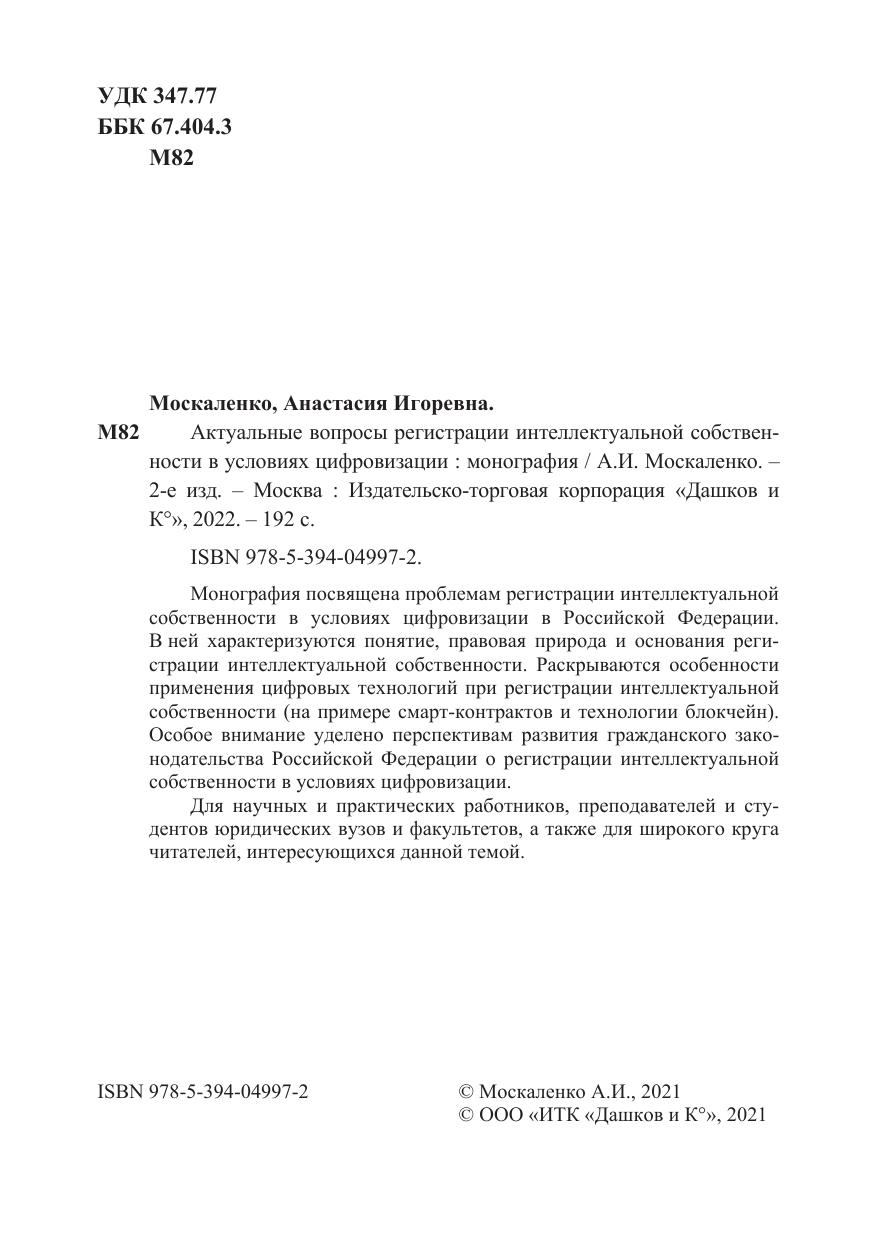 Монография посвящена проблемам регистрации интеллектуальной собственности в условиях цифровизации в Российской Федерации. В ней характеризуются понятие, правовая природа и основания регистрации интеллектуальной собственности. Раскрываются особенности применения цифровых технологий при регистрации интеллектуальной собственности (на примере смарт-контрактов и технологии блокчейн). Особое внимание уделено перспективам развития гражданского законодательства Российской Федерации о регистрации интеллектуальной собственности в условиях цифровизации. Для научных и практических работников, преподавателей и студентов юридических вузов и факультетов, а также для
