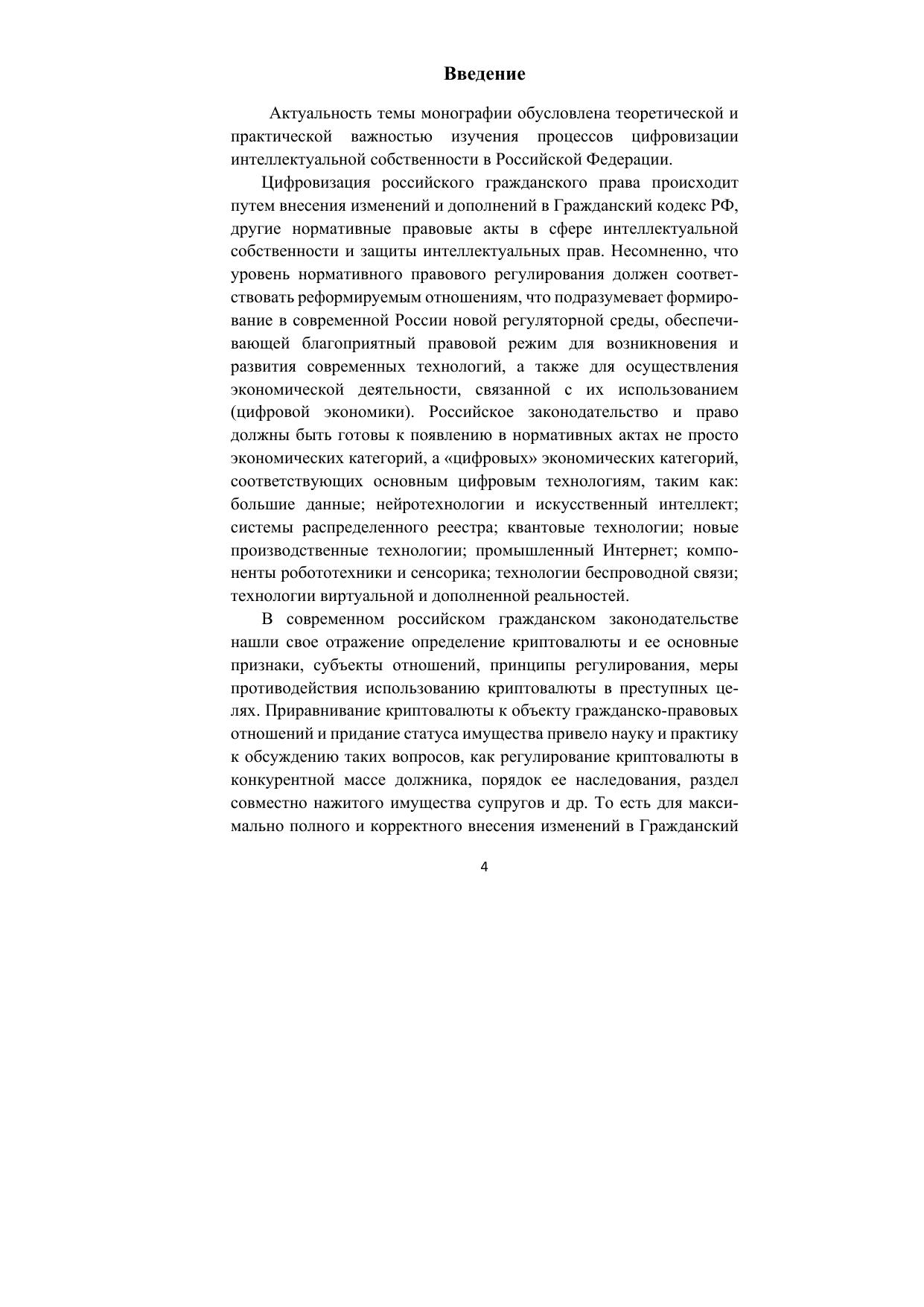 Монография посвящена актуальной проблеме цифровизации интеллектуальной собственности в гражданском праве Российской Федерации. Рассматриваются новые направления развития интеллектуальной собственности в условиях цифровой экономики. Анализируются тенденции, закономерности и особенности трансформации понятия и сущности интеллектуальной собственности в условиях цифровизации, а также обосновываются практические рекомендации по совершенствованию гражданского законодательства РФ об интеллектуальной собственности в связи с переходом к новой цифровой эпохе.