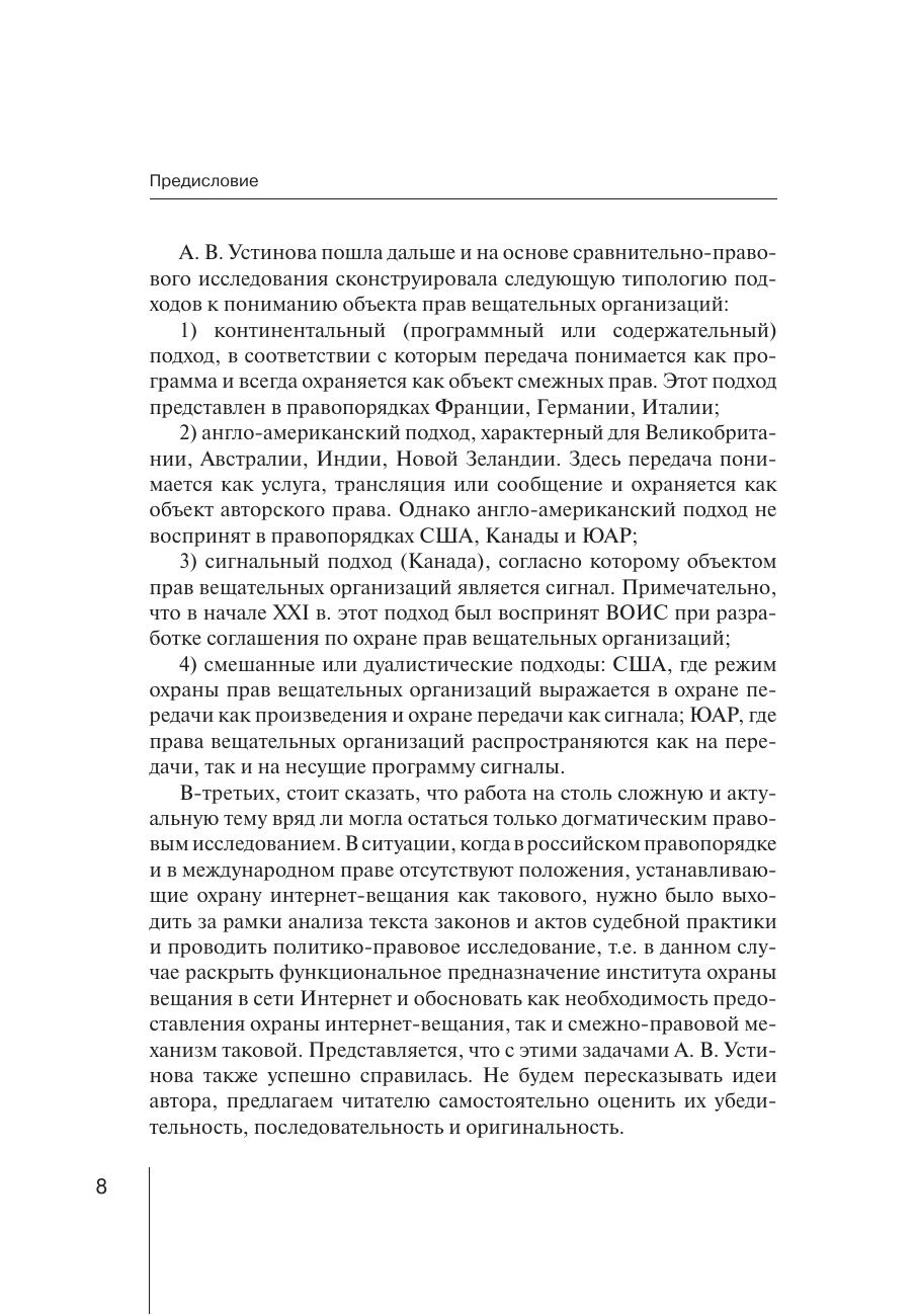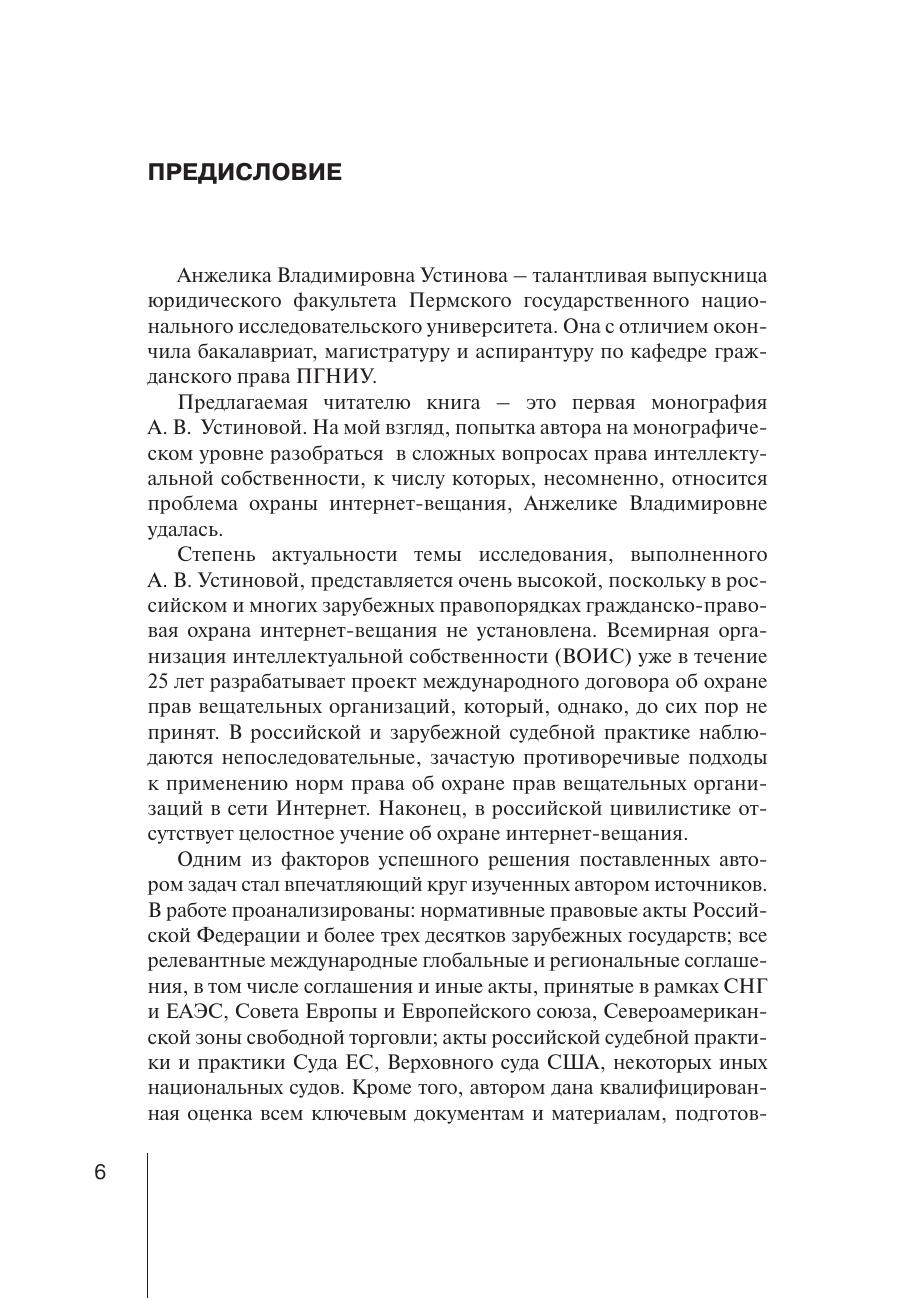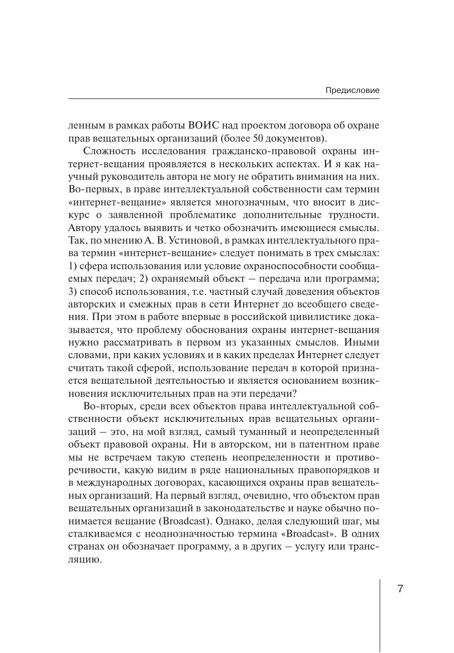 В монографии представлены результаты исследования теоретических и практических проблем охраны интернет-вещания. Дается анализ российской и зарубежной доктрины, законодательства и правоприменительной практики, касающихся обоснования предоставления охраны интернет-вещания, определения условий и объекта такой охраны, а также границ исключительного смежного с авторским правом права на использование сетевого вещания. Представлен авторский взгляд на механизм смежно-правовой охраны исключительных прав на передачи сетевого вещания.