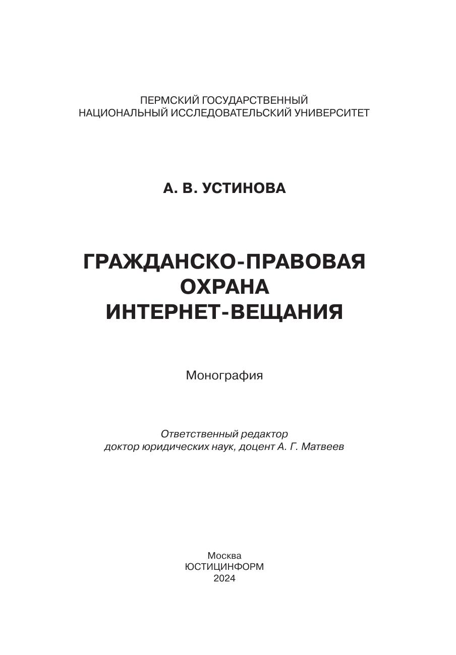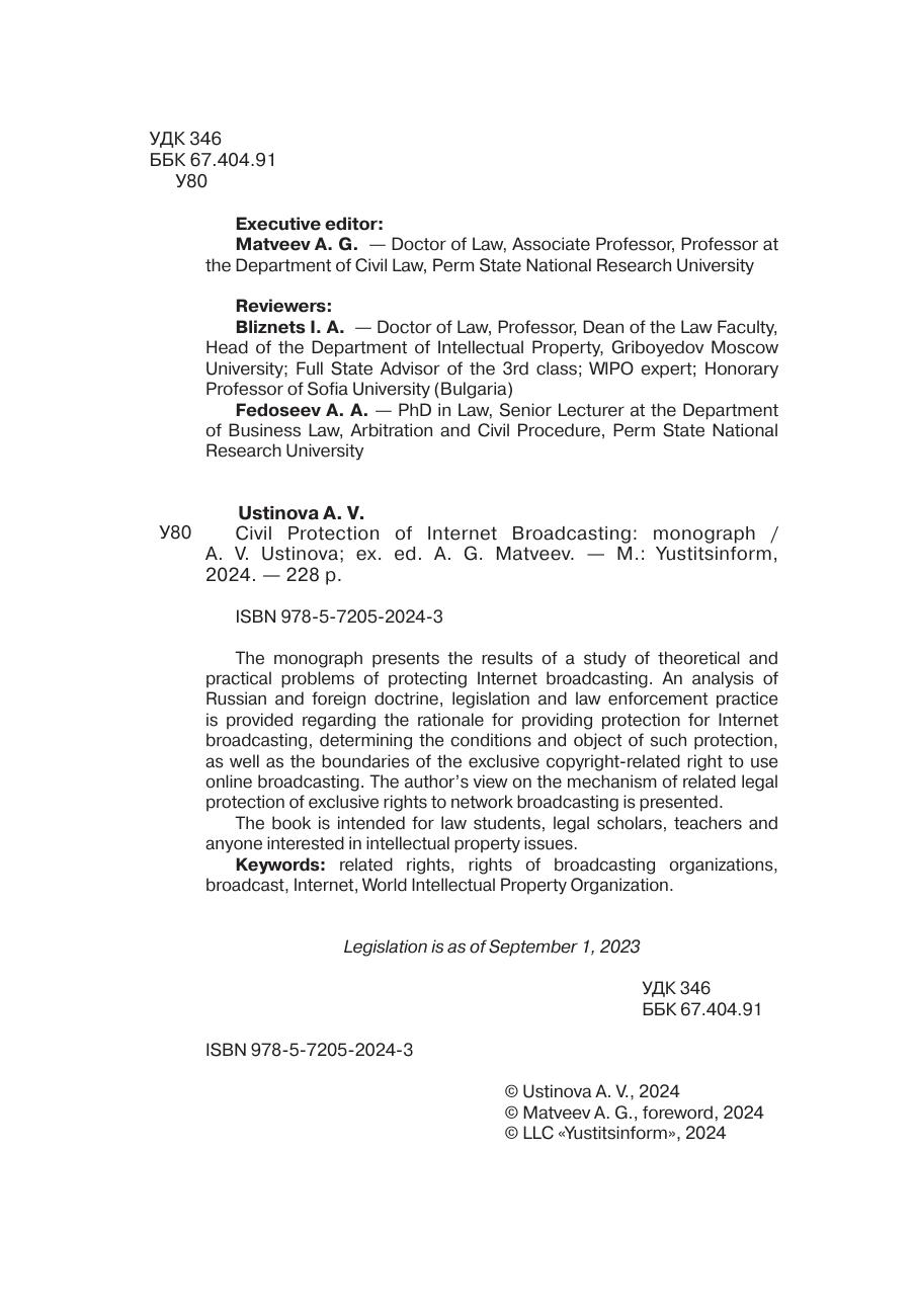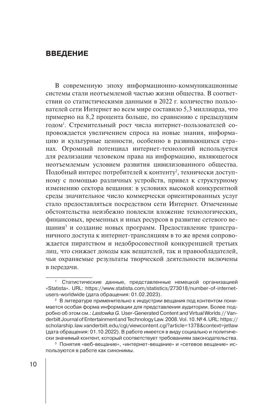 В монографии представлены результаты исследования теоретических и практических проблем охраны интернет-вещания. Дается анализ российской и зарубежной доктрины, законодательства и правоприменительной практики, касающихся обоснования предоставления охраны интернет-вещания, определения условий и объекта такой охраны, а также границ исключительного смежного с авторским правом права на использование сетевого вещания. Представлен авторский взгляд на механизм смежно-правовой охраны исключительных прав на передачи сетевого вещания.