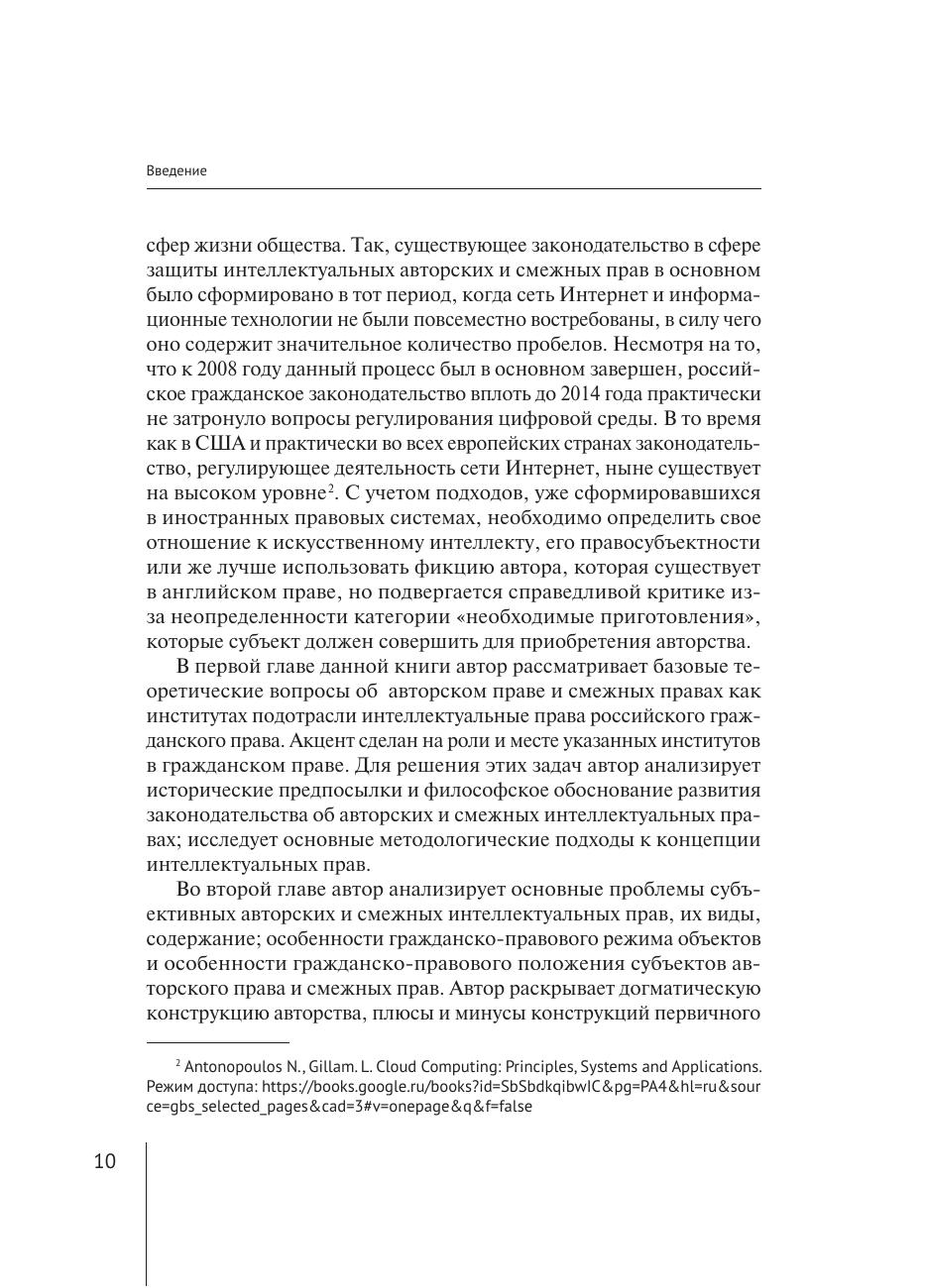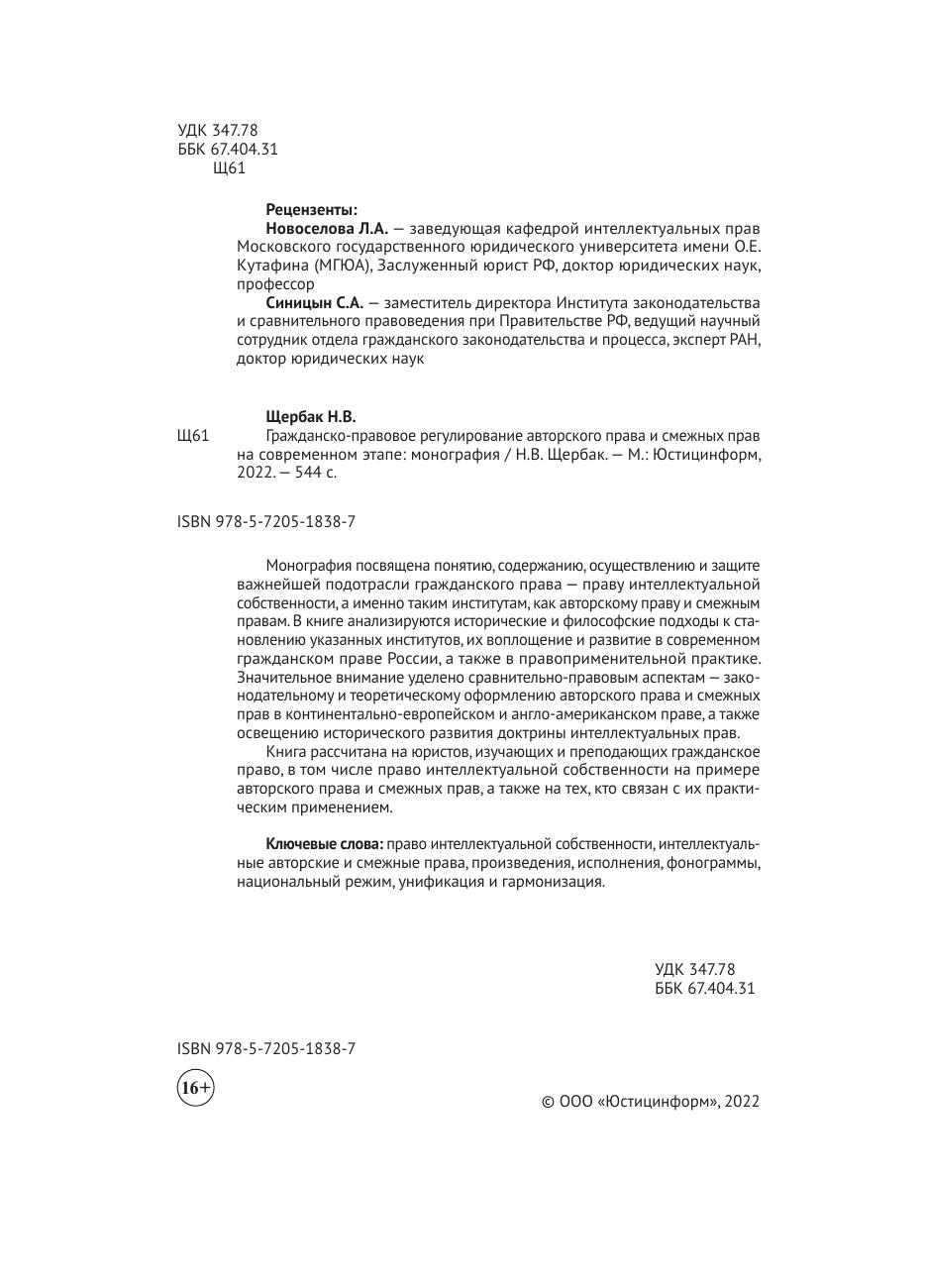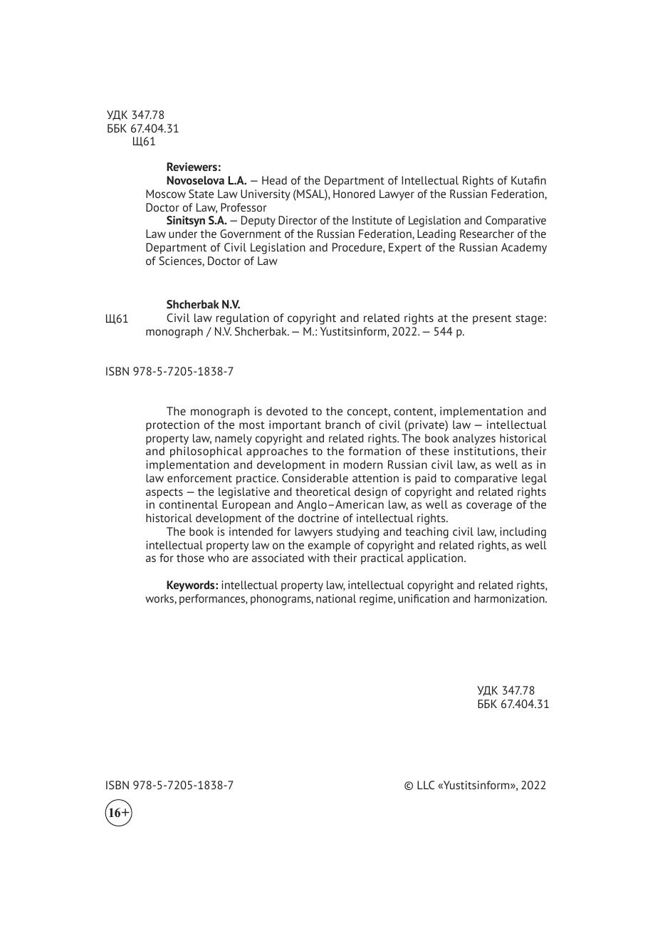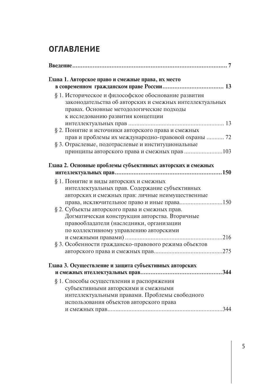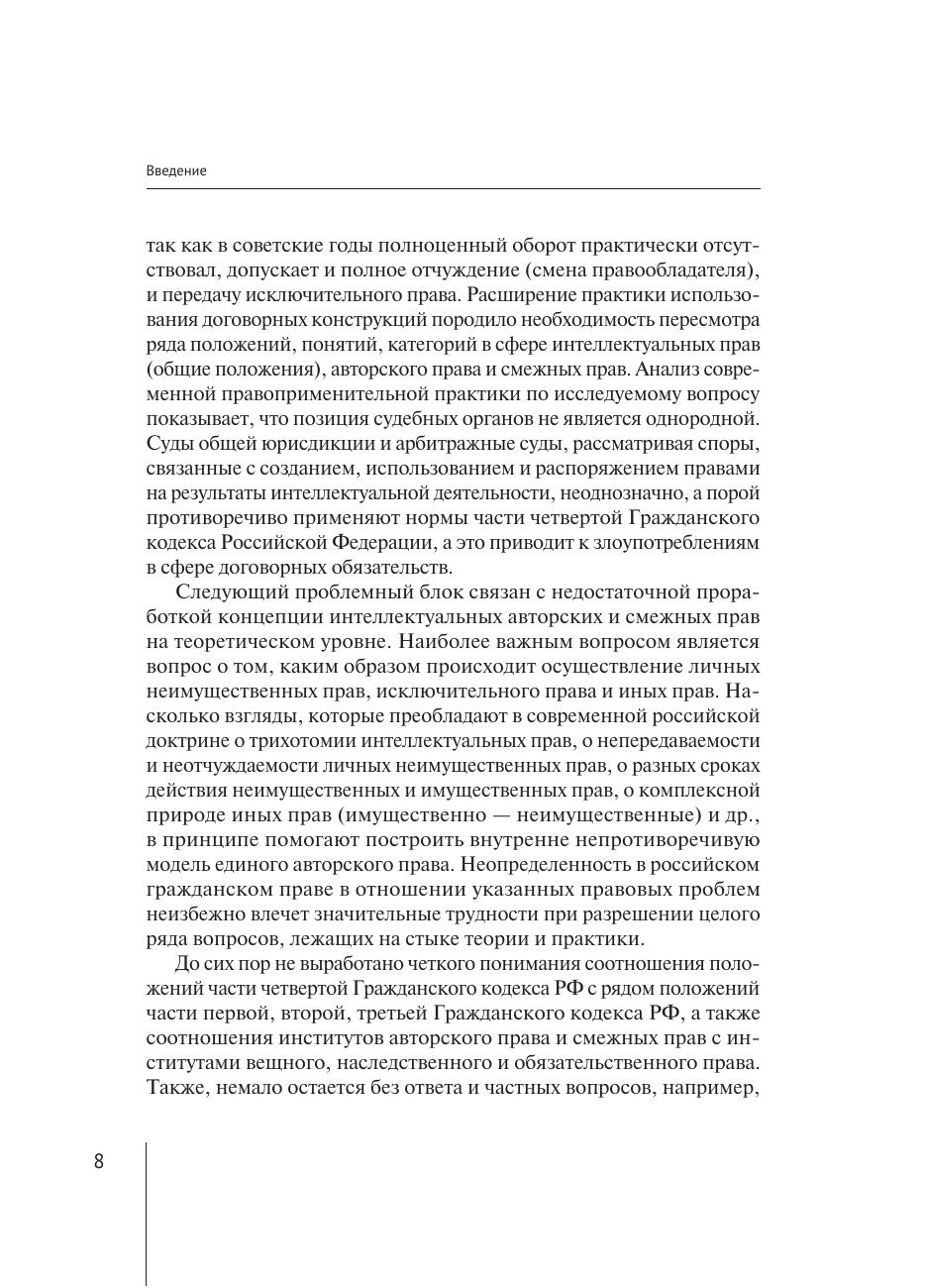 Монография посвящена понятию, содержанию, осуществлению и защите важнейшей подотрасли гражданского права — праву интеллектуальной собственности, а именно таким институтам, как авторскому праву и смежным правам. В книге анализируются исторические и философские подходы к становлению указанных институтов, их воплощение и развитие в современном гражданском праве России, а также в правоприменительной практике. Значительное внимание уделено сравнительно-правовым аспектам — законодательному и теоретическому оформлению авторского права и смежных прав в континентально-европейском и англо-американском праве, а также освещению исторического развития доктрины интеллектуальных прав. Книга рассчитана на юристов, изучающих и преподающих гражданское право, в том числе право интеллектуальной собственности на примере авторского права и смежных прав, а также на тех, кто связан с их практическим применением.