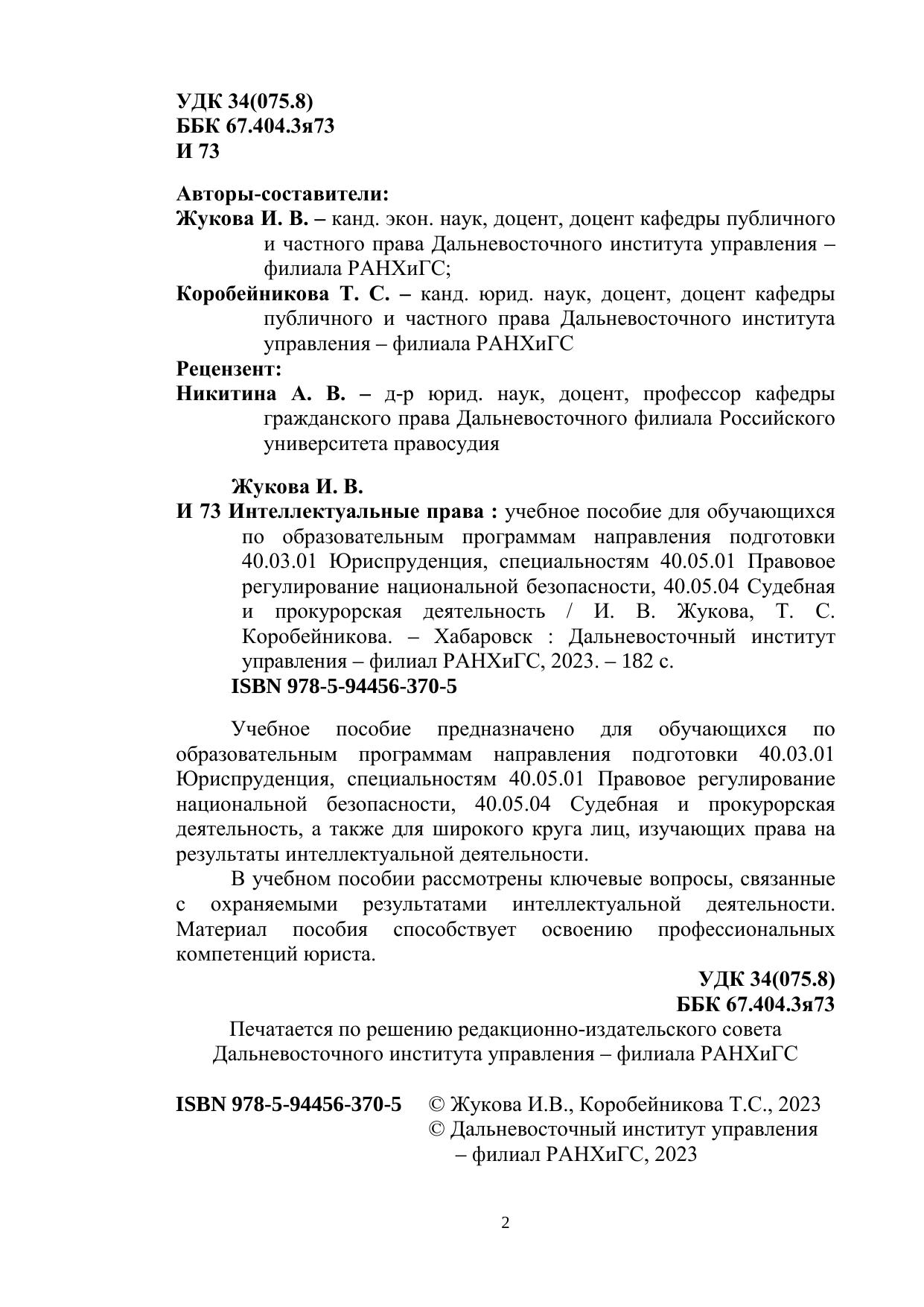 Учебное пособие предназначено для обучающихся по образовательным программам направления подготовки 40.03.01 Юриспруденция, специальностям 40.05.01 Правовое регулирование национальной безопасности, 40.05.04 Судебная и прокурорская деятельность, а также для широкого круга лиц, изучающих права на результаты интеллектуальной деятельности. В учебном пособии рассмотрены ключевые вопросы, связанные с охраняемыми результатами интеллектуальной деятельности. Материал пособия способствует освоению профессиональных компетенций юриста.