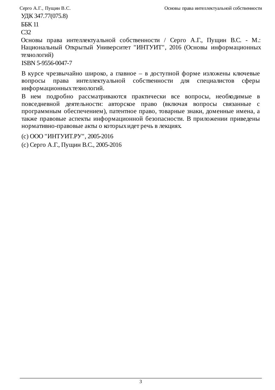В курсе чрезвычайно широко, а главное – в доступной форме изложены ключевые вопросы права интеллектуальной собственности для специалистов сферы информационных технологий. В нем подробно рассматриваются практически все вопросы, необходимые в повседневной деятельности: авторское право (включая вопросы связанные с программным обеспечением), патентное право, товарные знаки, доменные имена, а также правовые аспекты информационной безопасности. В приложении приведены нормативно-правовые акты о которых идет речь в лекциях.