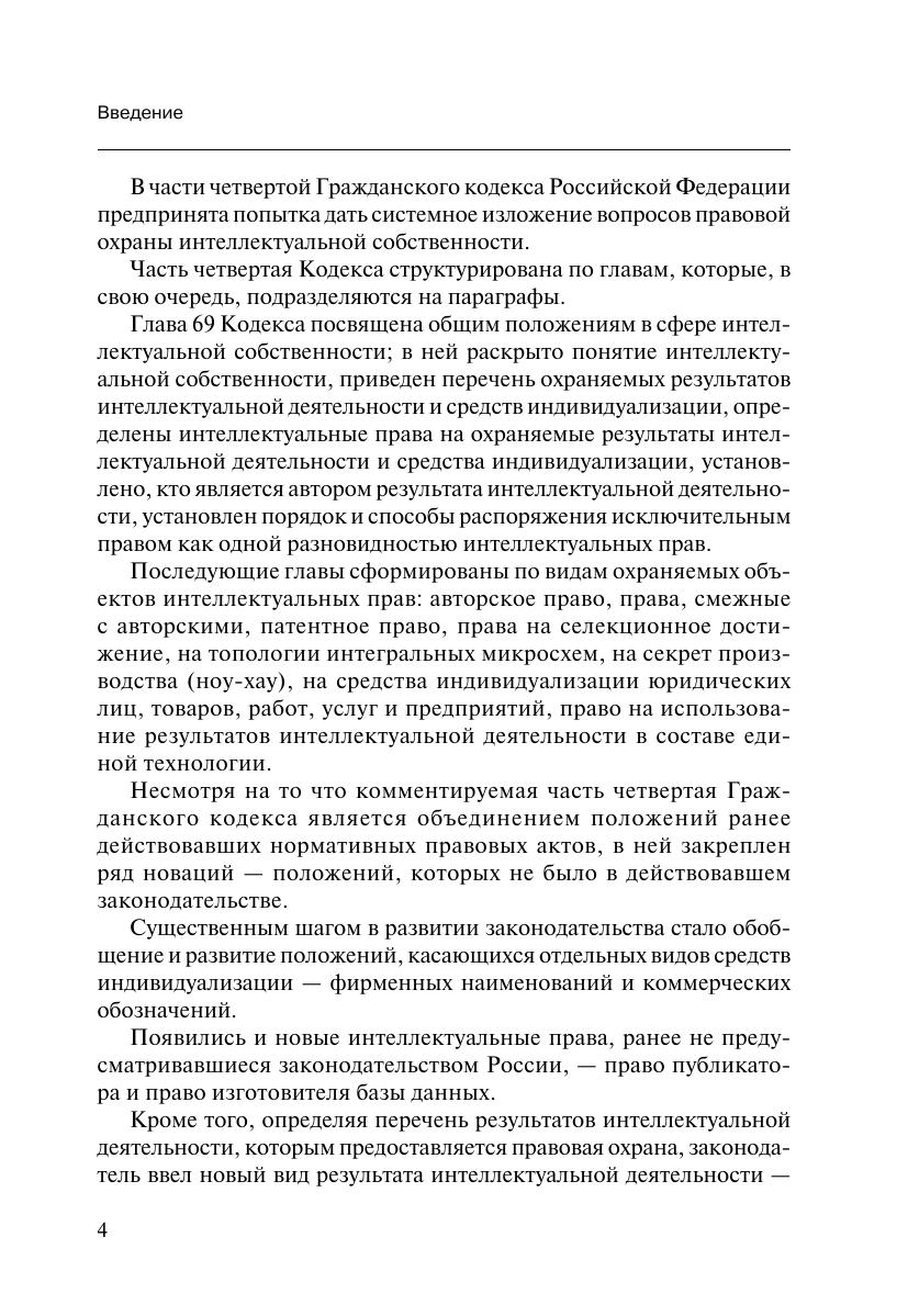 Постатейный комментарий рассматривает положения части четвертой Гражданского кодекса Российской Федерации в актуальной редакции с учетом постановлений Пленумов Верховного Суда РФ и Пленума Высшего Арбитражного Суда РФ, международных договоров в области интеллектуальной собственности, участницей которых является РФ, а также принятых в соответствии с частью четвертой ГК РФ нормативных правовых актов.Книга адресована специалистам в области защиты интеллектуальных прав, а также широкому кругу читателей, интересующихся этой проблемой.