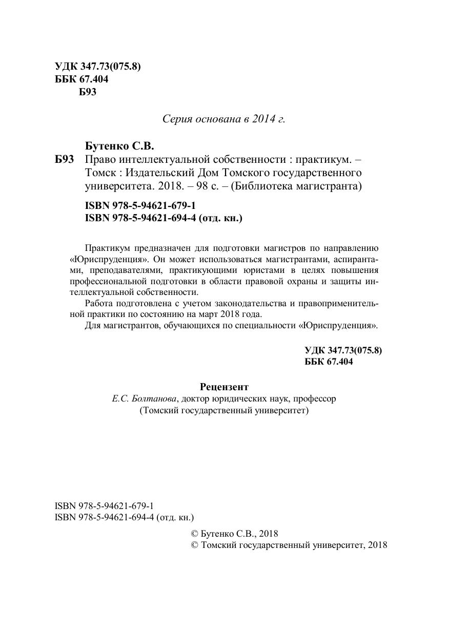 Практикум предназначен для подготовки магистров по направлению «Юриспруденция». Он может использоваться магистрантами, аспирантами, преподавателями, практикующими юристами в целях повышения профессиональной подготовки в области правовой охраны и защиты интеллектуальной собственности. Работа подготовлена с учетом законодательства и правоприменительной практики по состоянию на март 2018 года. Для магистрантов, обучающихся по специальности «Юриспруденция».