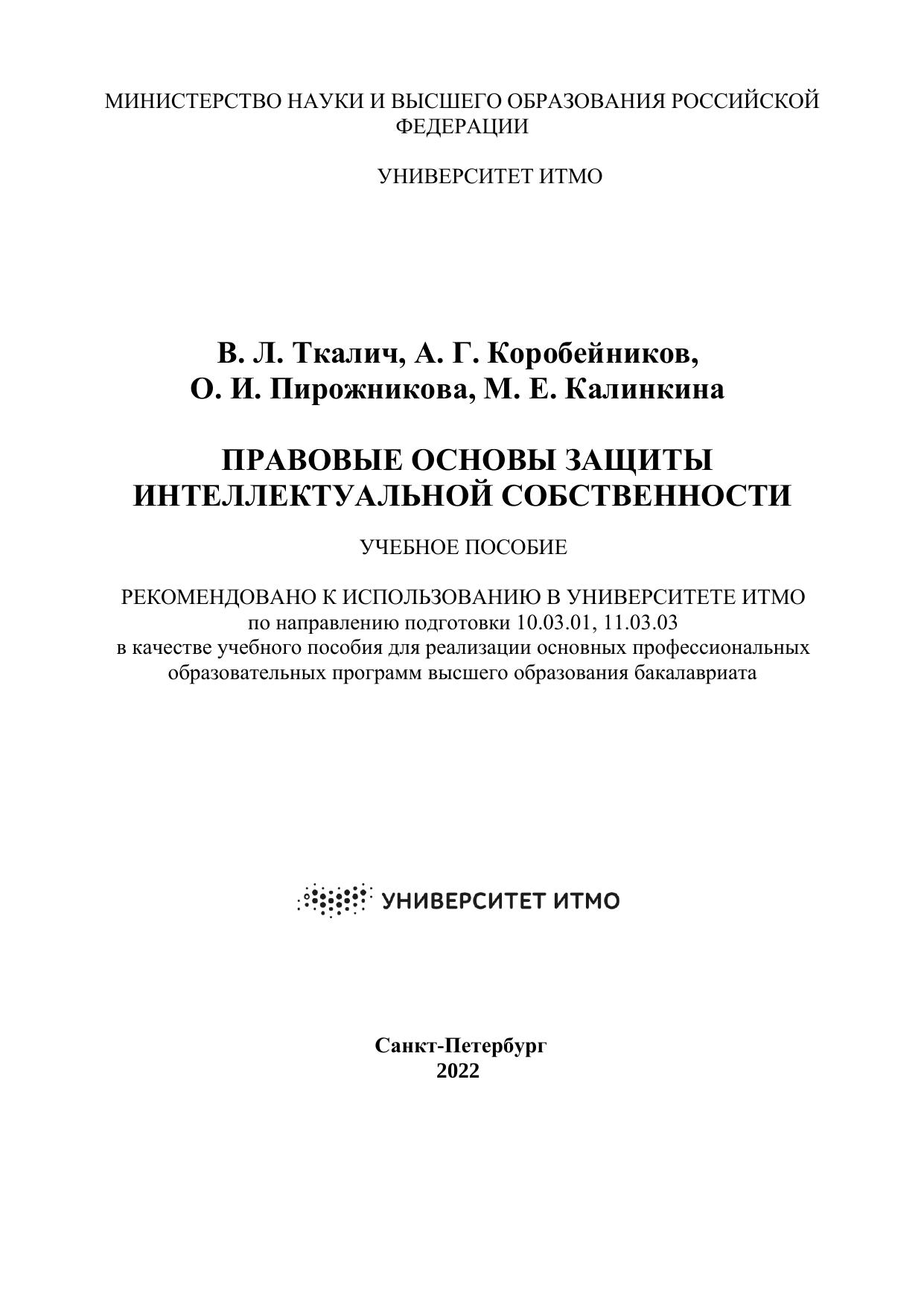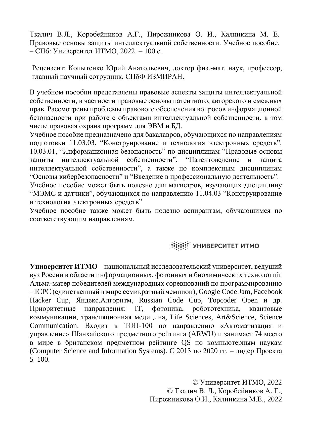Учебное пособие предназначено для бакалавров, обучающихся по направлениям подготовки 11.03.03, “Конструирование и технология электронных средств”, 10.03.01, “Информационная безопасность” по дисциплинам “Правовые основы защиты интеллектуальной собственности”, “Патентоведение и защита интеллектуальной собственности”, а также по комплексным дисциплинам “Основы кибербезопасности” и “Введение в профессиональную деятельность”.