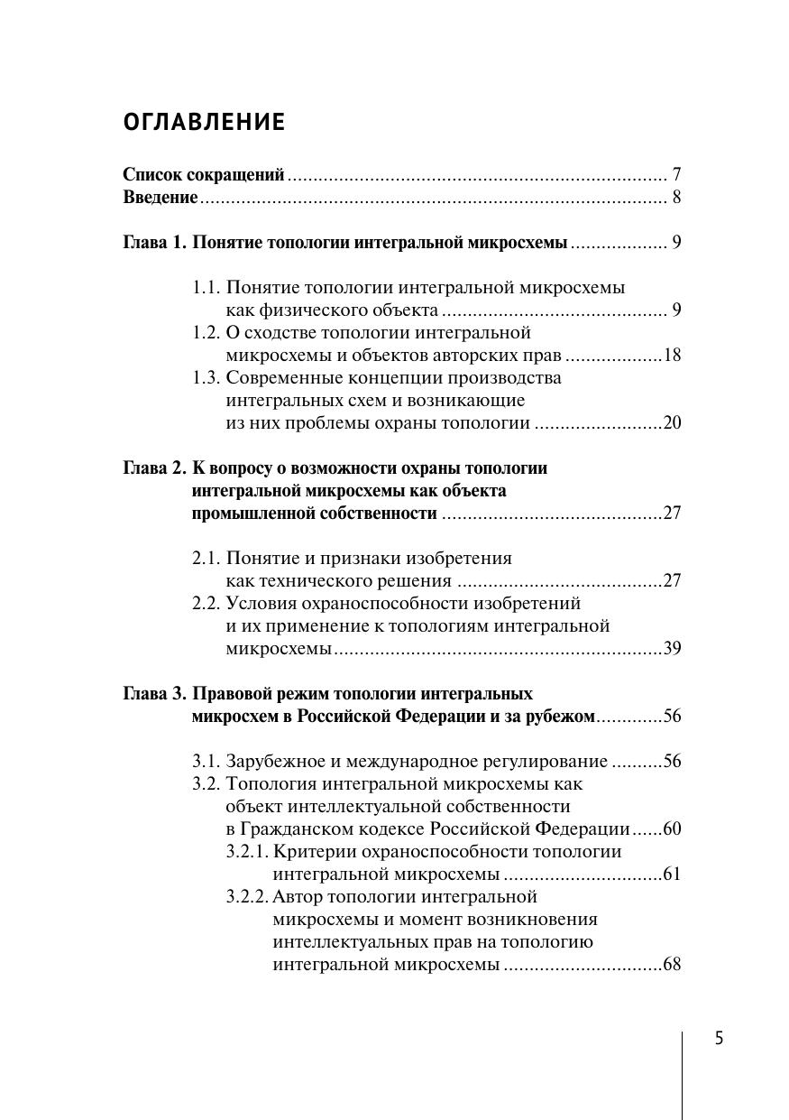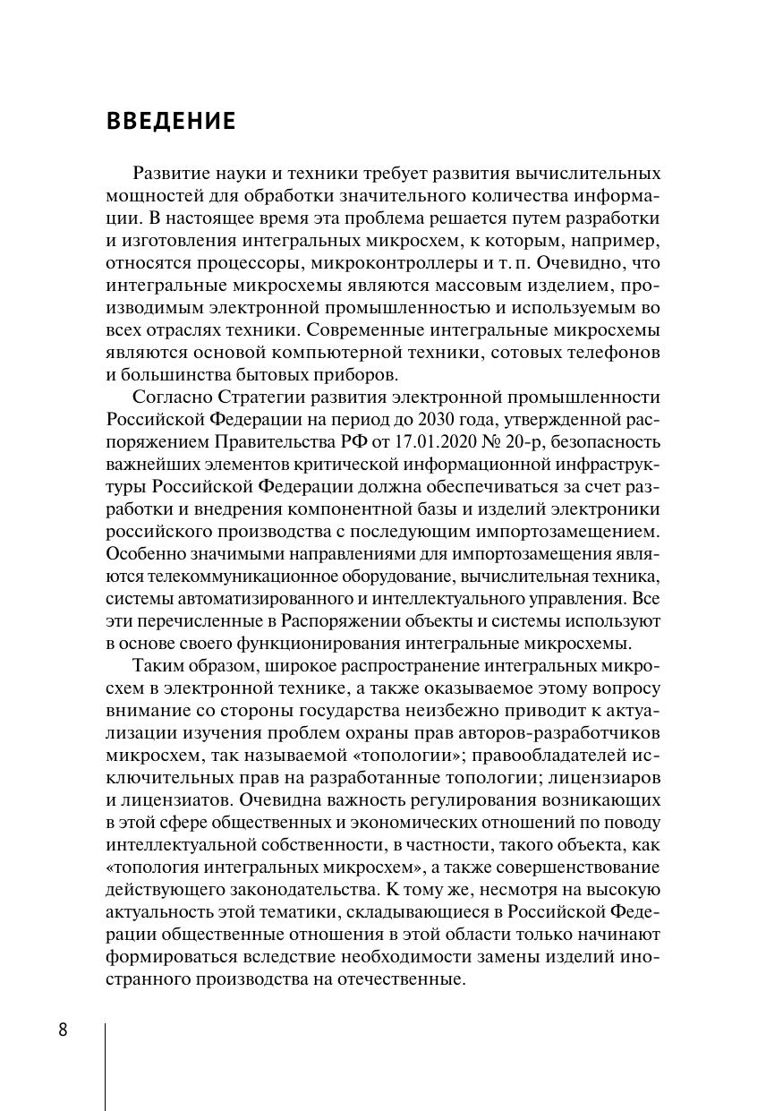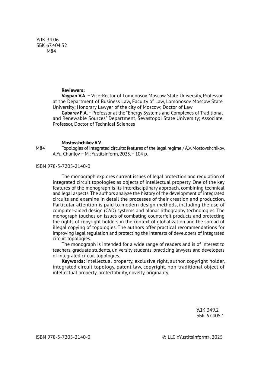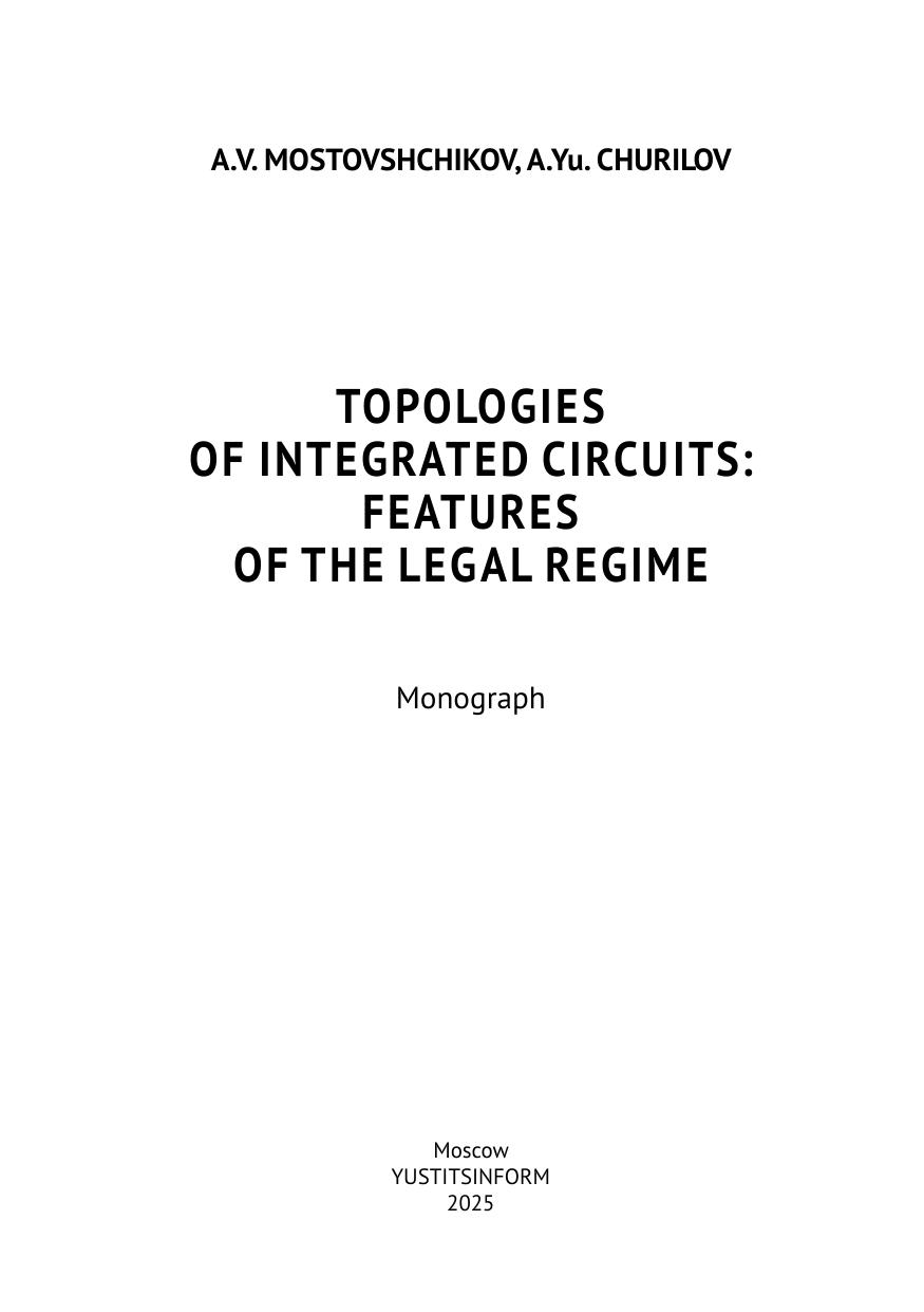 Монография исследует актуальные вопросы правовой охраны и регулирования топологий интегральных микросхем как объектов интеллектуальной собственности. Одной из ключевых особенностей монографии является междисциплинарный подход, объединяющий технические и правовые аспекты. Авторы анализируют историю развития интегральных микросхем и подробно рассматривают процессы их создания и производства. Особое внимание уделяется современным методам проектирования, включая использование систем автоматизированного проектирования (САПР) и технологий планарной литографии. Монография затрагивает вопросы противодействия контрафактной продукции и защиты прав правообладателей в условиях глобализации и распространения незаконного копирования топологий. Авторы предлагают практические рекомендации по улучшению правового регулирования и защите интересов разработчиков топологий интегральных микросхем. Монография рассчитана на широкий круг читателей и представляет интерес для преподавателей, аспирантов, студентов вузов, практикующих юристов и разработчиков топологий интегральных микросхем.
