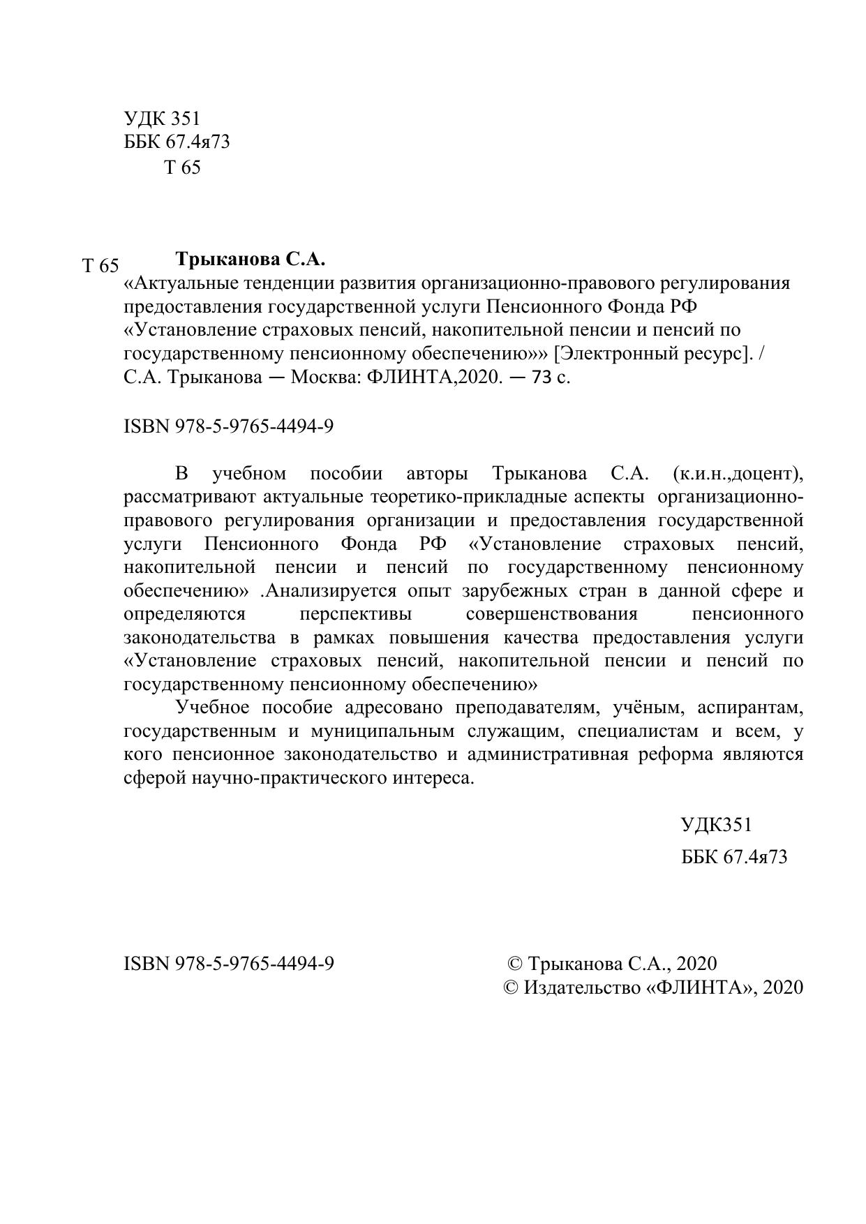 В учебном пособии авторы Трыканова С.А. (к.и.н.,доцент), рассматривают актуальные теоретико-прикладные аспекты организационно-правового регулирования организации и предоставления государственной услуги Пенсионного Фонда РФ «Установление страховых пенсий, накопительной пенсии и пенсий по государственному пенсионному обеспечению» .Анализируется опыт зарубежных стран в данной сфере и определяются перспективы совершенствования пенсионного законодательства в рамках повышения качества предоставления услуги «Установление страховых пенсий, накопительной пенсии и пенсий по государственному пенсионному обеспечению». Учебное пособие адресовано преподавателям, учёным, аспирантам, государственным и муниципальным служащим, специалистам и всем, у кого пенсионное законодательство и административная реформа являются сферой научно-практического интереса.